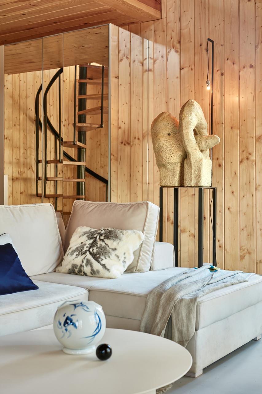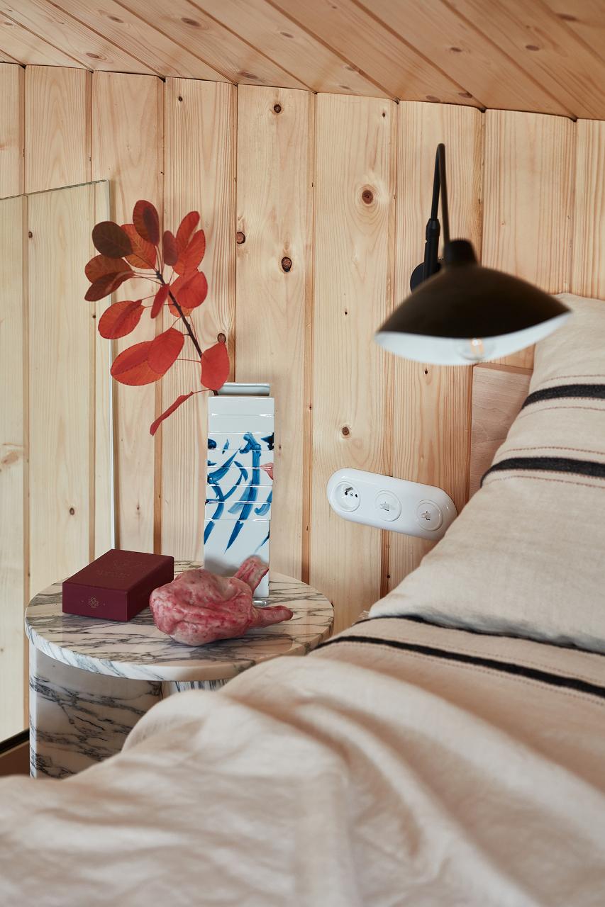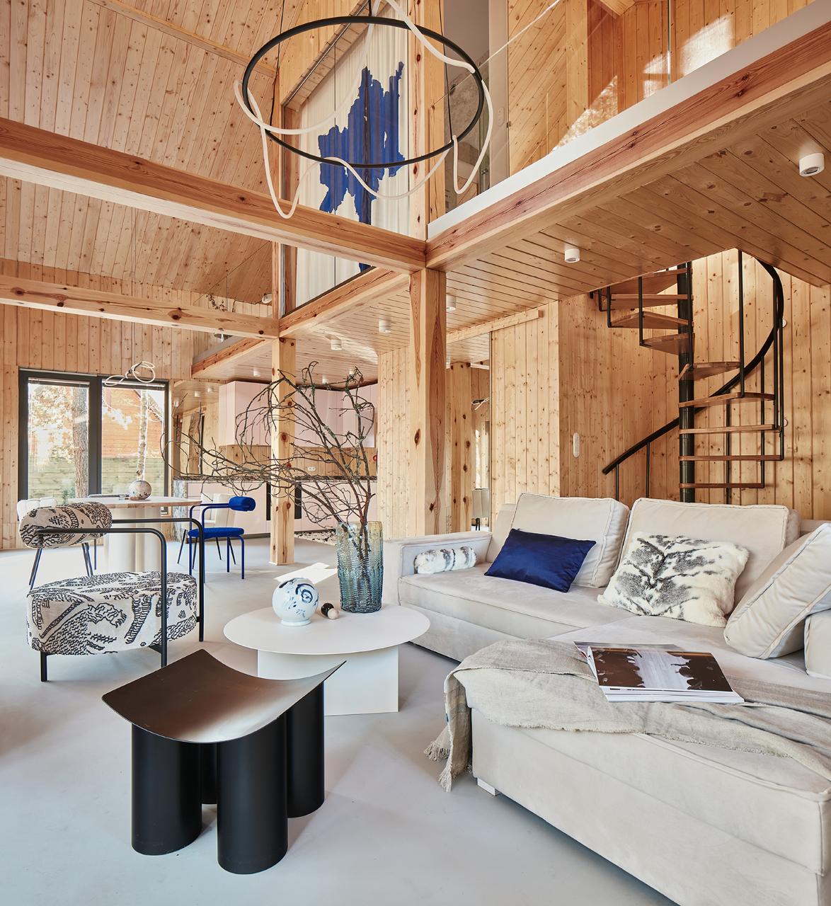 Wnętrze Hawrot Home jest kolorystycznym rewersem zewnętrza. Ściany wyłożone surowym drewnem, spokojna paleta kolorystyczna, w której dominuje złamana biel i pudrowy róż, budują spokojną bazę dla głównych bohaterów – sztuki i wzornictwa. Mieszkańcy domu mogą obcować z kunsztownymi porcelanowymi obiektami Wojciecha Ireneusza Sobczyka, czy monumentalnymi rzeźbami Angeliki Markul, artystów reprezentowanych przez warszawską galerię LETO. Chciałam wyjąć sztukę z oficjalnej, galeryjnej, white cube’owej sytuacji i włożyć w ekstremalnie nieformalną, intymną, dziką. Prace rezonują zupełnie inaczej, szybciej, a dzięki temu, że są na wyciągnięcie dłoni, każdy z gości może poczuć, ile rzeczywiście wnoszą do naszego życia. Kooperantów zaproszonych do Hawrot Home jest znaczniej więcej. Znajdziemy w nim charakterystyczne meble z manufaktury The Good Living, listwowe oświetlenie Lexavala, totemiczne lampy Michała Korchowca, szkło Agnieszki Bar, ceramikę Malwiny Konopackiej, porcelanowe wazony mistrzyni kaligrafii Biho Asai, tkaniny ze studia REST, Nomad czy NAP Back to Craft. W wielu projektach (podstawie stolika kawowego, wazonów), nieprzypadkowo powtarza się motyw kuli. Jest on także graficznym symbolem tego miejsca. Bo na Hawrot Home można spojrzeć jak na dzieło totalne i domholistyczny. Planuję otwierać go dla szerokiej publiczności, artystów-rezydentów, zapraszać twórców do realizacji commissions – zapowiada właścicielka. Od początku tej przygody towarzyszy mi filozofia ikigai mówiąca o łączeniu pasji i misji. Mój kosmos przeniosłam tutaj, do lasu i zamierzam się nim dzielić.