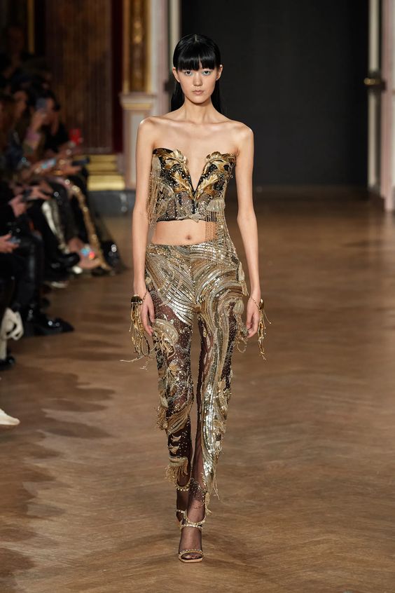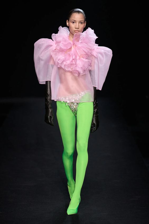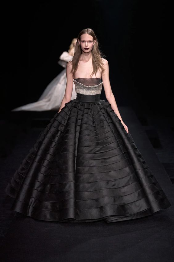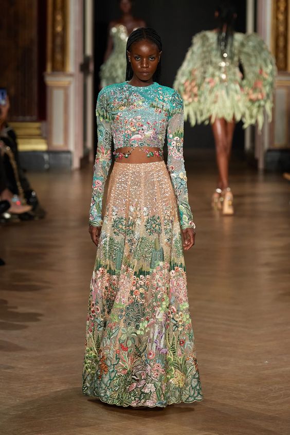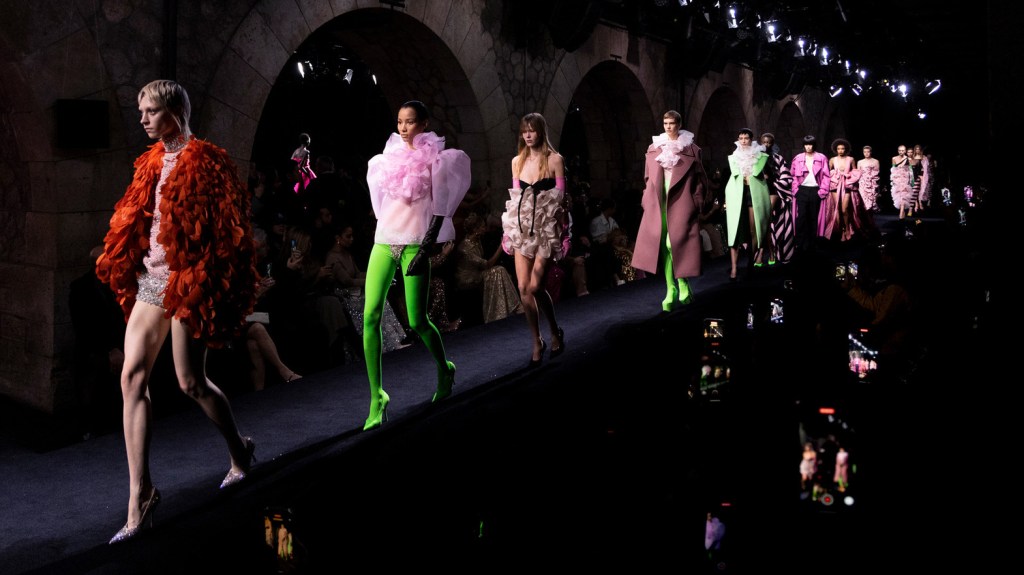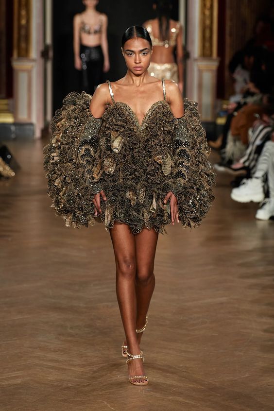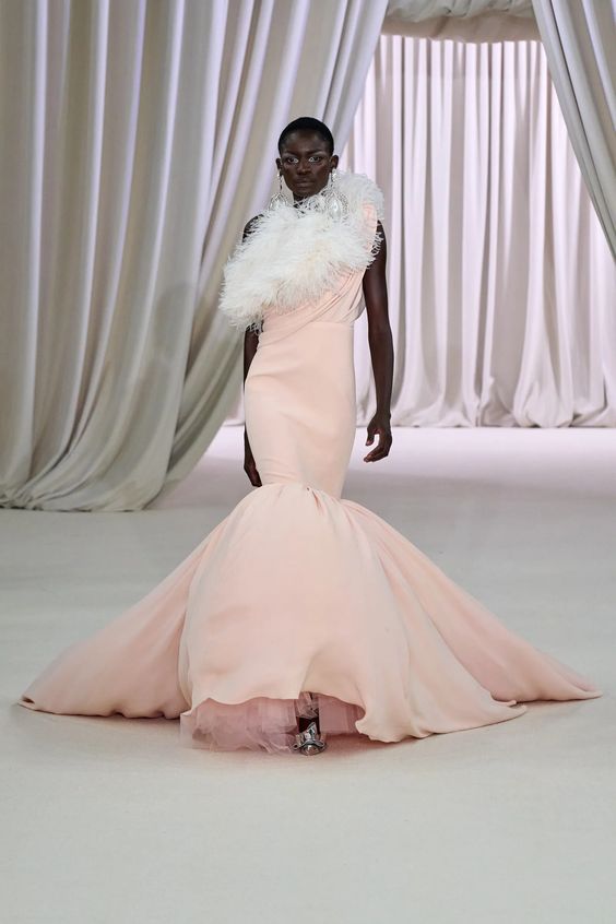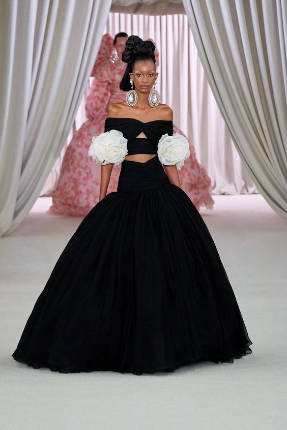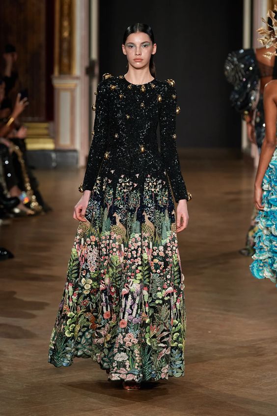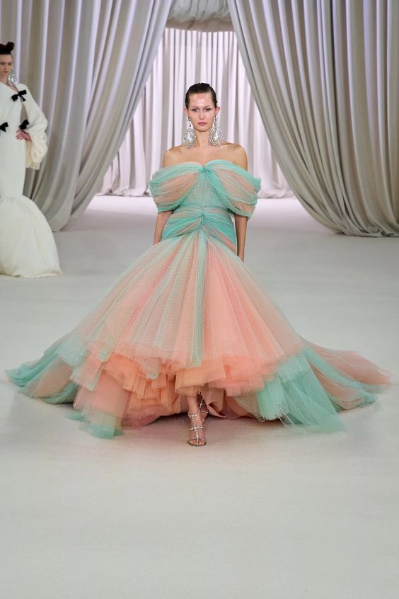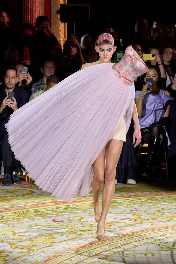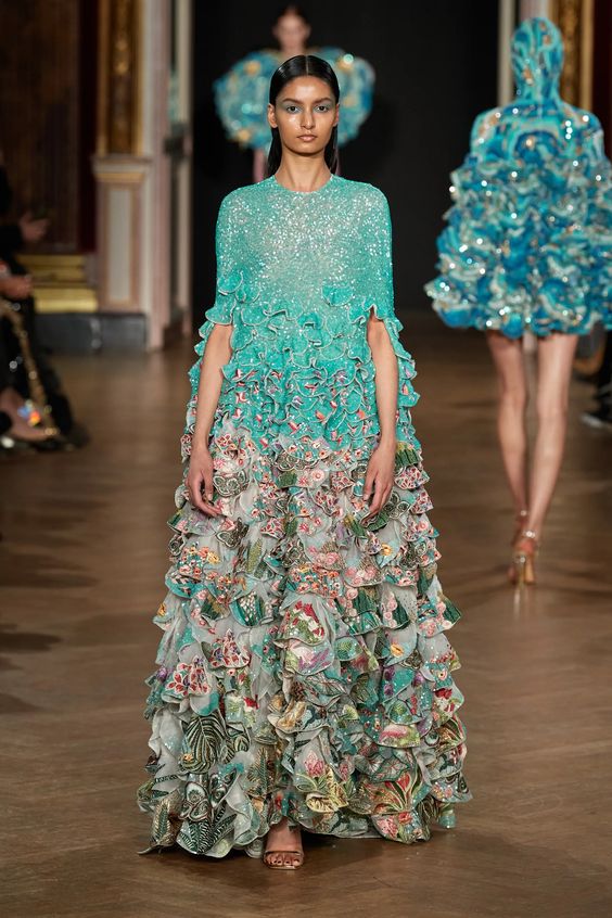 Tworzący we Francji włoski projektant mody zapisał się w pamięci jako twórca spektakularnych, kaskadowych kreacji złożonych z warstw tiulu, a także miłośnik kwiatowych motywów. Suknie przypominające stroje księżniczek z XIX-wiecznych obrazów, zawojowały czerwone dywany za sprawą gwiazd i influencerek. W tym sezonie projektant odchodzi nieco od tiulu, ustępując miejsca fantazyjnym drapowaniom i bufkom. Imponujące objętości rękawów i spódnic oraz mistrzowskie formy zahaczające o inspiracje ubiorem historycznym, w połączeniu ze współczesnym spojrzeniem na Haute Couture tworzą niezwykle radosną i dziewczęcą mieszankę.