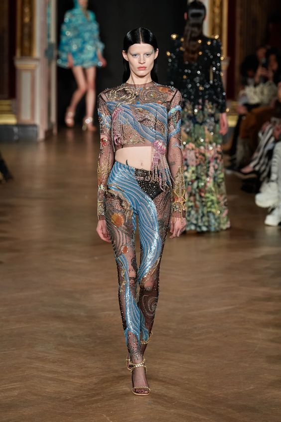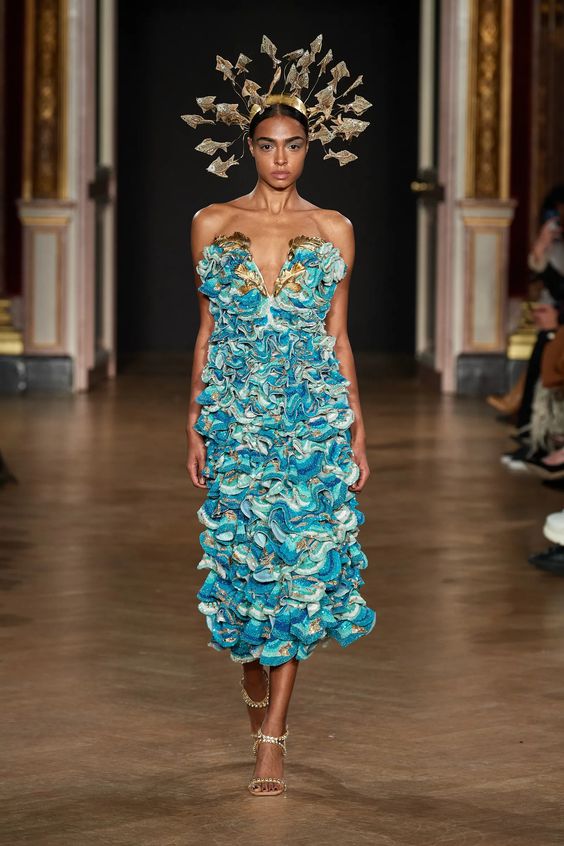 Na misternie haftowanych i wyszywanych kreacjach pojawiają się wzory przedstawiające podwodny świat: meduzy, rozgwiazdy, rafy koralowe, połyskujące rybki oraz bujną roślinność. Precyzyjne drapowania na sukienkach imitują grzywy wzburzonych fal. Złota korona z bliska ujawnia detale – promienie to w rzeczywistości rozpierzchające się we wszystkich kierunkach złote rybki. Kuliste hafty na czarnych jak niebo w środku nocy rękawach przedstawiają z kolei orbity i krążące wokół nich planety, a na pelerynie skrzą się gwiazdozbiory. Pomiędzy sylwetkami o klasycznych fasonach pojawiają się takie elementy, jak catsuit, czyli dopasowany kombinezon, krótkie stanikowe topy z legginsami czy wariacja na temat naked dress, oczywiście wszystko pokryte tradycyjnymi, ręcznie wykonanymi haftami. Jednak najbardziej spektakularna kreacja to ta finałowa, przedstawiająca suknię-meduzę w formie ogromnej bombki, wyglądającej jak przed chwilą wyłowiona z morza.