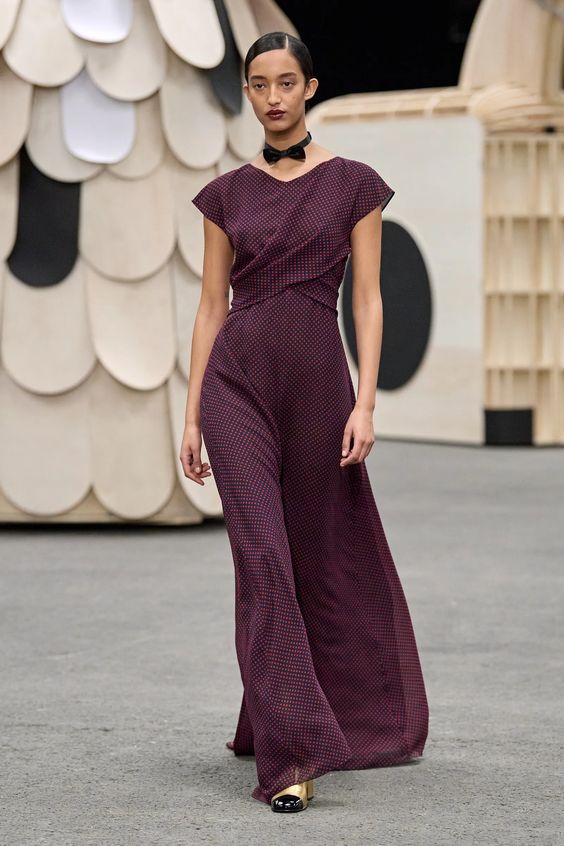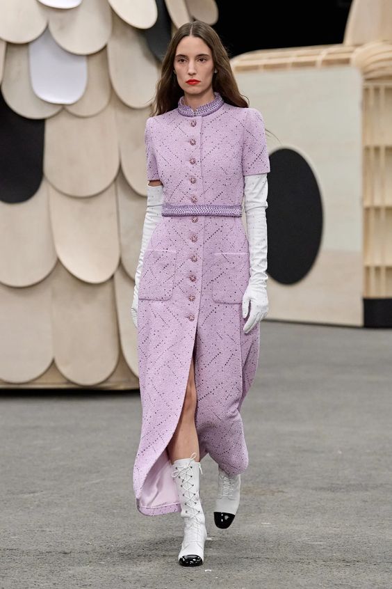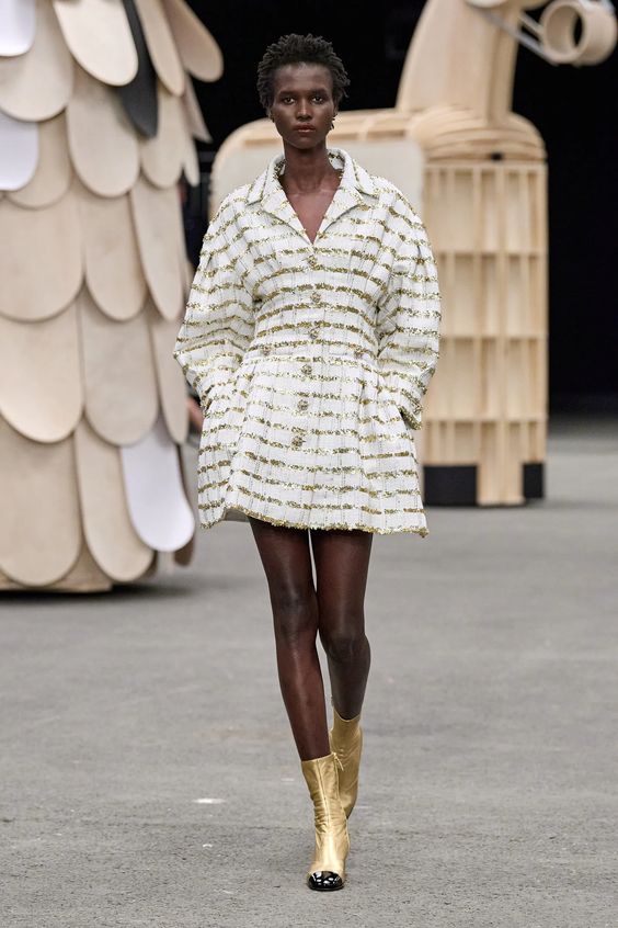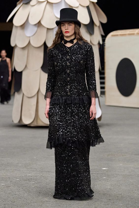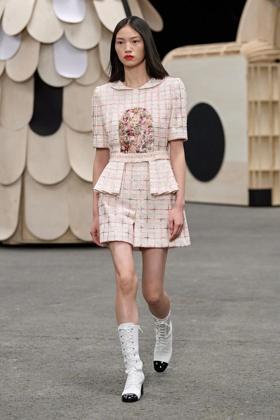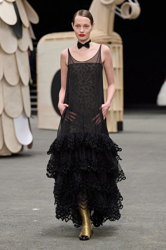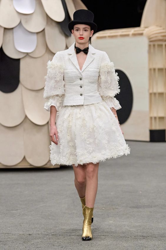 Poza tym sama kolekcja obrała kierunek najpopularniejszej obecnie estetyki y2k, oczywiście w eleganckim wydaniu spod znaku Chanel. Nieśmiertelne tweedowe komplety tym razem przybrały formę trapezowych płaszczyków, krótkich i dopasowanych marynarek oraz rozkloszowanych lub plisowanych spódniczek mini. Choć sama Gabriele Chanel nie znosiła tej długości, Viard – podobnie jak przed nią Karl – idzie z duchem czasu i adaptuje spuściznę marki do współczesnych realiów. Pojawiły się także długie do kostek sukienki-płaszcze, motywy kwiatowe – zarówno w formie nadruków, jak i haftótw czy aplikacji, z których słyną pracujący dla domu mody rzemieślnicy; ale również inspiracje latami 20.: sukienki bieliźniane o obniżonej talii, przezroczystości czy elementy kojarzone z ówczesnym stylem kabaretowym: meloniki, skórzane rękawiczki, muchy czy sznurowane botki z charakterystycznym czarnym noskiem.