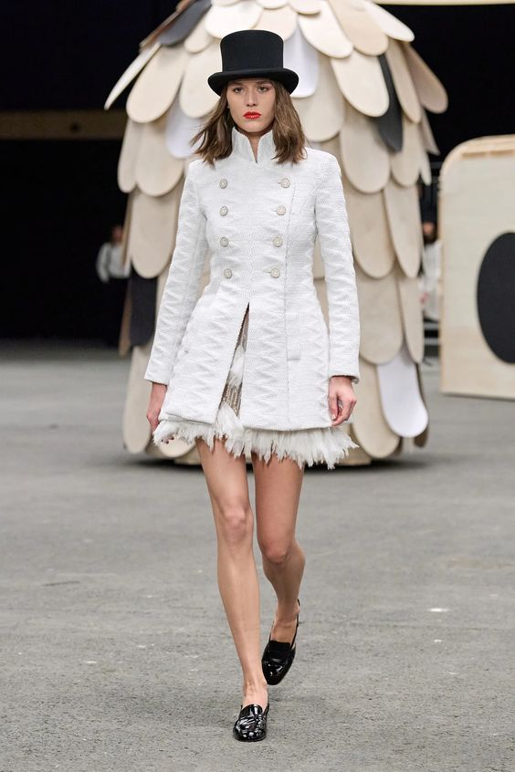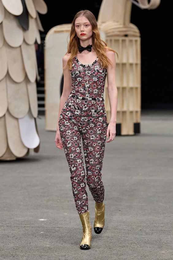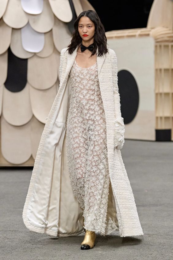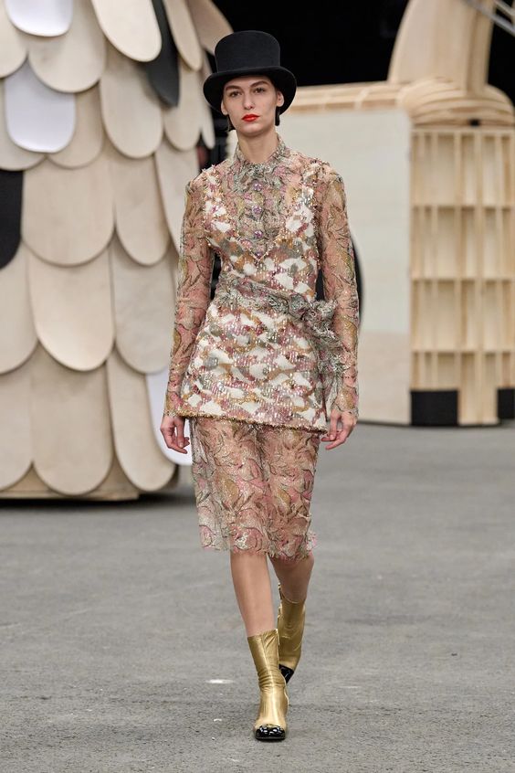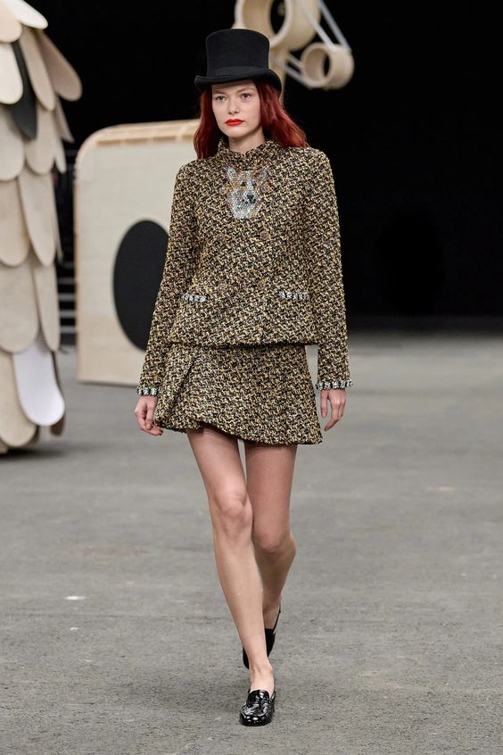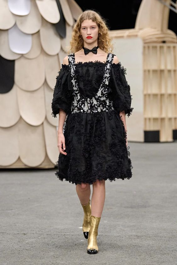 Poza tym sama kolekcja obrała kierunek najpopularniejszej obecnie estetyki y2k, oczywiście w eleganckim wydaniu spod znaku Chanel. Nieśmiertelne tweedowe komplety tym razem przybrały formę trapezowych płaszczyków, krótkich i dopasowanych marynarek oraz rozkloszowanych lub plisowanych spódniczek mini. Choć sama Gabriele Chanel nie znosiła tej długości, Viard – podobnie jak przed nią Karl – idzie z duchem czasu i adaptuje spuściznę marki do współczesnych realiów. Pojawiły się także długie do kostek sukienki-płaszcze, motywy kwiatowe – zarówno w formie nadruków, jak i haftótw czy aplikacji, z których słyną pracujący dla domu mody rzemieślnicy; ale również inspiracje latami 20.: sukienki bieliźniane o obniżonej talii, przezroczystości czy elementy kojarzone z ówczesnym stylem kabaretowym: meloniki, skórzane rękawiczki, muchy czy sznurowane botki z charakterystycznym czarnym noskiem.