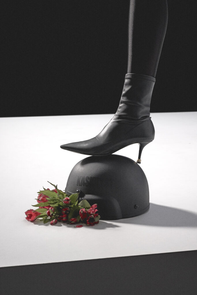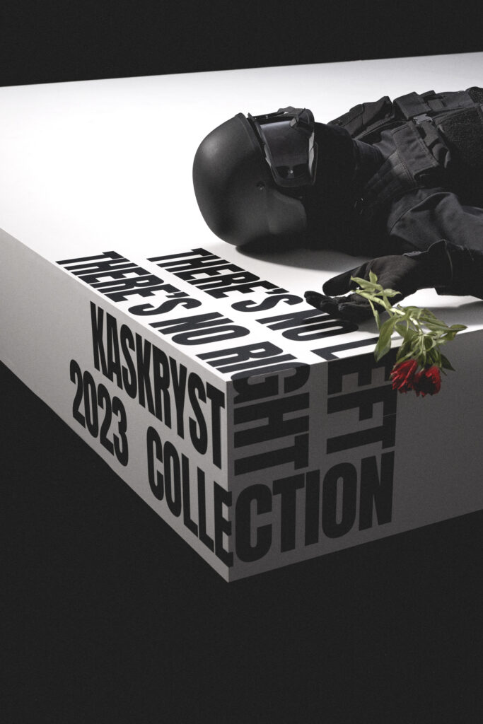 Kolekcja Kas Kryst „There’s no Left, There’s no Right” jest wielowymiarową metaforą współczesnych czasów. Można się w niej dopatrzeć nawiązań do wojny, niepokojów związanych z kryzysem ekonomicznym, protestów czy brutalności policji wobec kobiet. Jak przyznaje sama projektantka w rozmowie z Michałem Zaczyńskim, wszystkie te interpretacje mają w sobie ziarno prawdy.