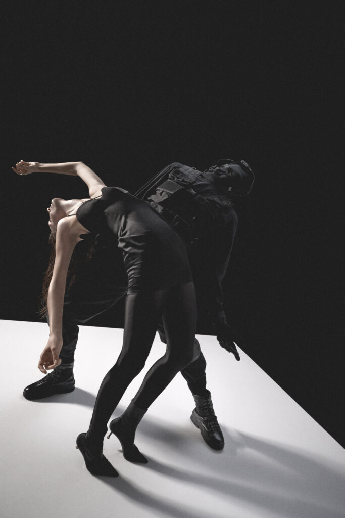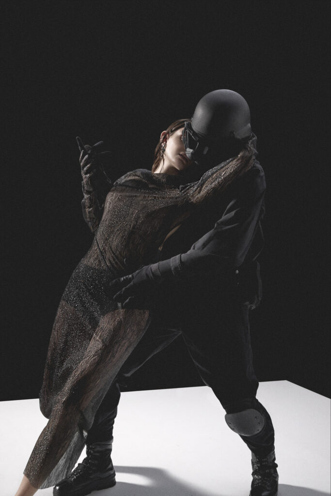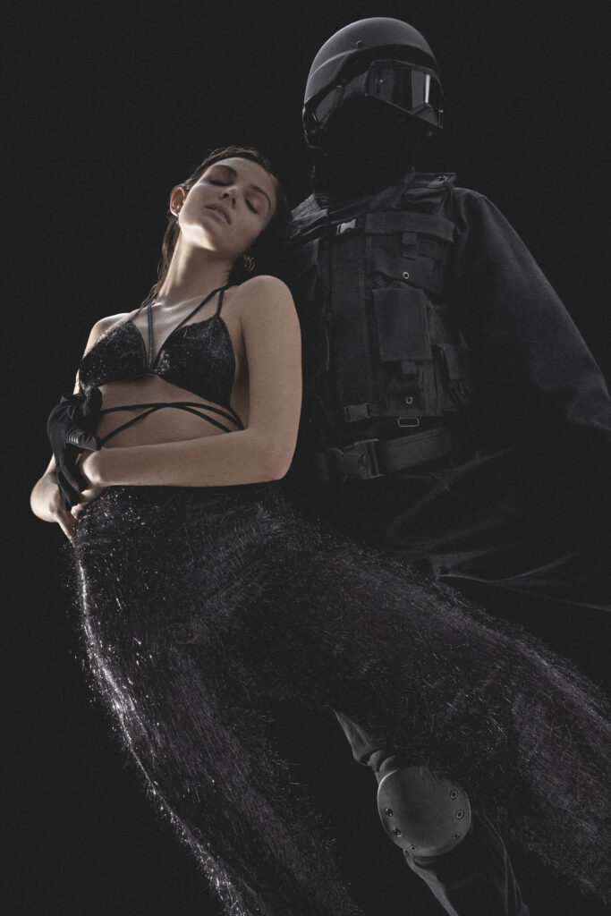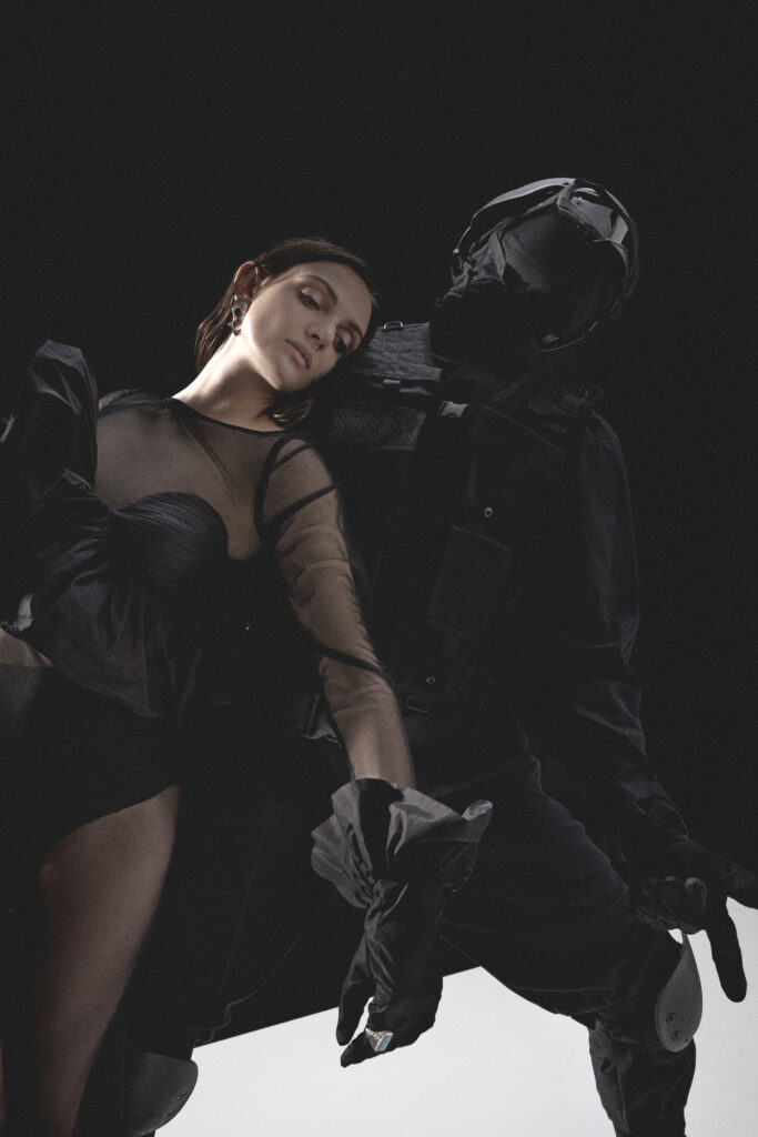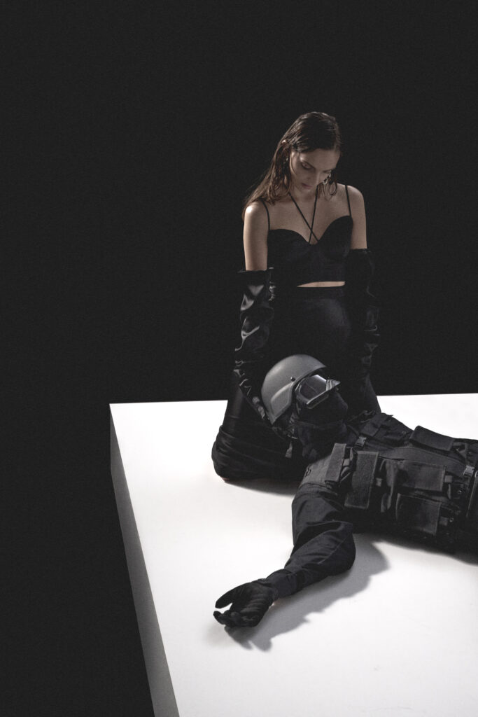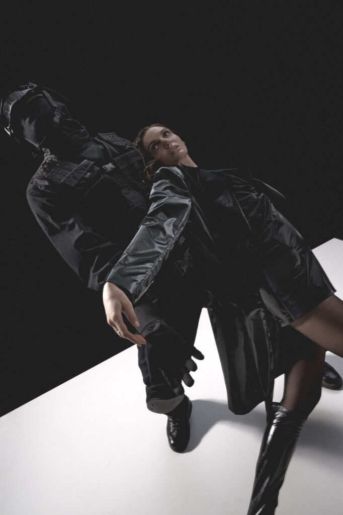 Jeśli chodzi o samą kolekcję, pełno tu odniesień do ulubionych elementów Kas Kryst: zabawy czernią i jej mnóstwem odcieni, kontrastów uzyskanych dzięki zastosowaniu tkanin o zróżnicowanych fakturach, połączenia streetwearu i tradycyjnego krawiectwa. Znalazły się tu kobiece sylwetki – sukienki z odkrytymi plecami, body z asymetrycznym dekoltem, gorsetowe topy, ale też i spodnie typu parachute pants i przeskalowane „męskie” fasony. Obok matowych tkanin pojawiły się przezroczystości, tkaniny metalizowane i z wyraźną trójwymiarową fakturą czy błyszczący lateks. Każda z nich inaczej pracuje w ruchu, inaczej odbija światło, dzięki czemu czerń staje się wielowymiarowa.