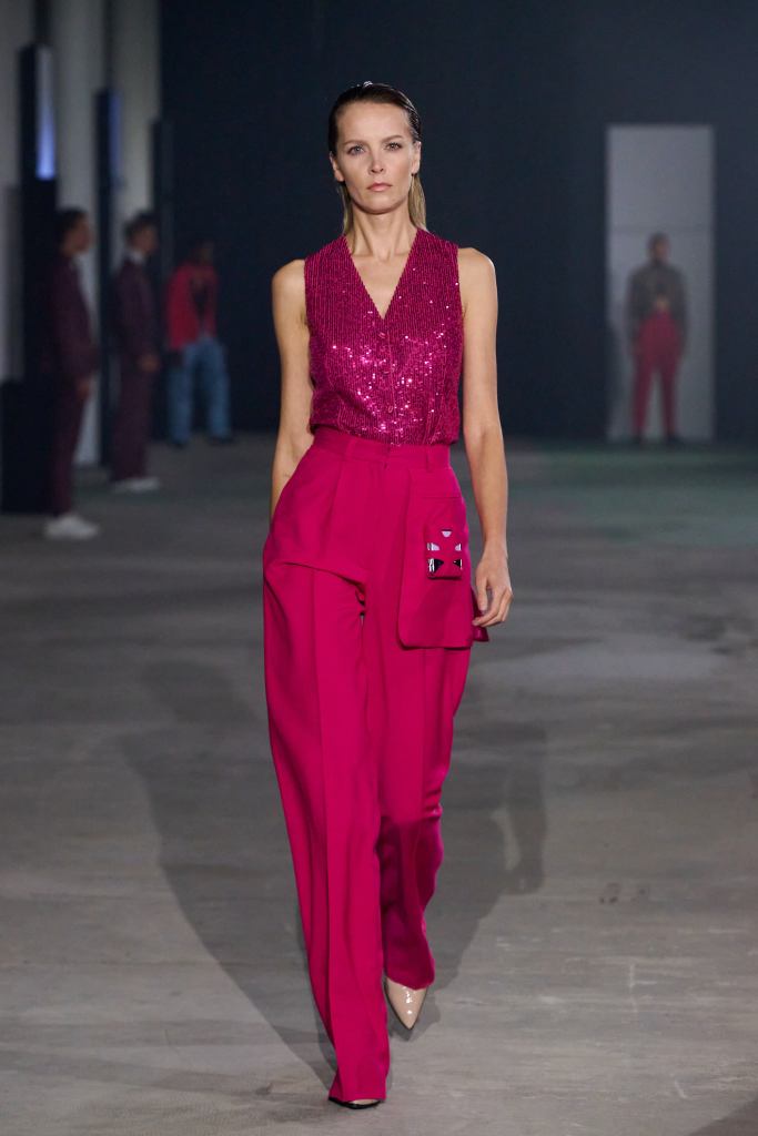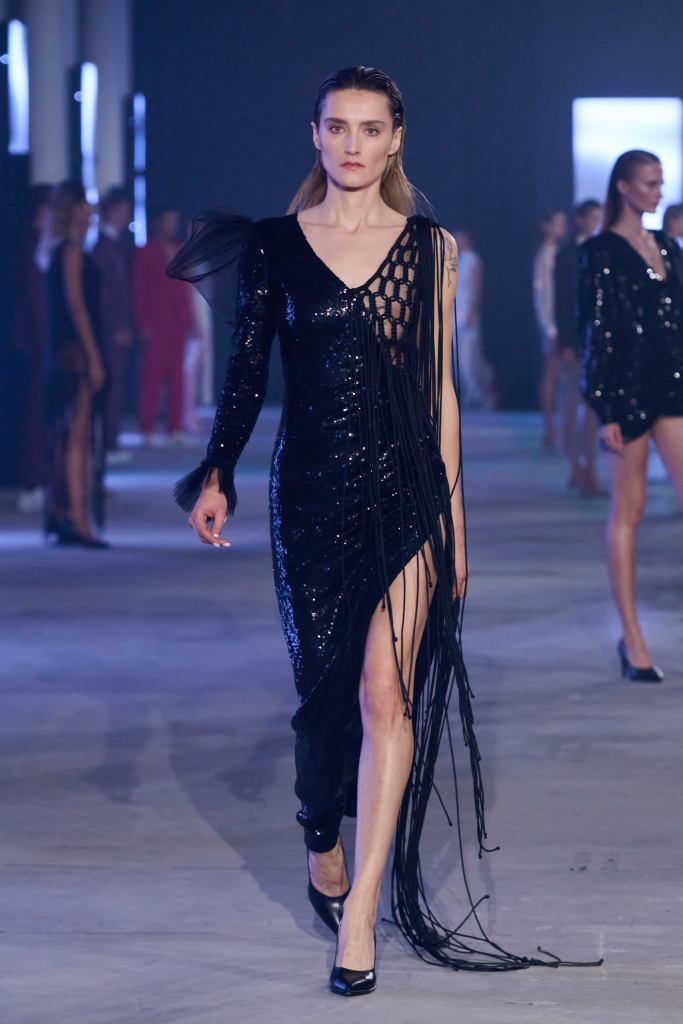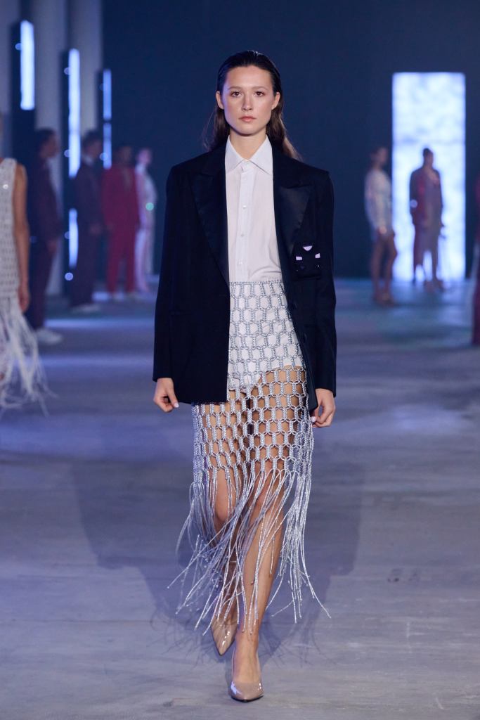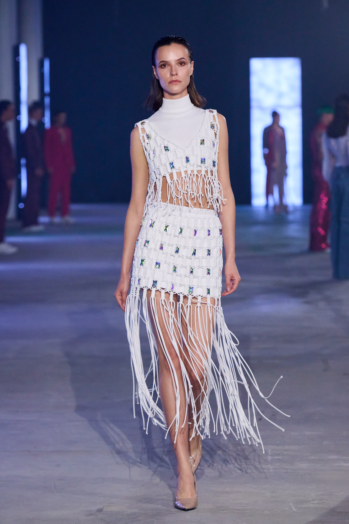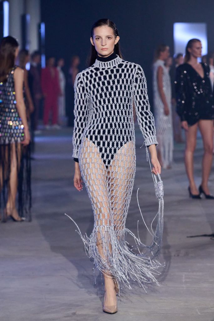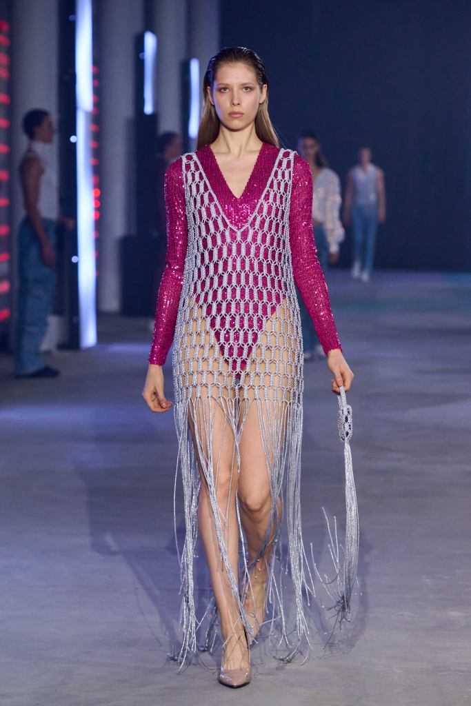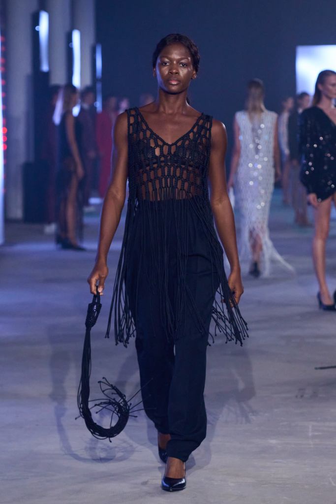 Na wieczór z kolei pojawiły się sukienki, topy i spódnice z plecionej siatki z długimi frędzlami, będące interesującą wariacją na temat naked dress, tutaj stylizowane na mnóstwo sposobów: jako suknia z body pod spodem lub warstwowo z golfem, koszulą czy też ze spodniami. W połączeniu z cekinami i mocnym kolorem tworzą efekt maksymalistycznego glamour rodem ze słynnego Studio 54.