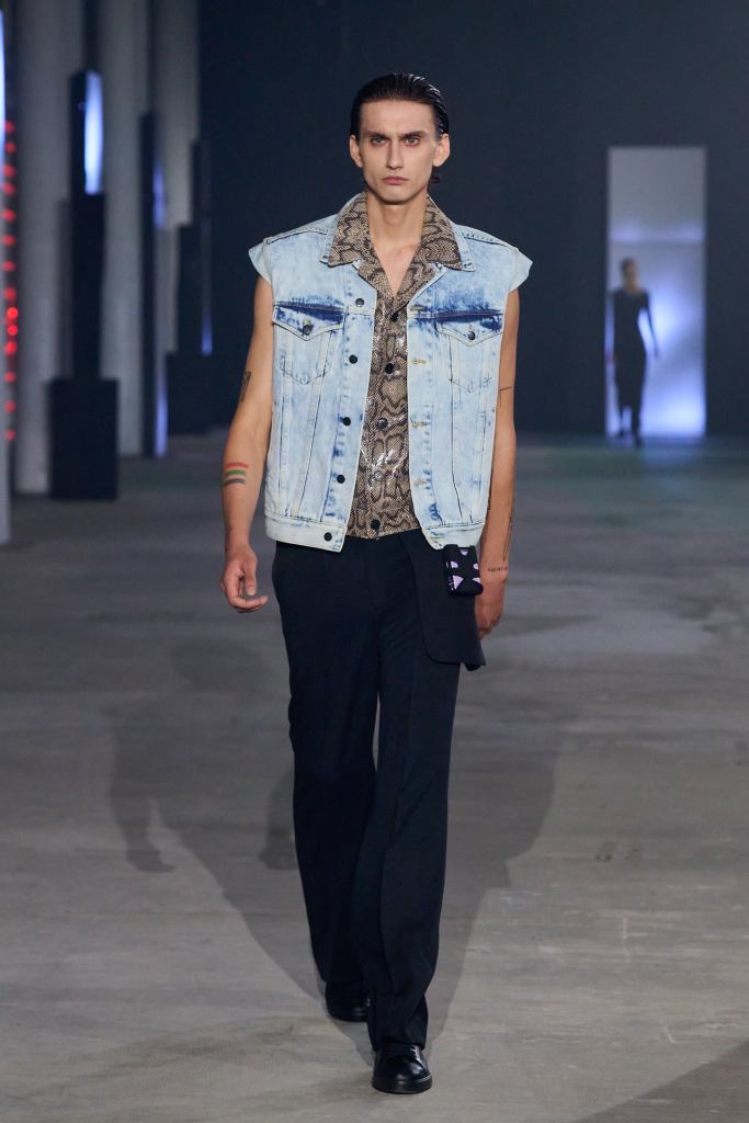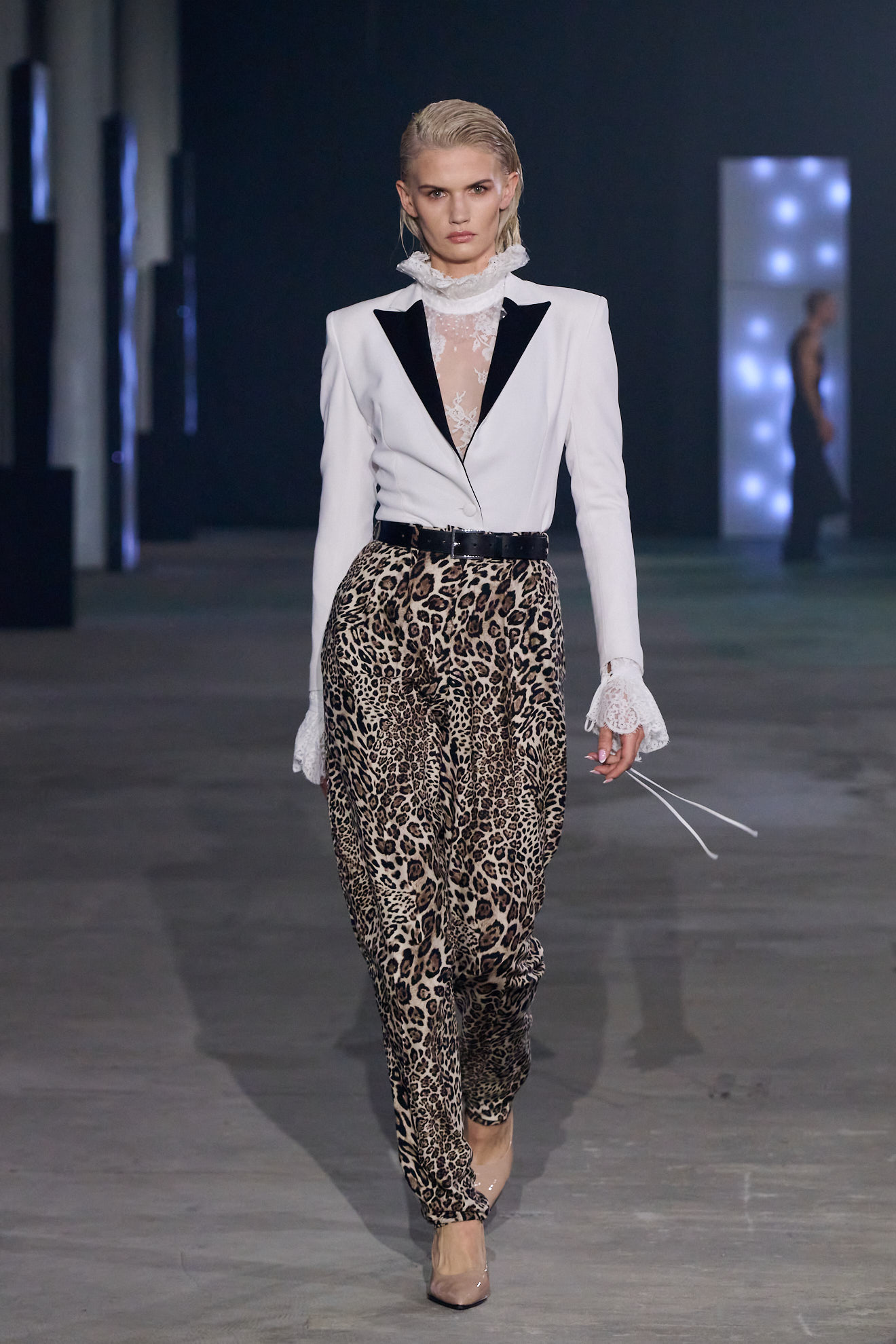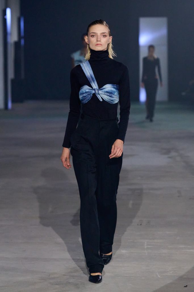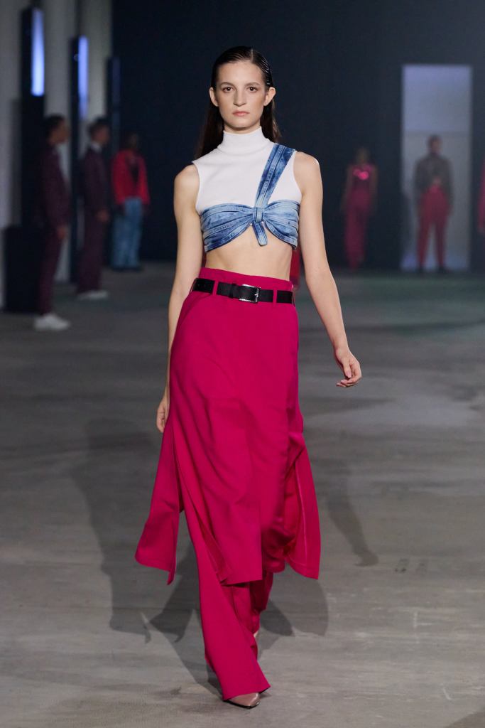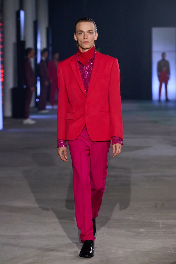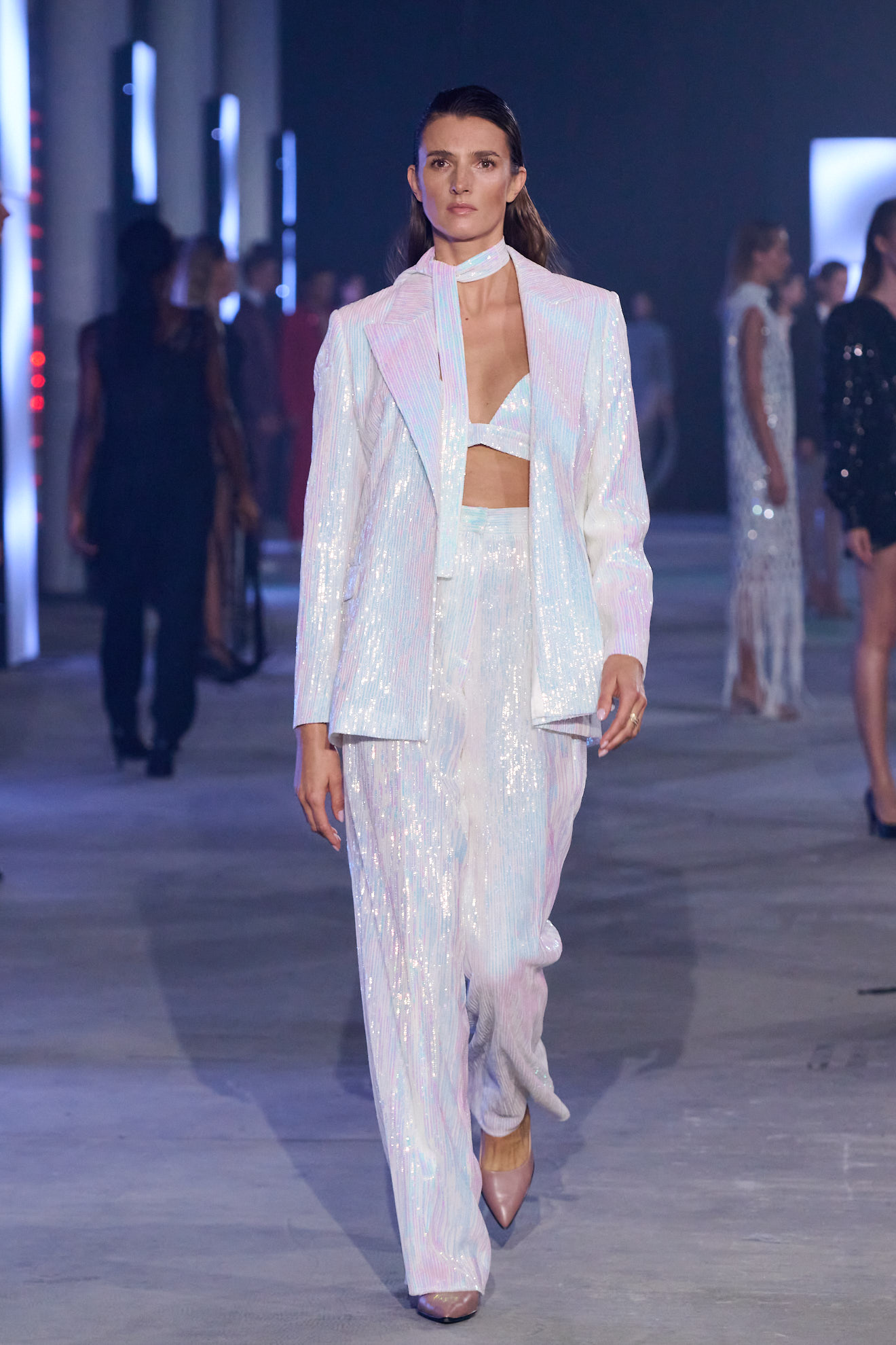 Na wieczór z kolei pojawiły się sukienki, topy i spódnice z plecionej siatki z długimi frędzlami, będące interesującą wariacją na temat naked dress, tutaj stylizowane na mnóstwo sposobów: jako suknia z body pod spodem lub warstwowo z golfem, koszulą czy też ze spodniami. W połączeniu z cekinami i mocnym kolorem tworzą efekt maksymalistycznego glamour rodem ze słynnego Studio 54.