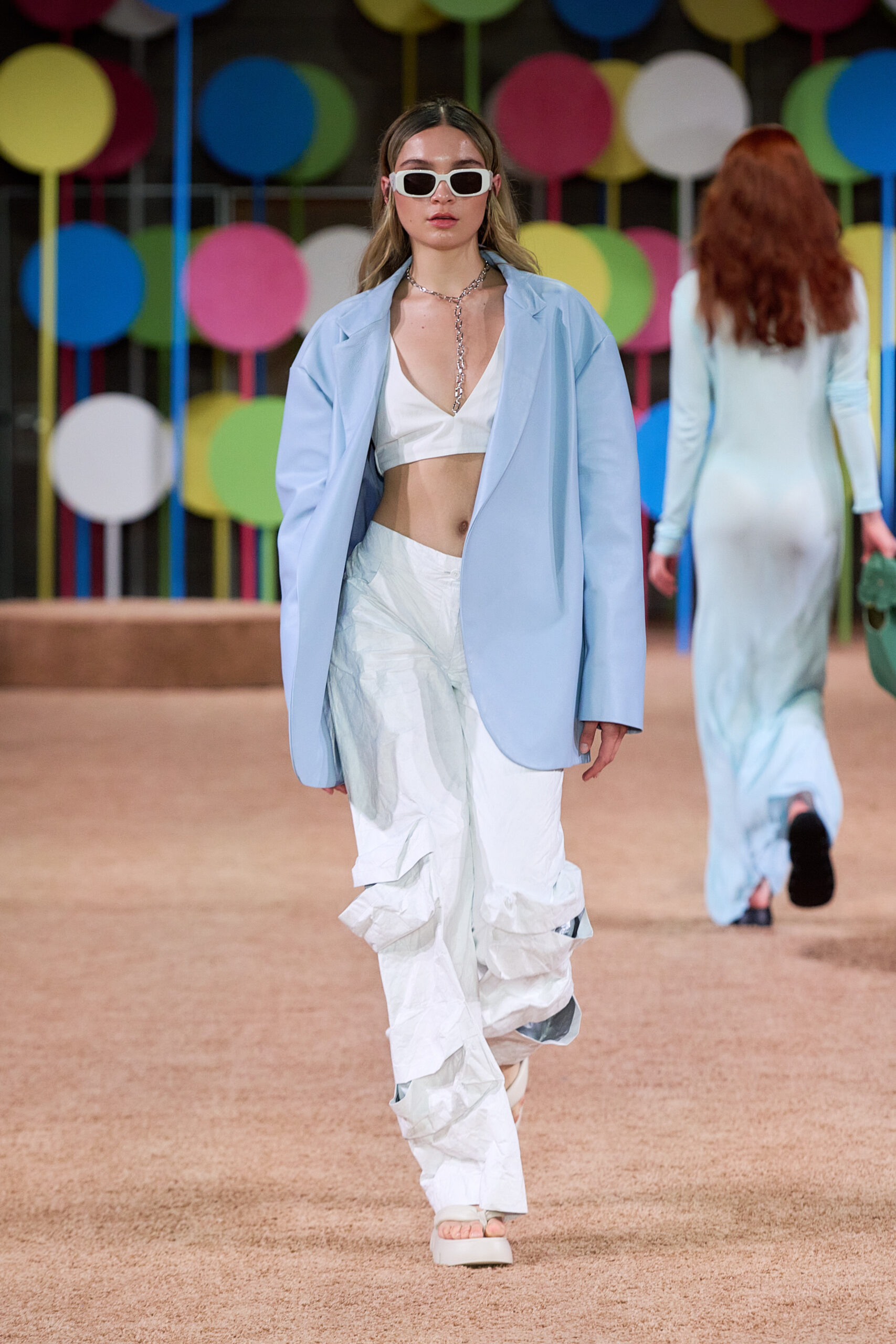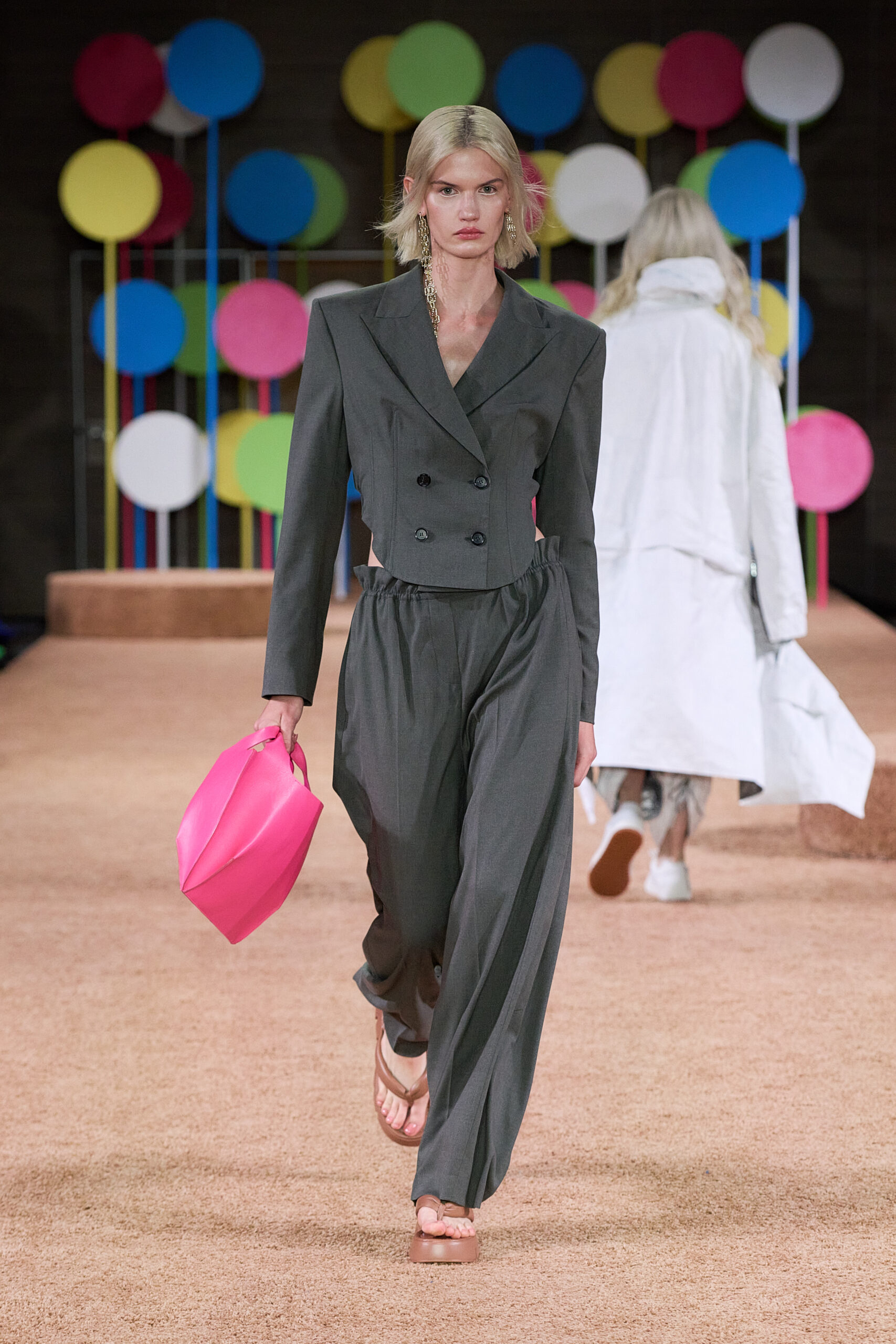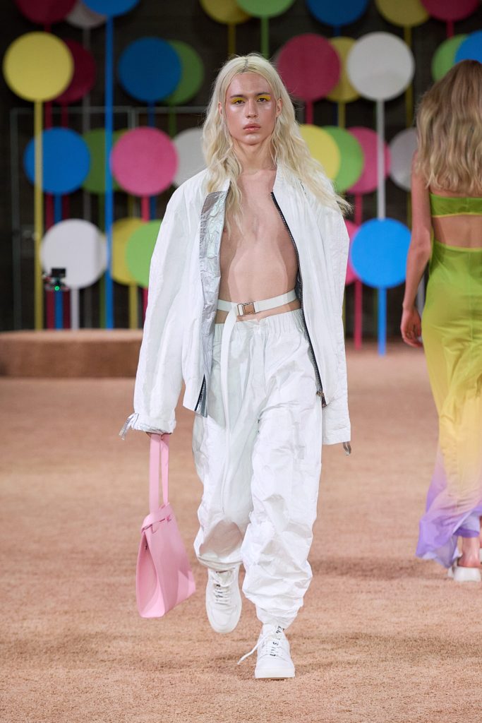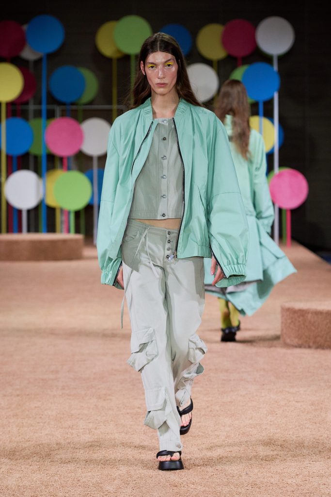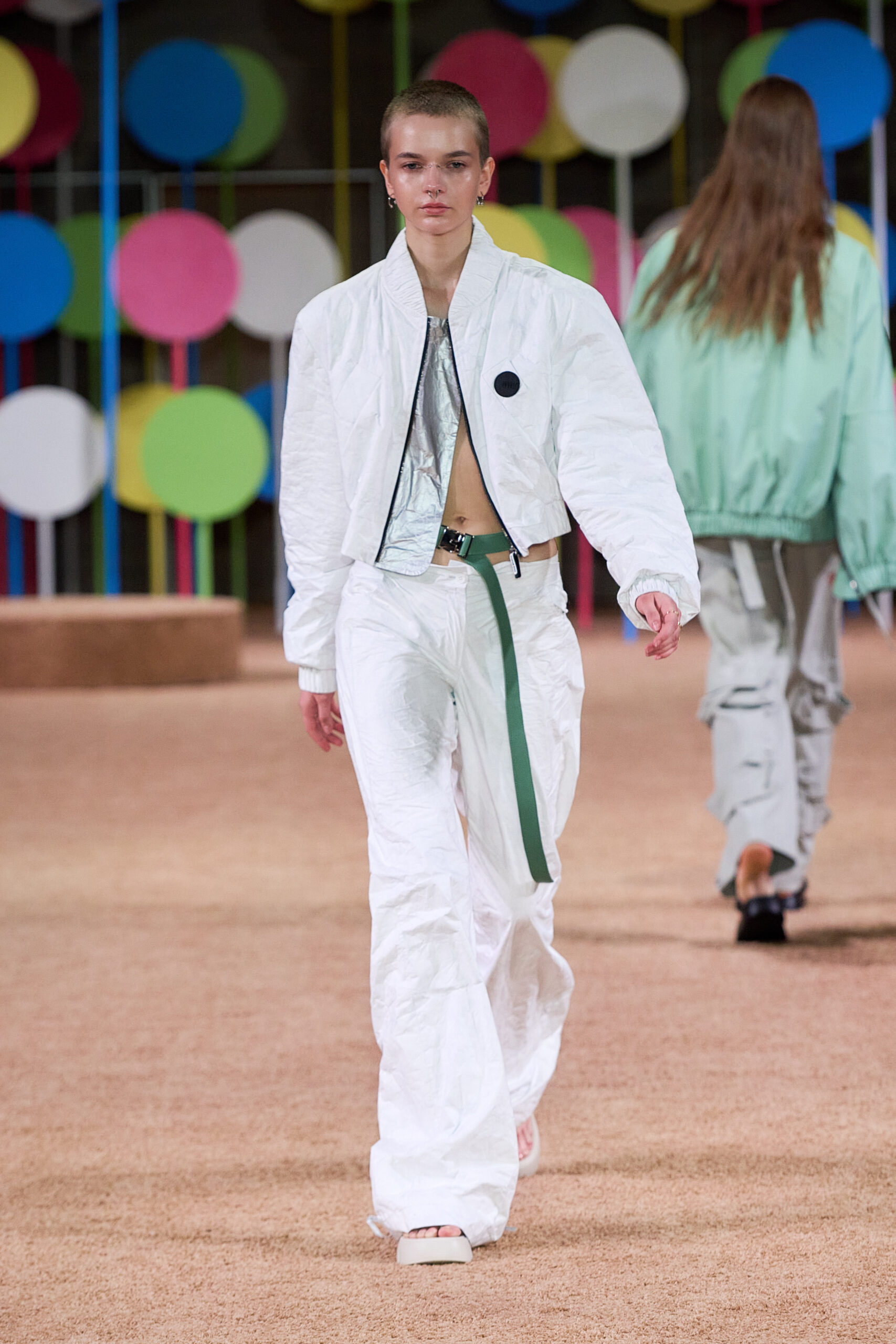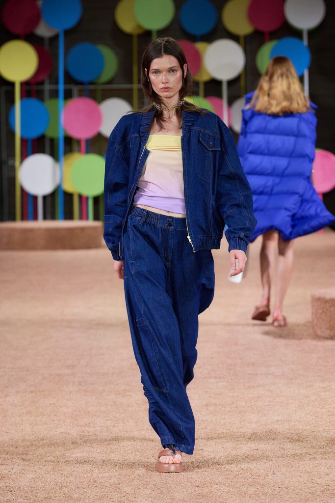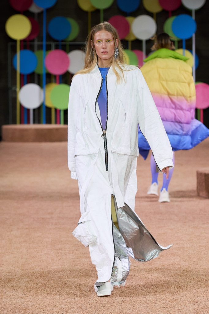 Przeskalowane sportowe kurtki z praktycznymi kieszeniami, puchowe pikowane kamizelki, spodnie cargo i kombinezony inspirowane odzieżą roboczą to elementy obecne w MMC od lat i odzwierciedlające miejski styl marki. Tym razem pojawiły się one w minimalistycznej bieli i rozbielonym turkusie. Wtórowały im dżinsowe komplety składające się z szerokich spodni i kurtek, krótkie marynarki oraz garniturowe spodnie, oczywiście wystylizowane w casualowy, nonszalancki sposób.