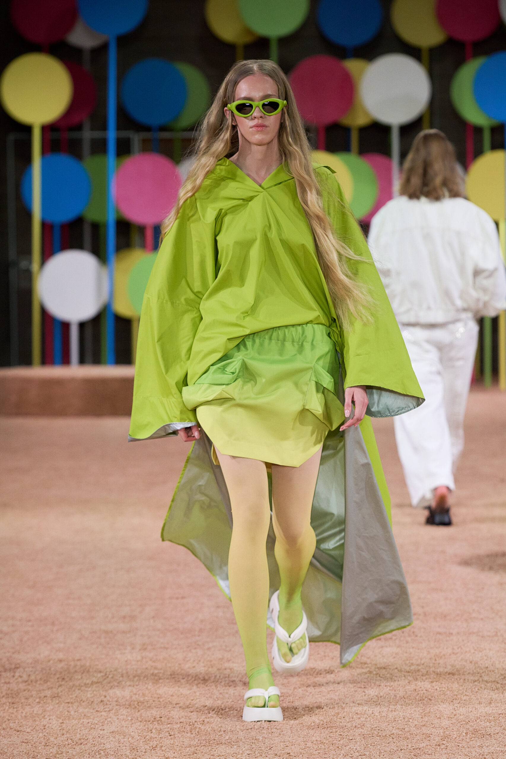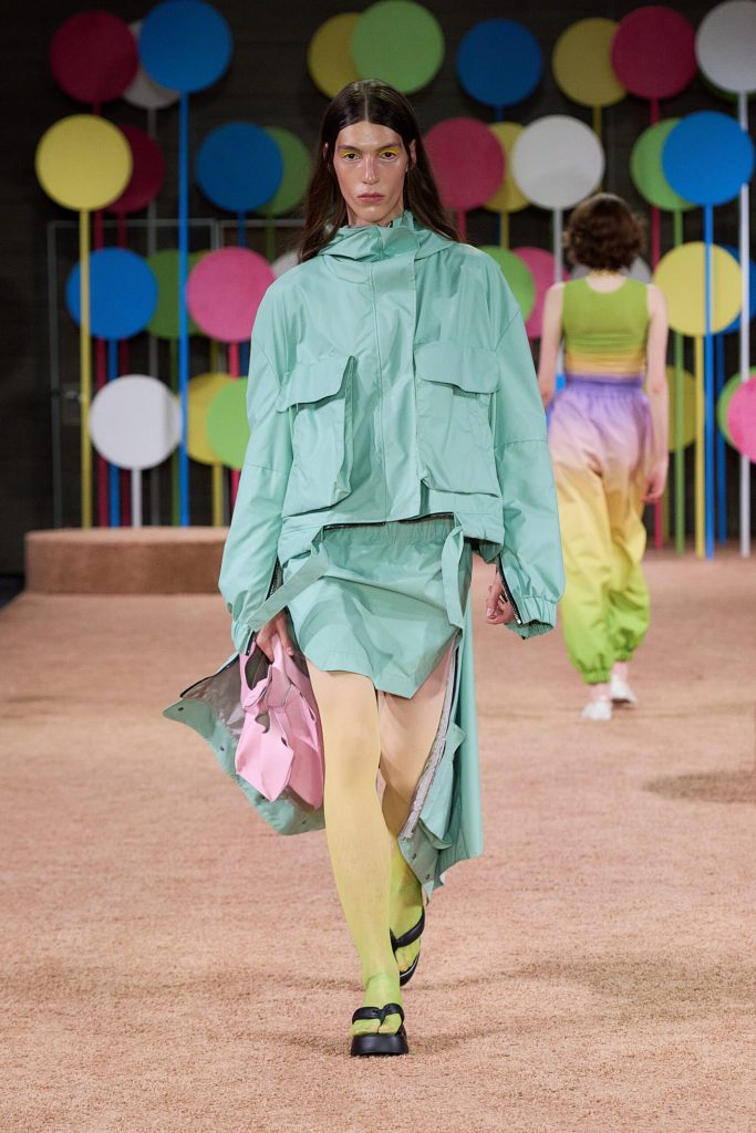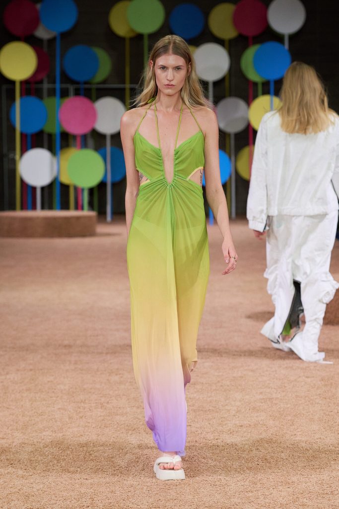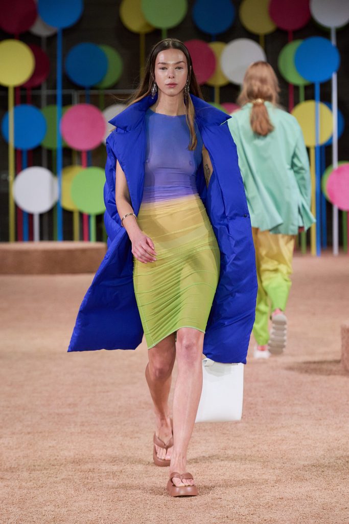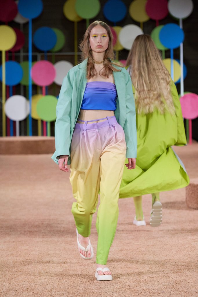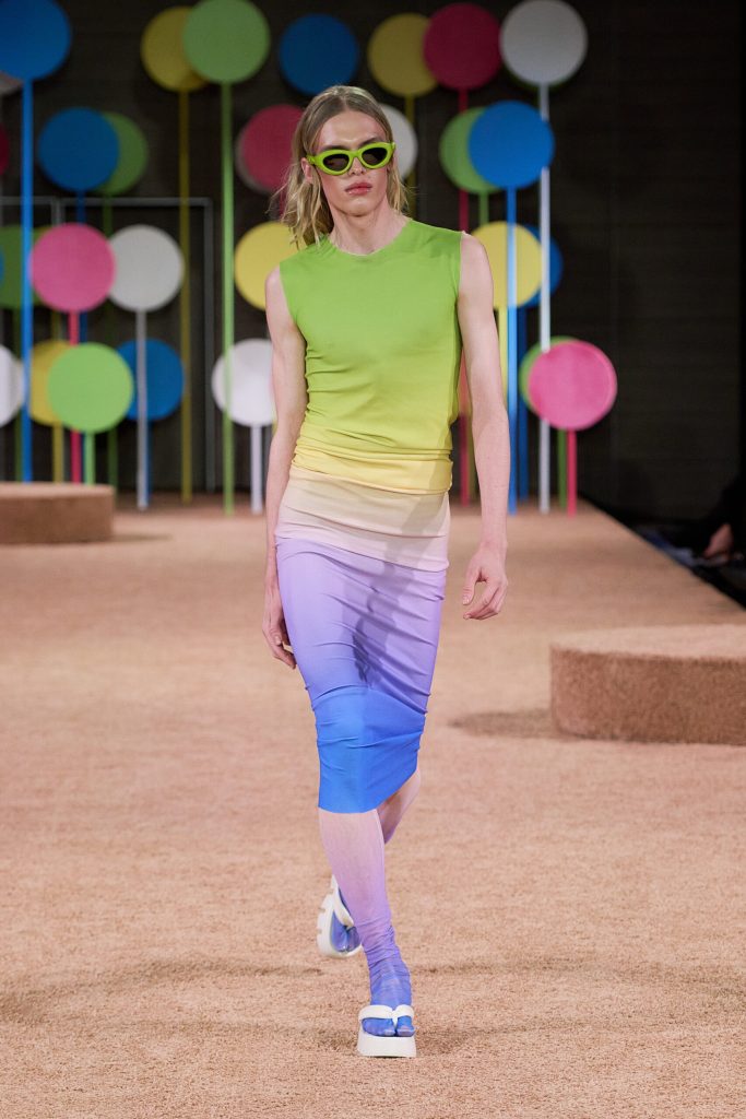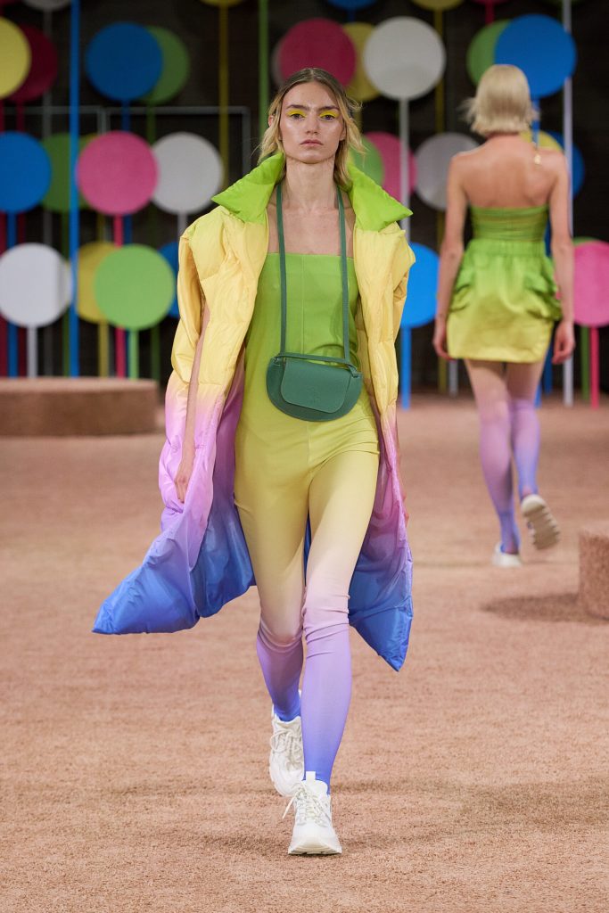 Tęczowy motyw ombre to jeden z mikrotrendów, które zagościły na wiosennych wybiegach światowych projektantów. Polski duet MMC Studio również zastosował ten element w swojej najnowszej kolekcji na wiosnę i lato 2023. Przenikające się odcienie żółci, limonki, brzoskwini, fioletu i niebieskiego pokryły dopasowane sukienki, puchowe kurtki, a nawet obcisłe kombinezony i rajstopy, tworząc kolorowe total looki.