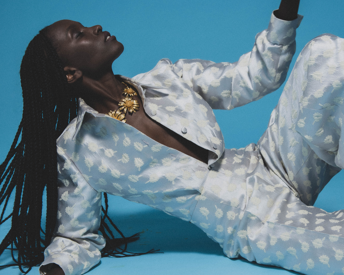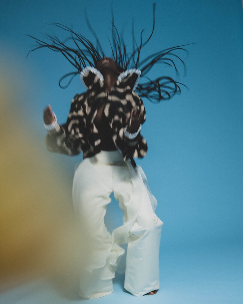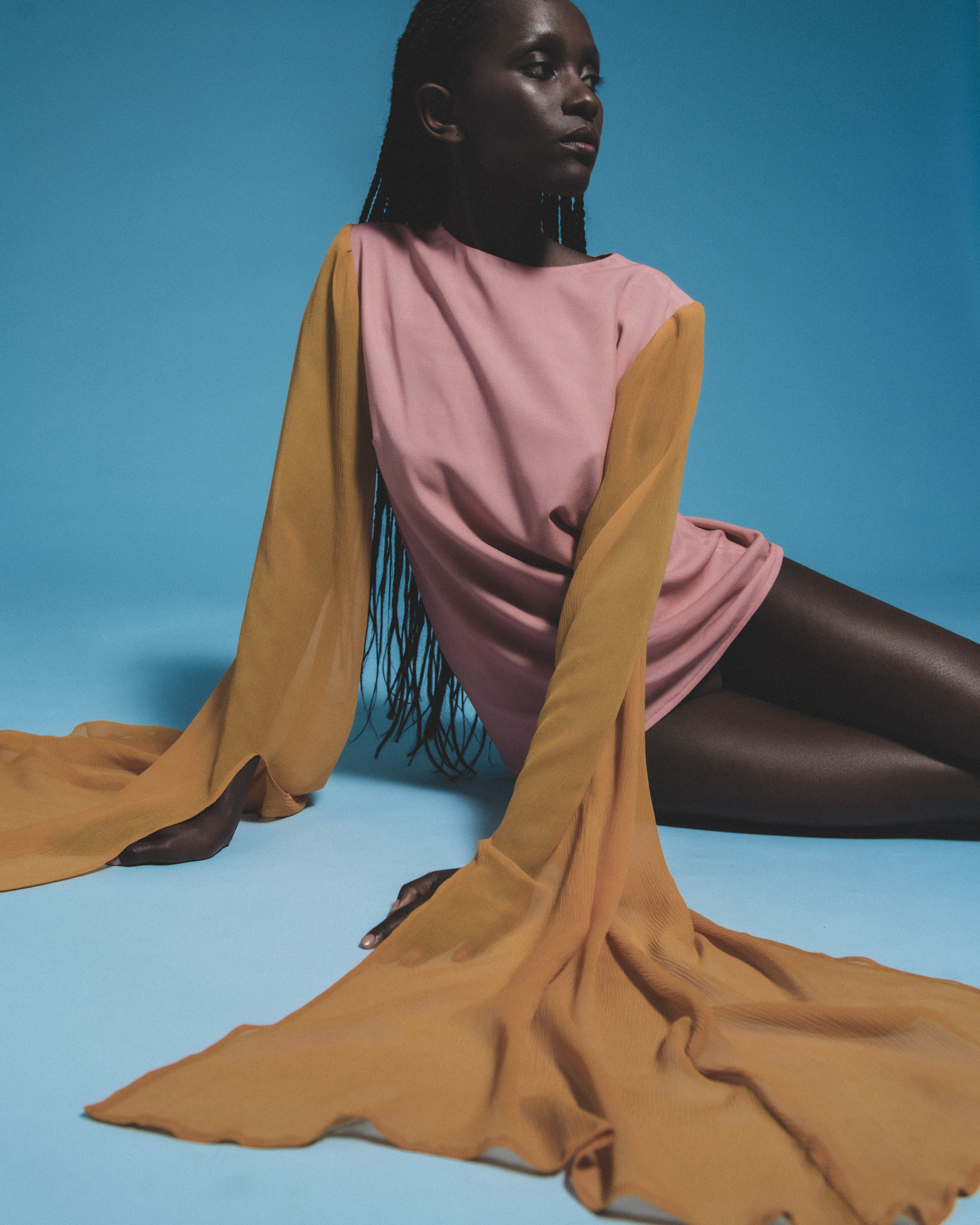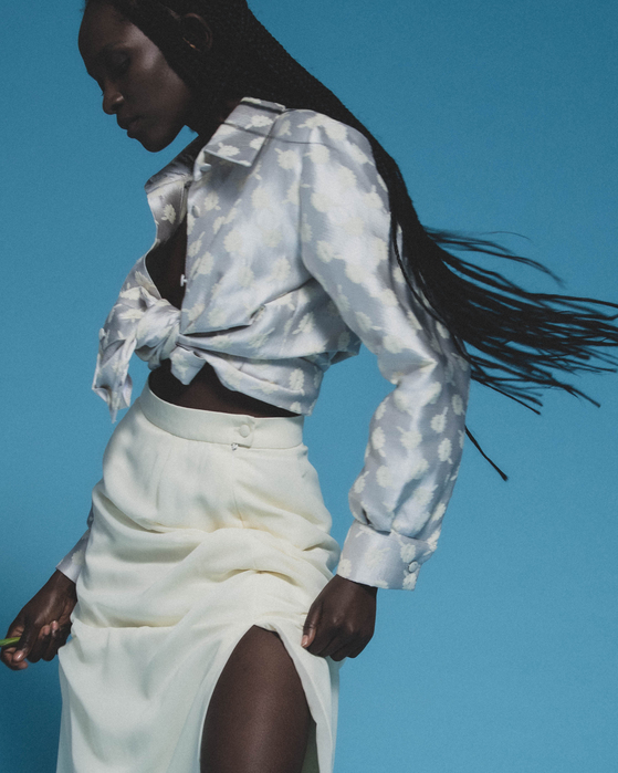 Na pierwszy plan wysuwa się soczyste połączenie mango i różu, podane w formie prostego topu z ekstremalnie długimi, transparentnymi rękawami oraz równie efektownej sukienki maxi. Kolejnym silnym punktem kolekcji jest żakard z motywem stokrotek w chłodnym odcieniu bieli, z którego powstała koszula z lekko bufiastymi rękawami i ostrym kołnierzykiem, szerokie garniturowe spodnie oraz mini spódniczka. Nie mogło też zabraknąć wyrazistego wzoru – tym razem są to nieregularne pasy przypominające tygrysa lub zebrę. Z tego materiału projektantka stworzyła koszulę oraz sukienkę z dużym, okrągłym kołnierzem.