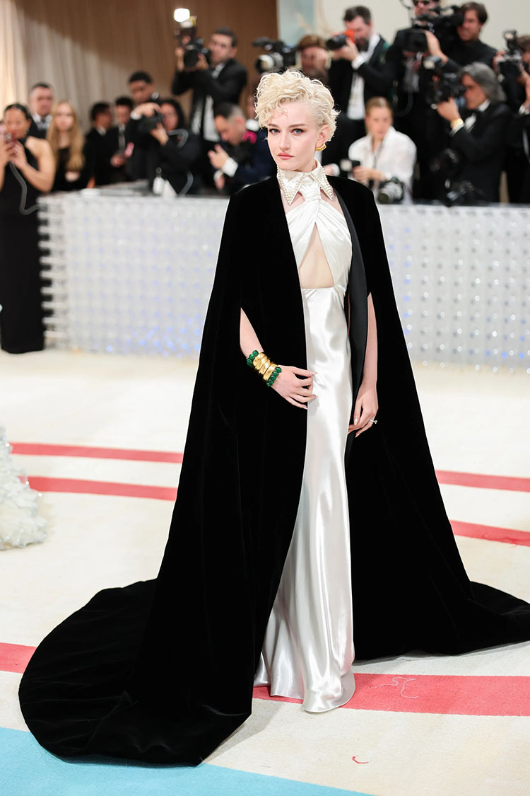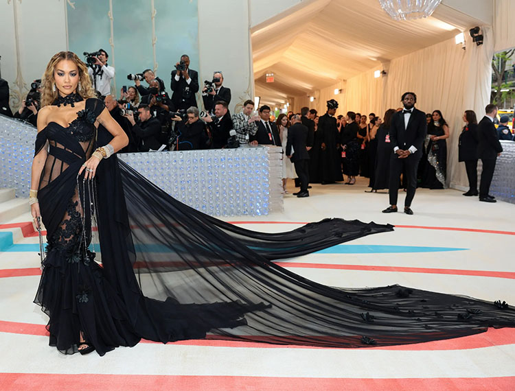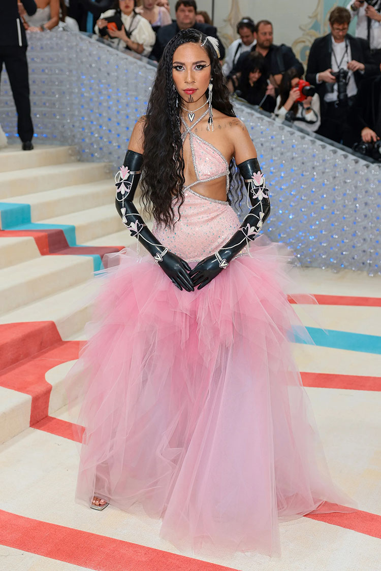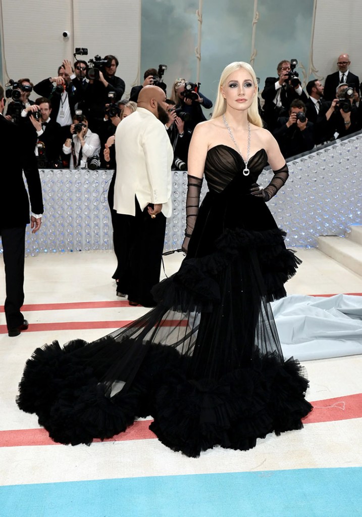 Nie dziwi nas zupełnie, że czerwony dywan tegorocznej MET Gali zdominowała czerń i biel – te dwa kolory od lat towarzyszyły Lagerfeldowi w tworzeniu jego charakterystycznego wizerunku. Nienagannie skrojony czarny garnitur, śnieżnobiała koszula z wysokim kołnierzykiem i czarny krawat stały się jego znakiem rozpoznawczym, a także symbolem jego autorskiej marki. Zainspirował on wiele gwiazd, które skorzystały właśnie z tego połączenia kolorów – Kristen Stewart, Stephanie Hsu i Teyana Taylor swoje stylizacje uzupełniły dodatkowo o krawaty, nieodłączny element stroju Lagerfelda. Jeremy Pope natomiast postawił na 10-metrową pelerynę z ręcznie namalowanym portretem projektanta.