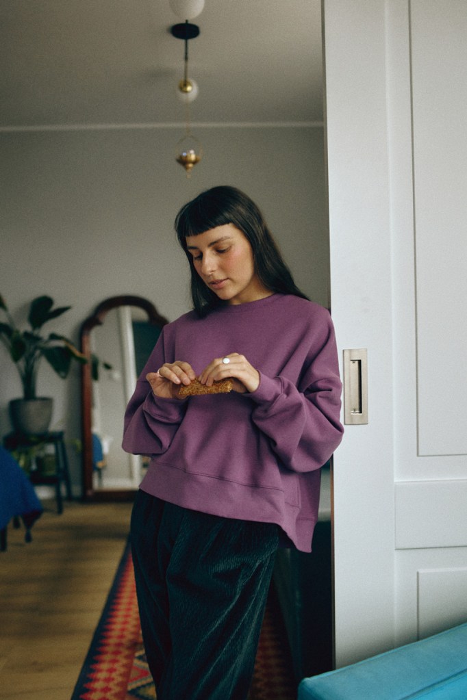 Nowością w sezonie zimowym jest niebieski komplet z satynowej wiskozy: koszula o piżamowym kroju i lejące, luźne spodnie to doskonała propozycja na leniwe zimowe wieczory. Noszone osobno, będą prezentować się nadzwyczaj elegancko zestawione z czernią. Dla zrównoważenia tej retro estetyki pojawiły się minimalistyczne, choć ciepłe i miękkie bluzy z charakternym, szerokim ściągaczem. Kolory? Przygaszony, lecz intensywny fiolet lub stłumiona zieleń, idealne nie tylko w zimowej palecie.