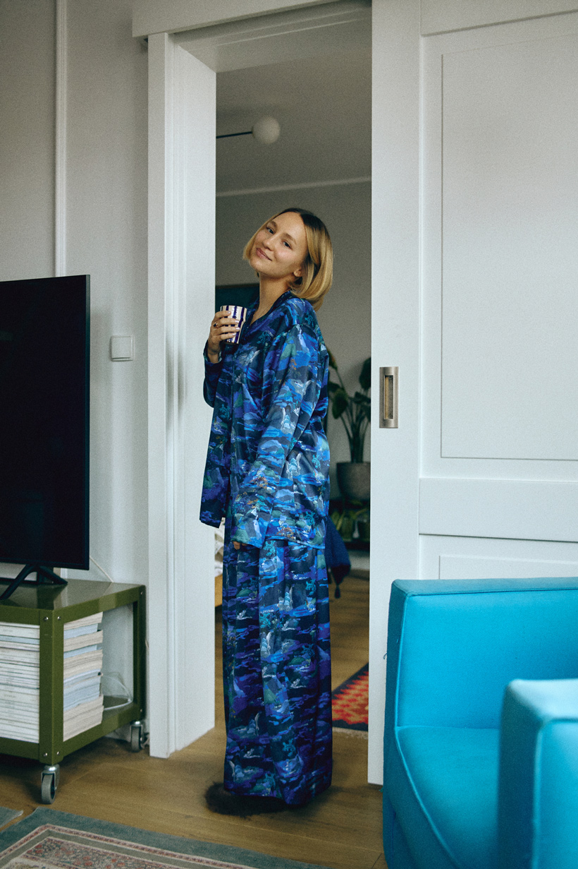 Nowością w sezonie zimowym jest niebieski komplet z satynowej wiskozy: koszula o piżamowym kroju i lejące, luźne spodnie to doskonała propozycja na leniwe zimowe wieczory. Noszone osobno, będą prezentować się nadzwyczaj elegancko zestawione z czernią. Dla zrównoważenia tej retro estetyki pojawiły się minimalistyczne, choć ciepłe i miękkie bluzy z charakternym, szerokim ściągaczem. Kolory? Przygaszony, lecz intensywny fiolet lub stłumiona zieleń, idealne nie tylko w zimowej palecie.