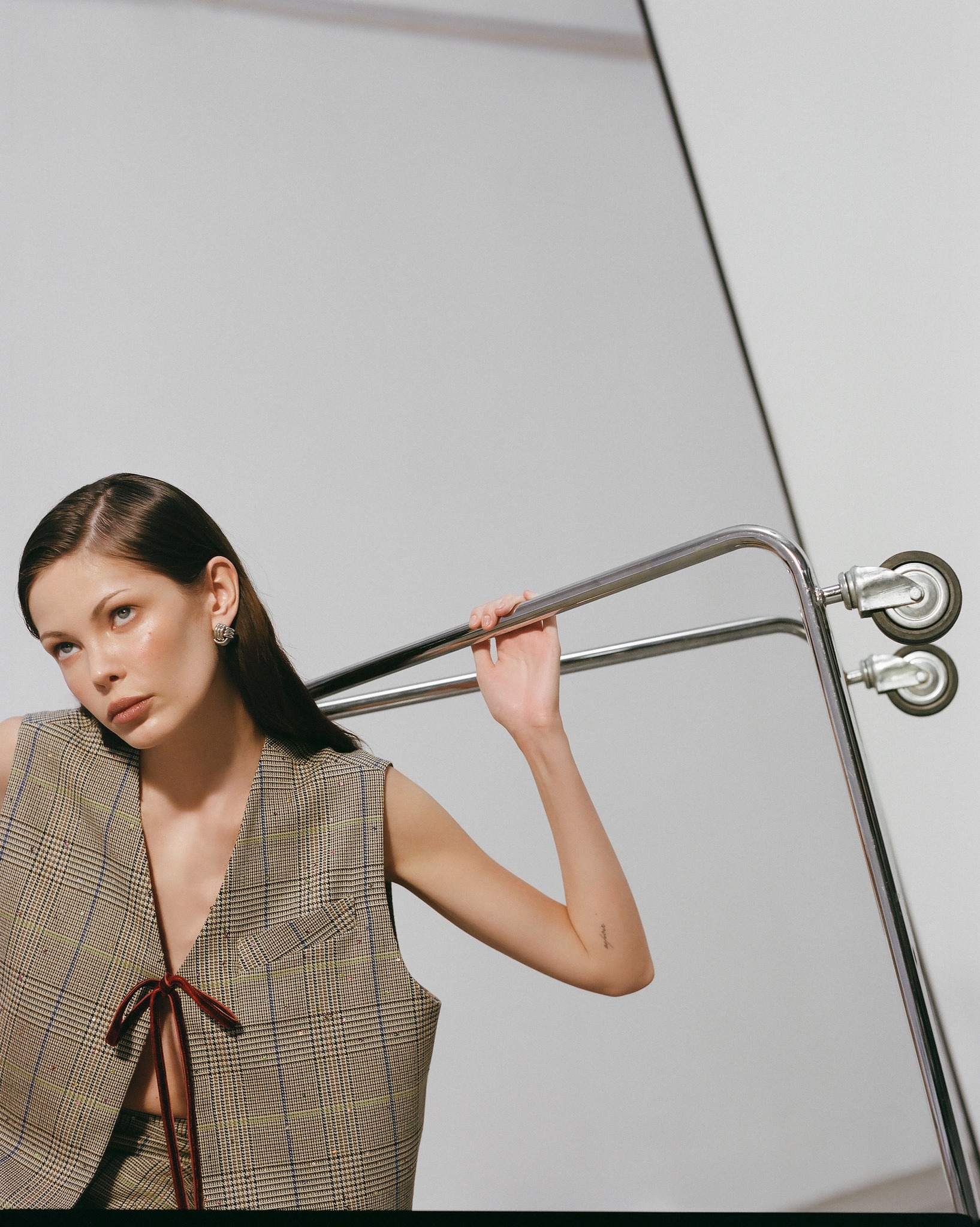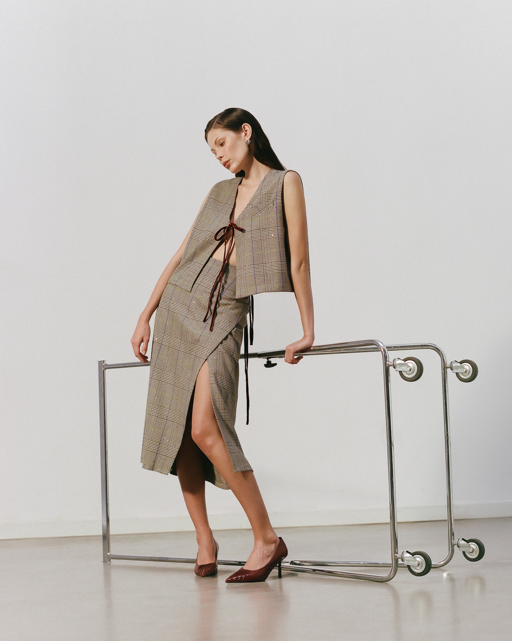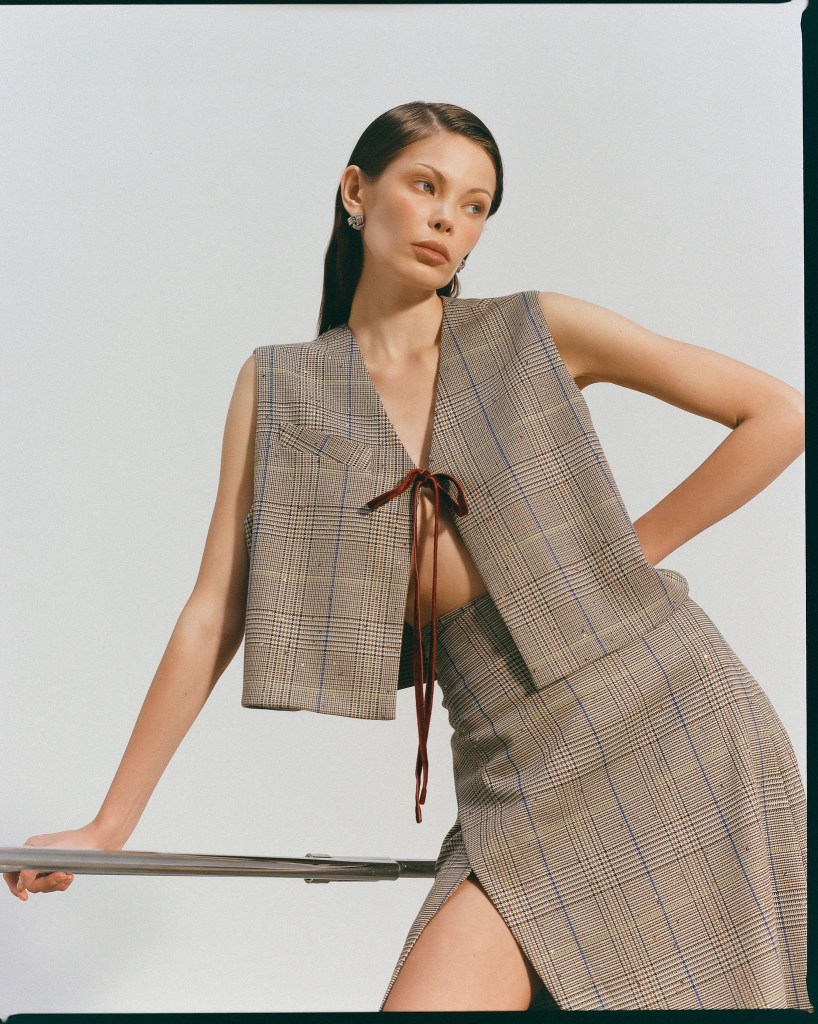 Wyjątkową nowością jest komplet składający się z kopertowej spódnicy midi i kamizelki, wykonany z materiału w kratkę wyszywanego cekinami. Zarówno kamizelka, jak i spódnica wykończone zostały aksamitną wstążką w kolorze burgundowym, zawiązywaną na kokardkę. Ten zestaw stanowi doskonałe uzupełnienie biurowej garderoby, a noszony osobno daje ogromne pole do stylizacyjnej zabawy w bardziej casualowym stylu.