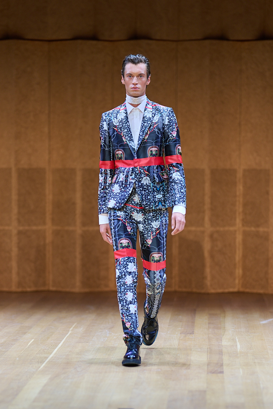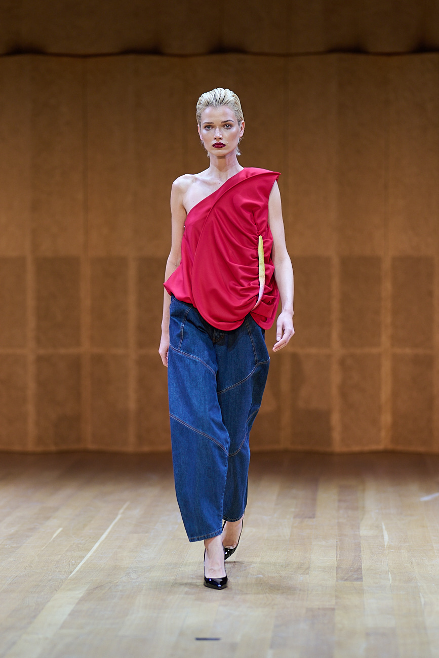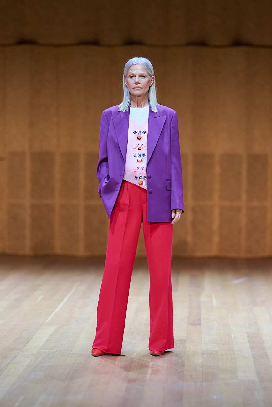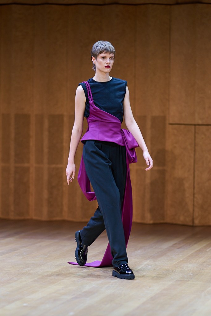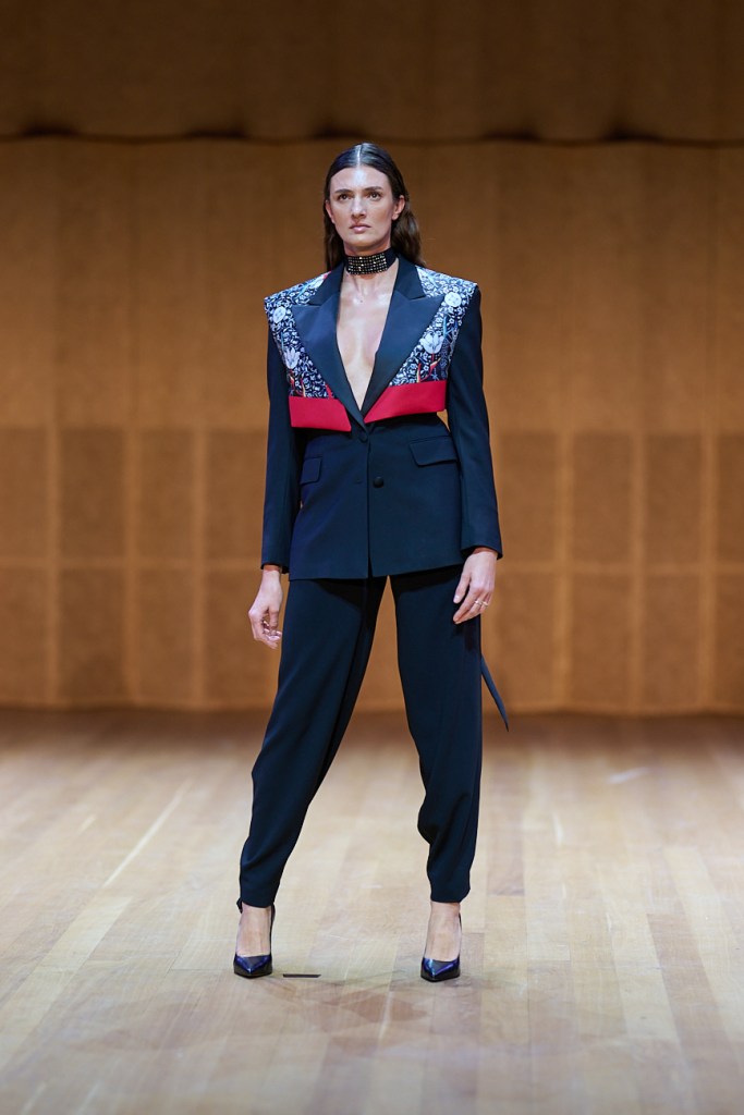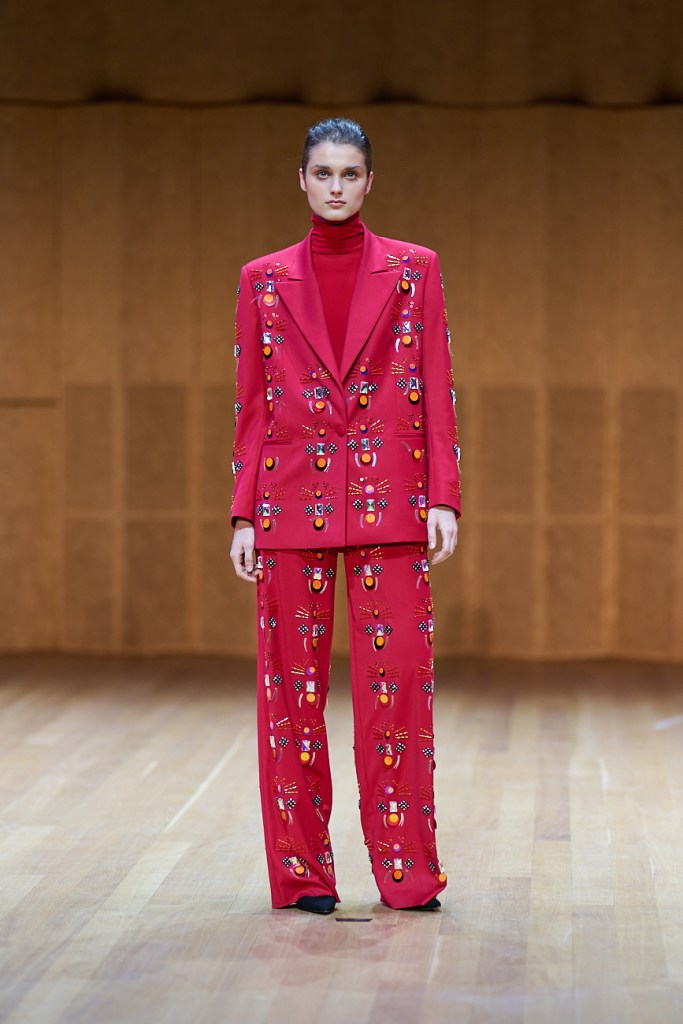 Ten mariaż widoczny jest oczywiście w najnowszej kolekcji Przybylskiego „Body Map”. Inspirowana ludzkim ciałem, raz podąża za jego naturalnymi krzywiznami i otula niczym delikatna mgła, innym razem stanowi dla niego ochronną zbroję. Mocno zaznaczona linia ramion w marynarkach czy kurtkach inspirowanych latami 80. przełamana zostaje lejącymi tkaninami, udrapowanymi niczym szaty na starożytnych greckich rzeźbach. Połączenie nasyconej czerwieni z żywym fioletem oraz motyw kwitnącego anturium, czy to w postaci nadruku, czy też misternego ułożenia tkaniny, to także nawiązanie do natury, z którą ciało jest nierozerwalnie związane.