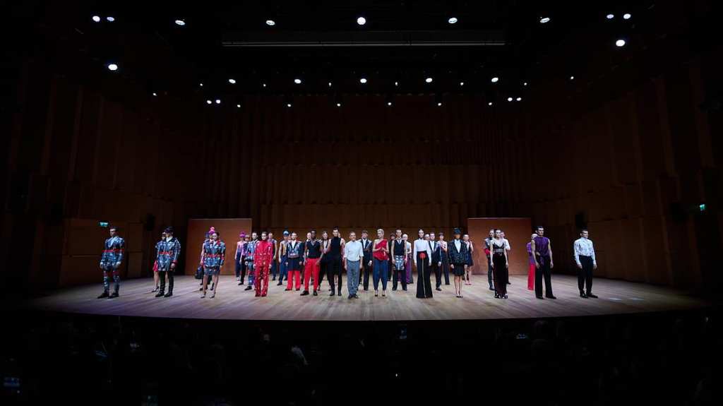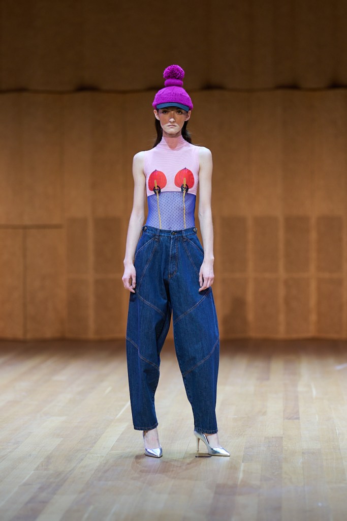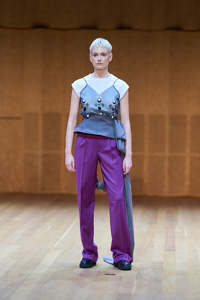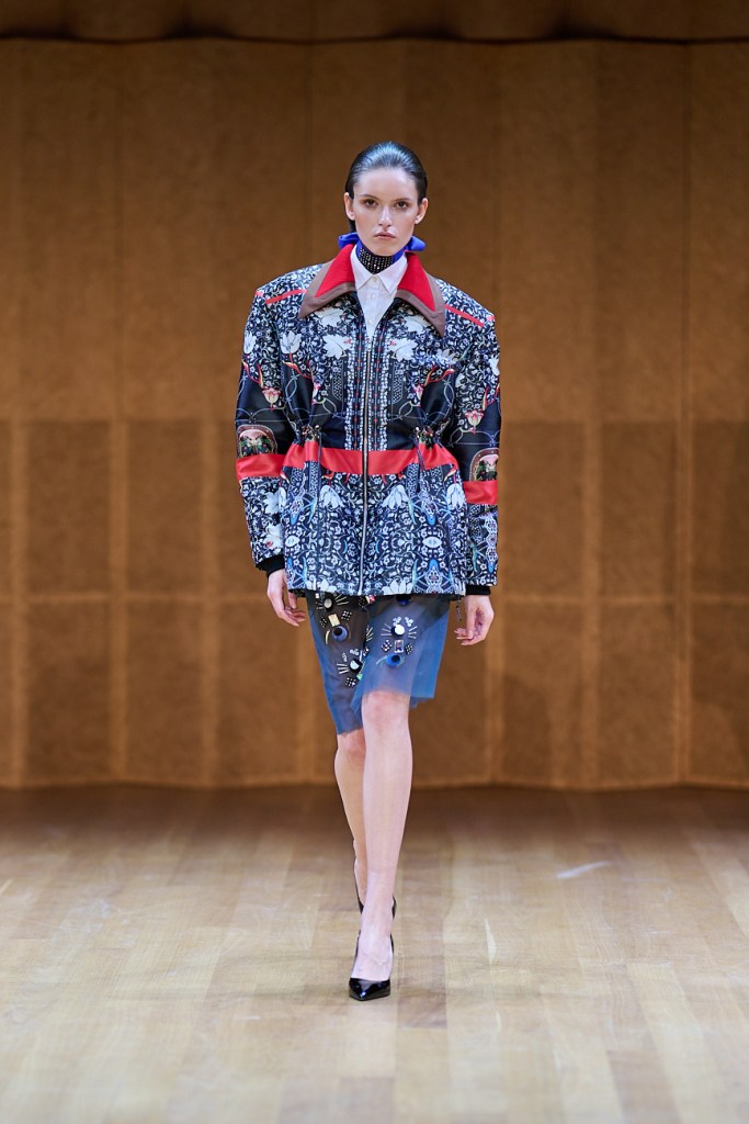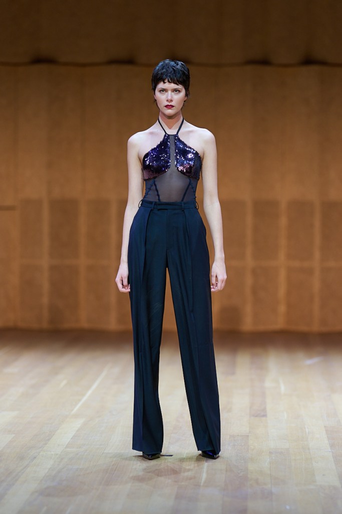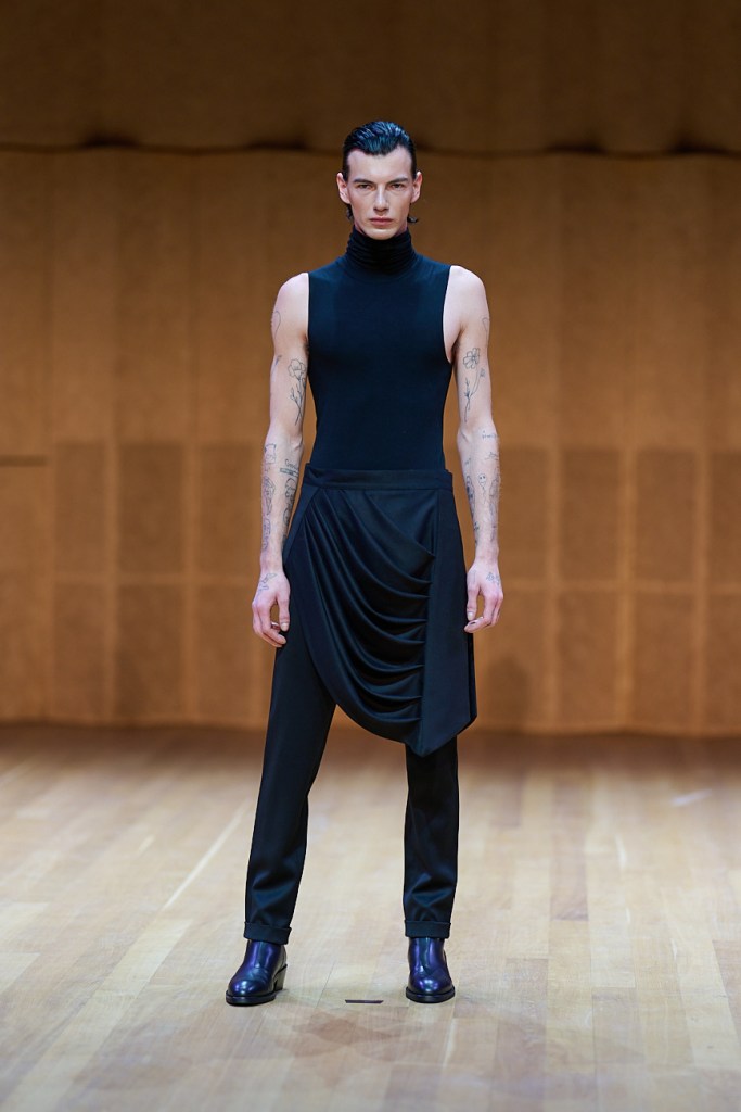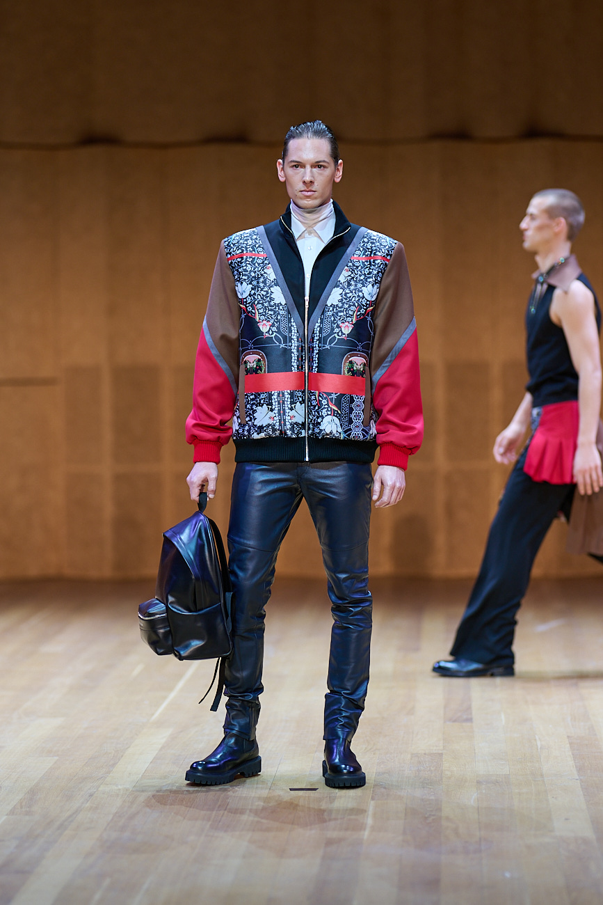Ten mariaż widoczny jest oczywiście w najnowszej kolekcji Przybylskiego „Body Map”. Inspirowana ludzkim ciałem, raz podąża za jego naturalnymi krzywiznami i otula niczym delikatna mgła, innym razem stanowi dla niego ochronną zbroję. Mocno zaznaczona linia ramion w marynarkach czy kurtkach inspirowanych latami 80. przełamana zostaje lejącymi tkaninami, udrapowanymi niczym szaty na starożytnych greckich rzeźbach. Połączenie nasyconej czerwieni z żywym fioletem oraz motyw kwitnącego anturium, czy to w postaci nadruku, czy też misternego ułożenia tkaniny, to także nawiązanie do natury, z którą ciało jest nierozerwalnie związane.