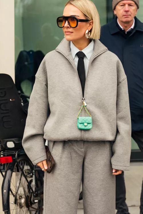 Nie tylko w stylu mob wife. Równie dobrze wygląda w minimalistycznej odsłonie, na przykład z garniturem, w naturalnej i stonowanej palecie barw.