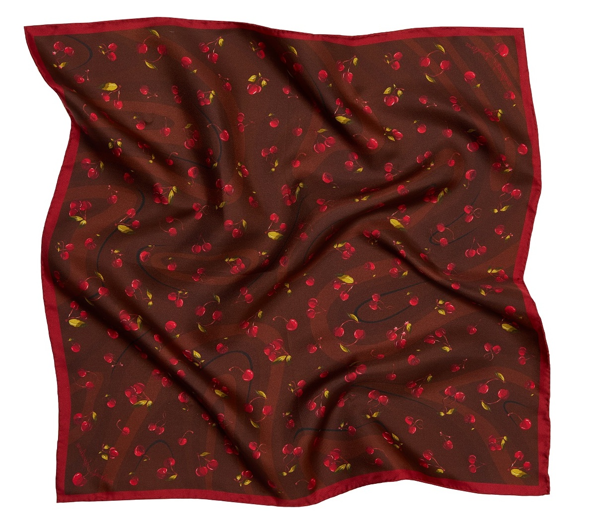 Apaszka z jedwabiu to ponadczasowy i wyrafinowany dodatek, obecny w garderobach najbardziej stylowych kobiet. Wzór w wisienki niesie ze sobą symbolikę międzyludzkich relacji, a połączenie bordo i brązu to najmodniejszy duet tego sezonu.