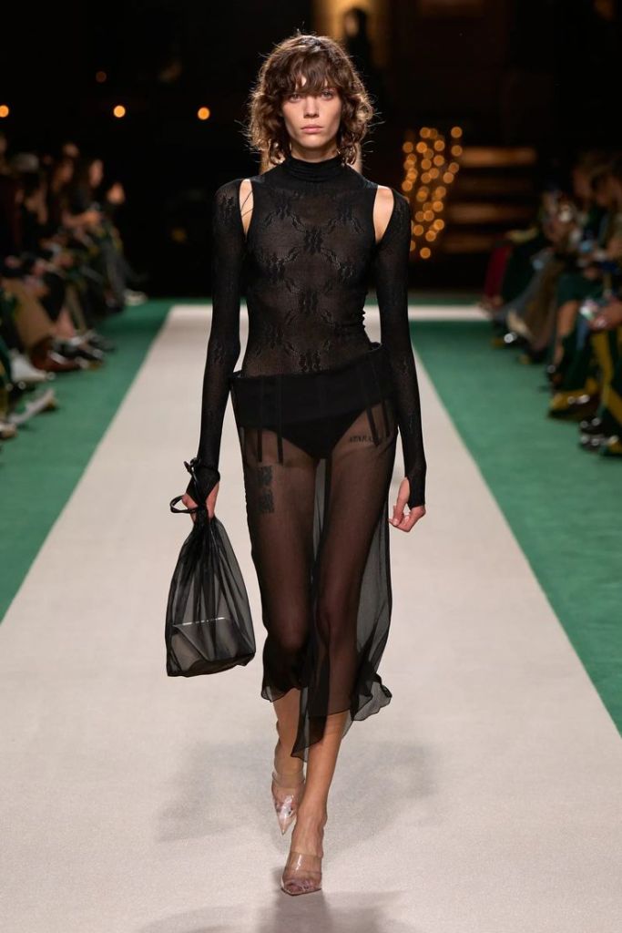 Trend na naked dressing przyjął się zaskakująco dobrze i powoli wdziera się do mody codziennej. By przezroczyste koronki, tiule i organzy nie eksponowały bielizmy, warto poeksperymentować z warstwami – na przykład transparentną spódnicę założyć na spodnie.