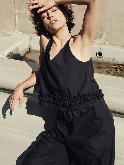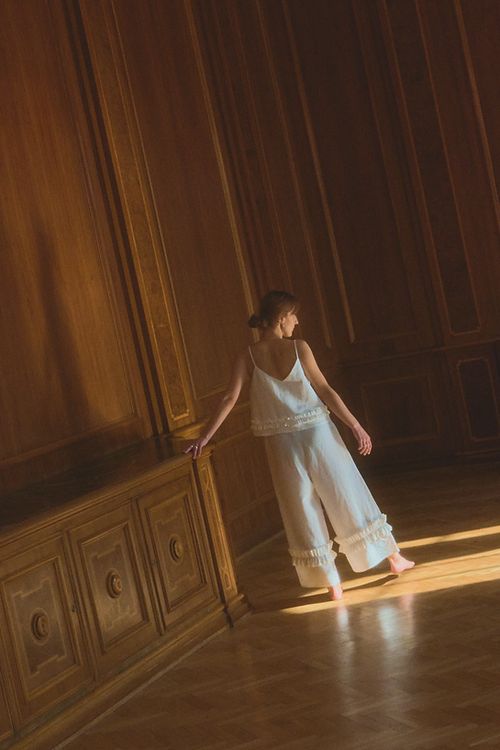 W skład kolekcji wchodzą cztery elementy w dwóch wersjach kolorystycznych – śmietankowej bieli i stalowej czerni. Zestaw składający się z topu na cienkich ramiączkach, z dekoltem w kształcie litery V, oraz spodni o długości 7/8 może być noszony zarówno w komplecie, jak i osobno. Bajeczna, zamaszysta suknia na ramiączkach sięgająca tuż przed kostkę jest łaskawa dla figury i tworzy natychmiastowy efekt WOW – z pewnością pokochają ją współczesne czarownice. Wielbicielki spódnic znajdą w kolekcji lekko rozkloszowany model 7/8 z wygodną gumką w pasie. Wszystkie elementy zostały ozdobione drobną, suto marszczoną falbanką, która dodaje projektom niepowtarzalnego, filuternego charakteru.