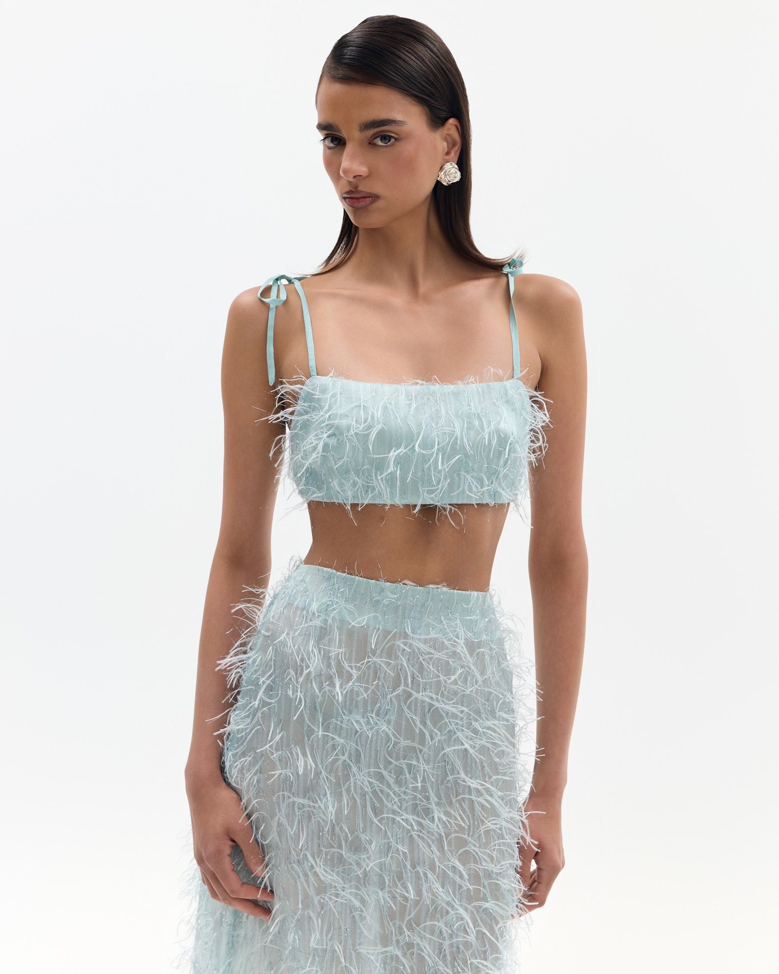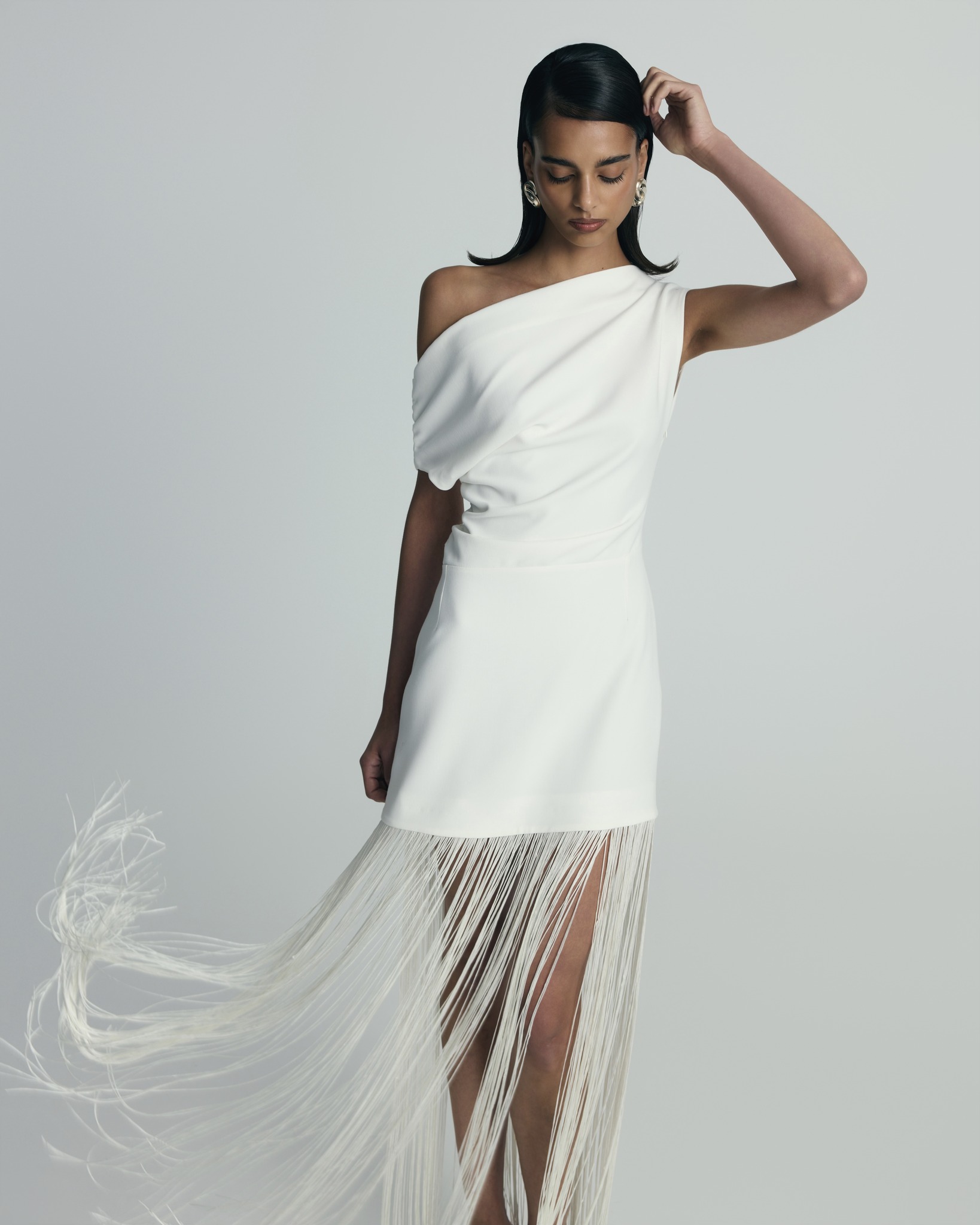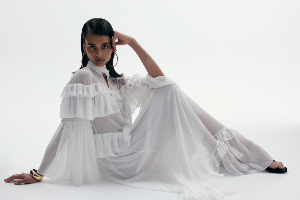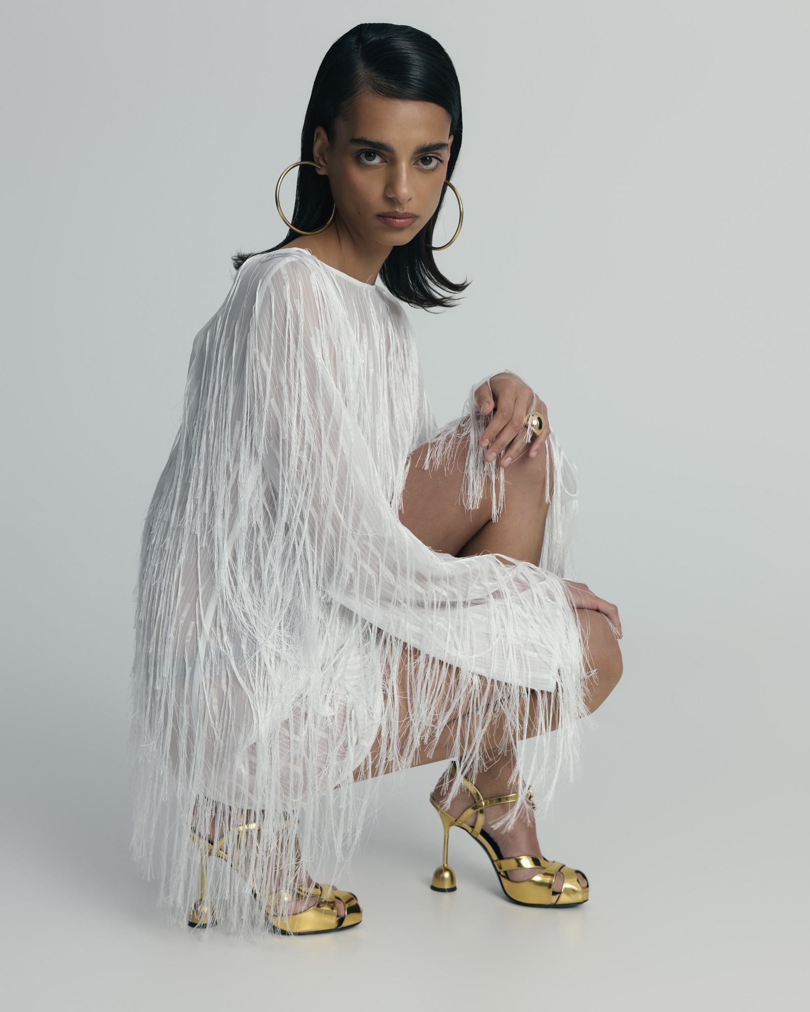 Eleganckie kroje bazujące na klasycznym garniturze to kolejny filar projektów Nikołajewskiej. Tym razem projektantka skupia się jednak na sukienkach – zarówno tych koktajlowych, jak i bardziej odważnych, nawiązujących do lat 2000. Odkryte plecy, dekolty typu halter, cienkie ramiączka wiązane na kokardki czy puchate frędzle to elementy nadające charakter wiosenno-letniej kolekcji.
