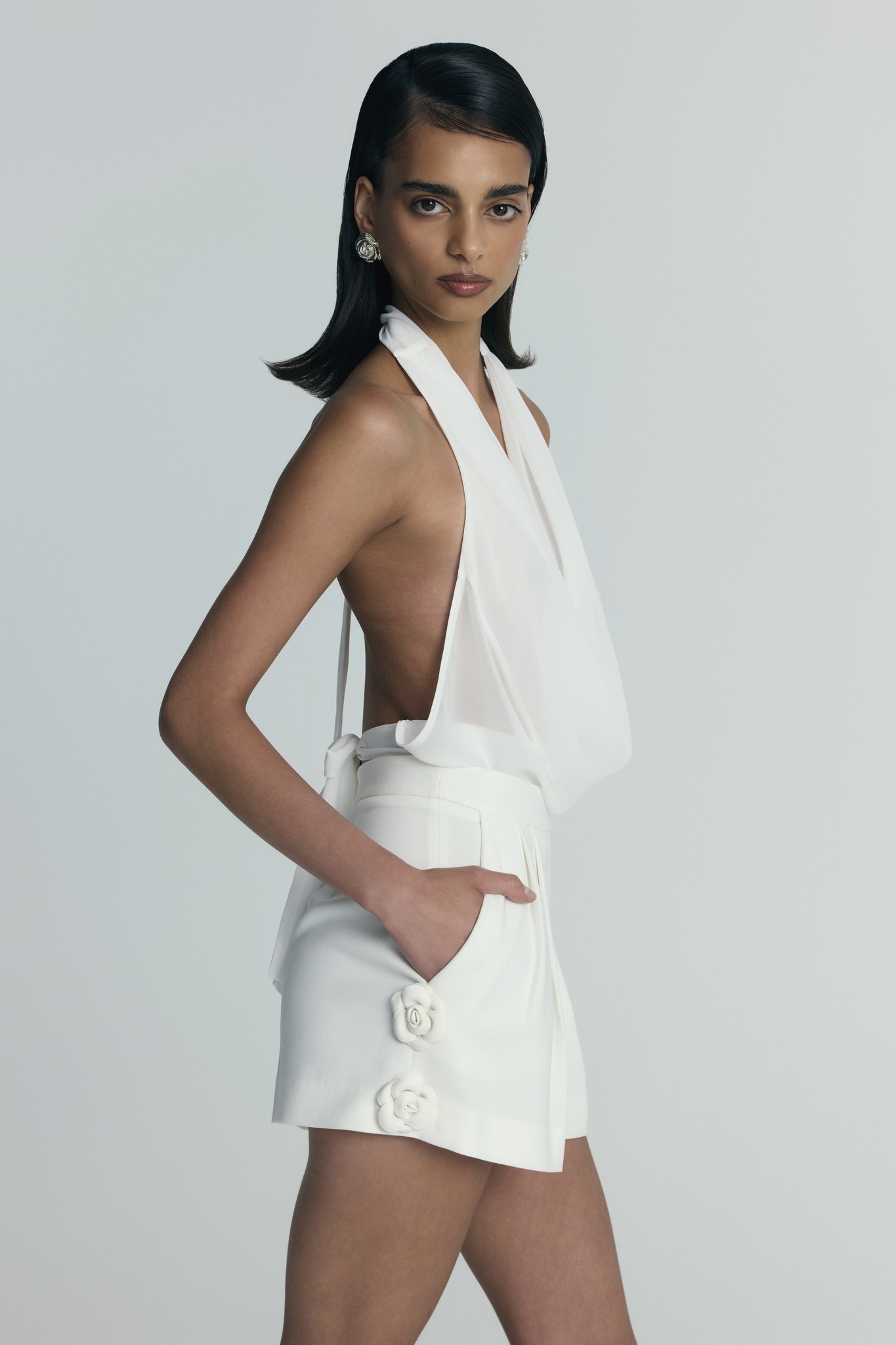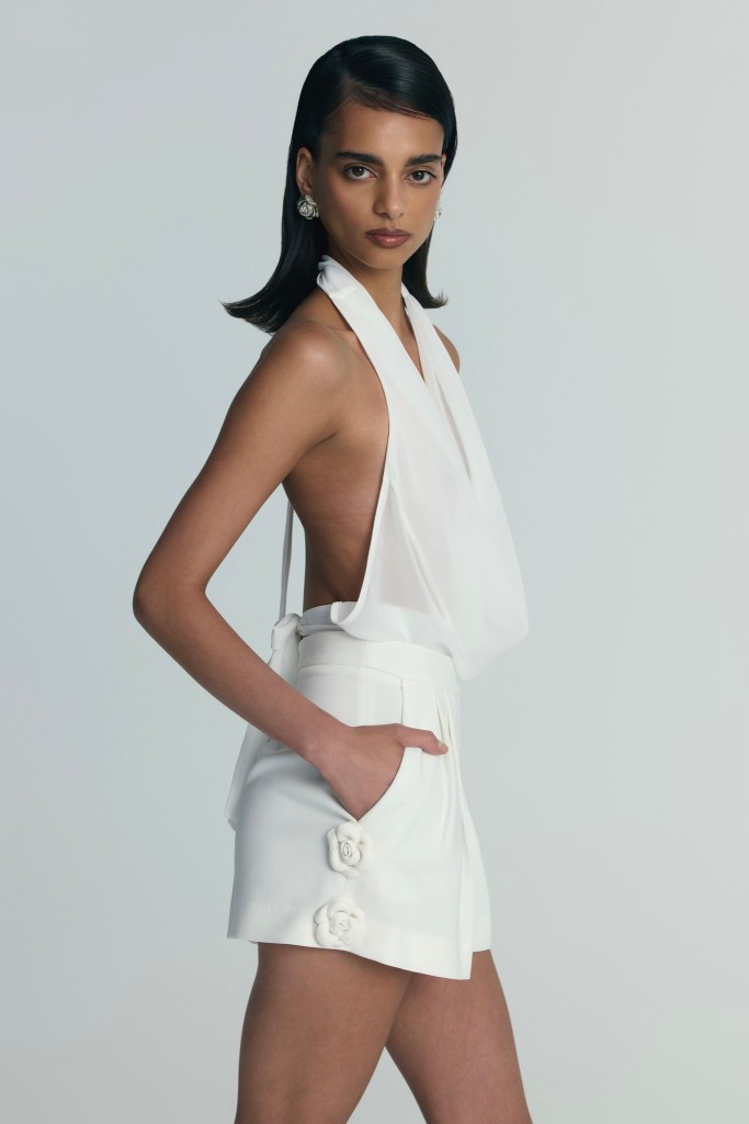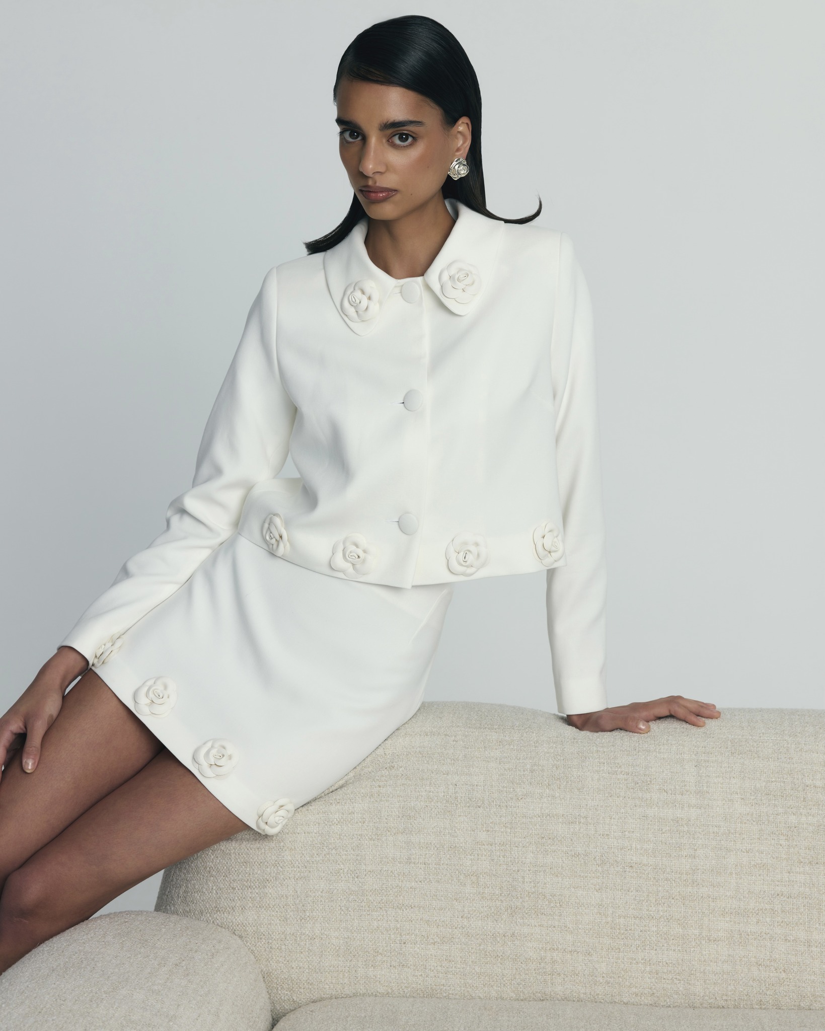 Wygląda na to, że Simona Nikołajewska odnalazła swój styl. Porzuciła architektoniczne, geometryczne formy na rzecz bardziej organicznych, miękkich i romantycznych. Kwiaty w postaci trójwymiarowych aplikacji towarzyszą jej już od wielu sezonów i najwyraźniej wciąż się sprawdzają, ponieważ licznie goszczą w kolekcji wiosna/lato 2025. Projektantka ozdabia nimi nie tylko sukienki mini i krótkie topy typu bralette, ale też eleganckie, taliowane marynarki czy pudełkowe żakiety w stylu Jackie Kennedy.