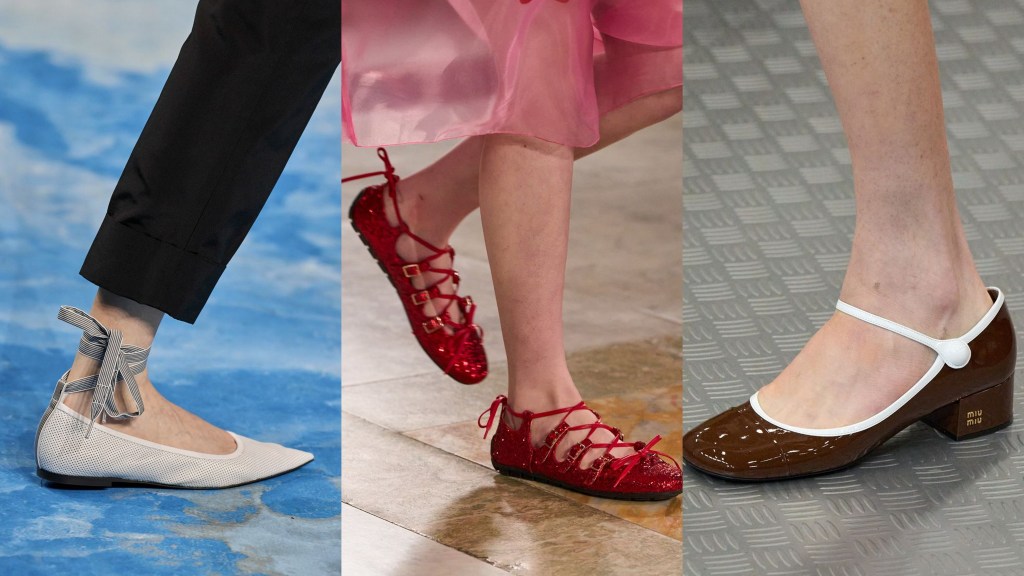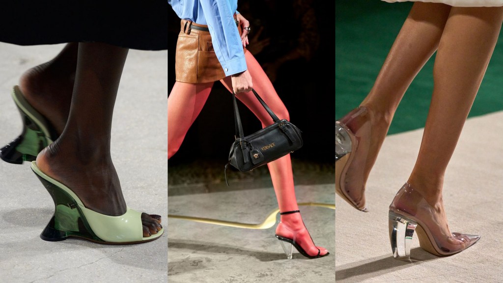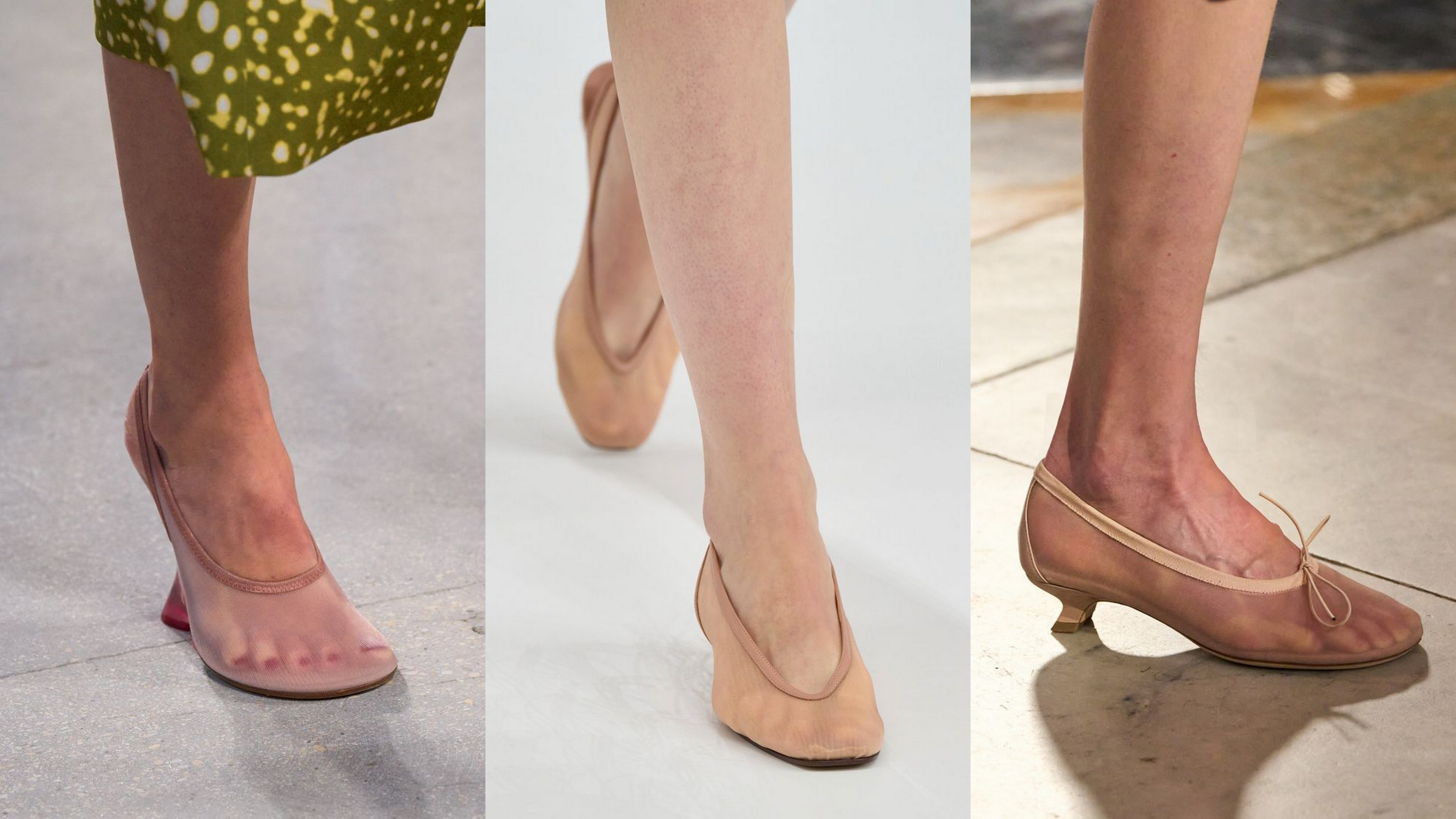 Na fali trendu balletcore, którego echa wciąż pobrzmiewają na wybiegach, pojawiła się wariacja na temat butów baletnicy. Czółenka na kaczuszce, wykonane z transparentnej siatki w kolorze nude, przypominają trochę tradycyjne baleriny. Połączone z dżinsami lub spodniami z szeroką nogawką staną się jednak nowoczesnym elementem dodającym modowego charakteru.