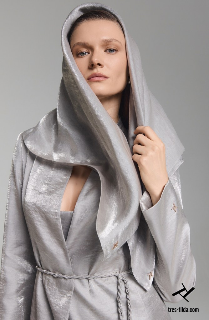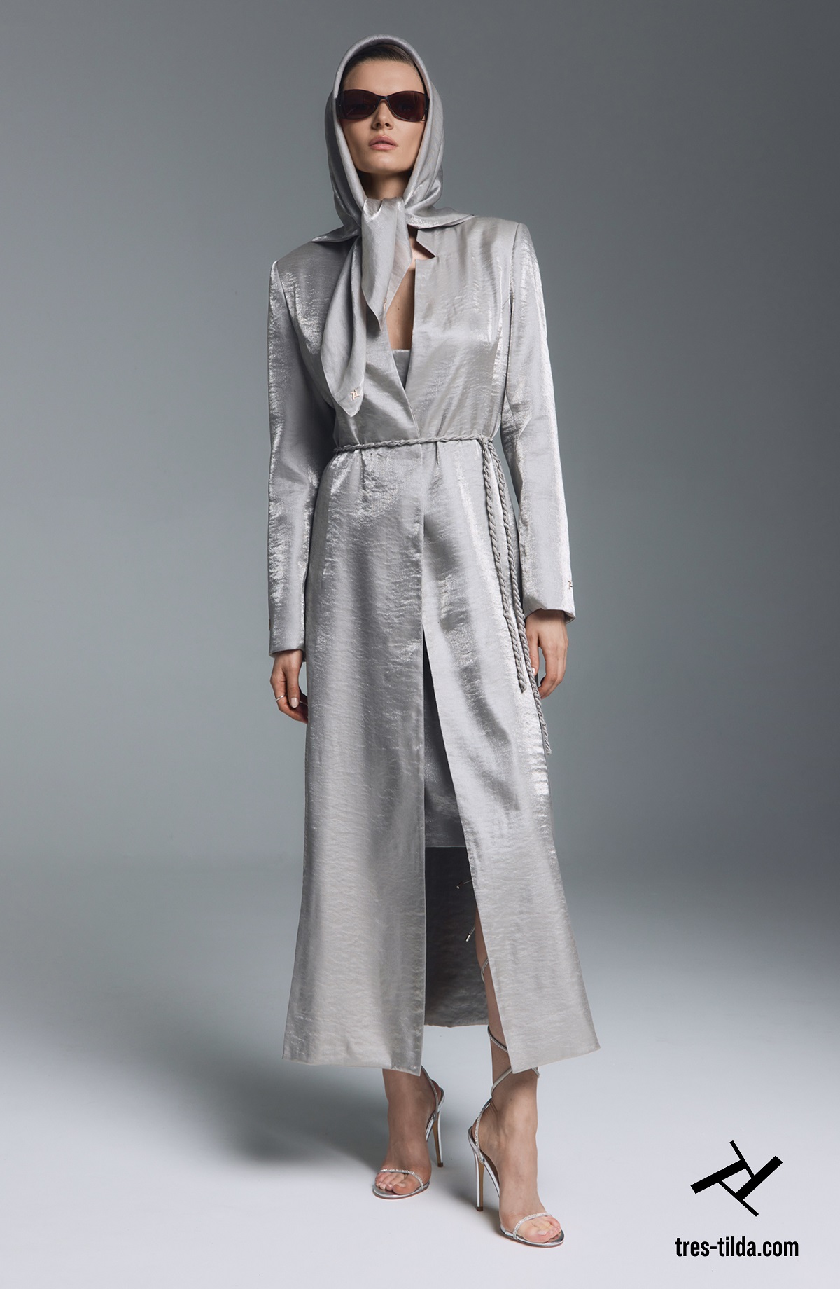 Zwiewne kroje kontrastują z tymi dopasowanymi, połysk wiskozy z matem jedwabnego aksamitu, jasne niczym księżycowa poświata tkaniny z nieprzeniknioną czernią pustynnej nocy. W palecie kolorystycznej dominuje chłodne, metaliczne srebro, czerń, biel oraz akcent kolorystyczny w postaci rozbielonego bordo wpadającego w róż.