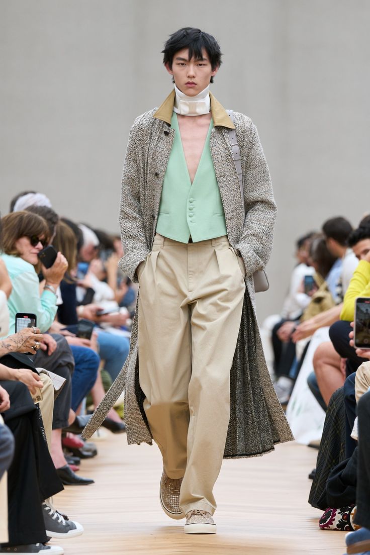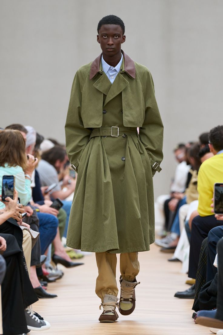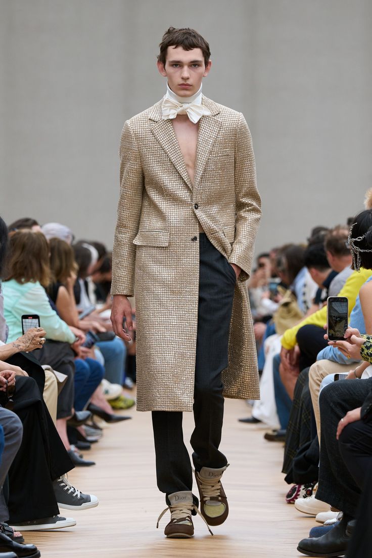 Współczesny dandys według Andersona nosi zamaszystą pelerynę do dżinsów, kamizelki z ozdobnych, bogato wyszywanych tkanin i przeskalowane szorty, nie stroni też od pastelowych kolorów. Projektant śmiało sięga do archiwów Diora i czerpie z bogatej historii kobiecej mody, co uwidacznia się w zaprezentowanych na wybiegu sylwetkach: taliowanych marynarkach, kloszowanym dole płaszcza czy fantazyjnymi przeszyciami na nogawkach spodni.
