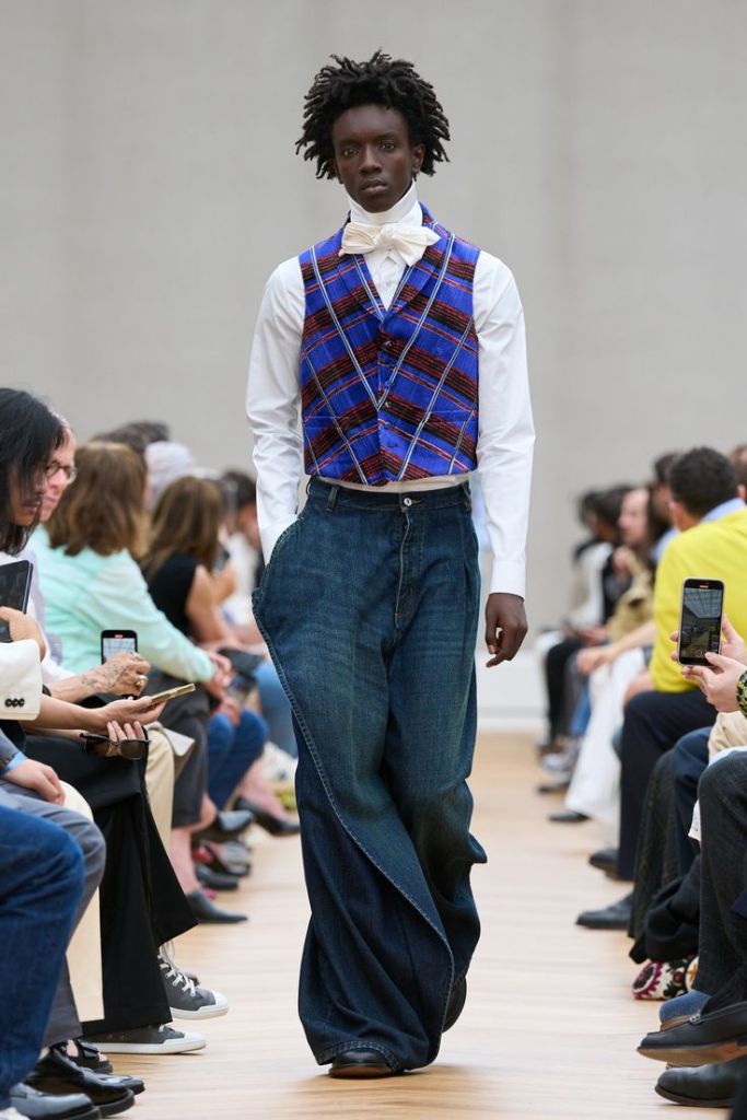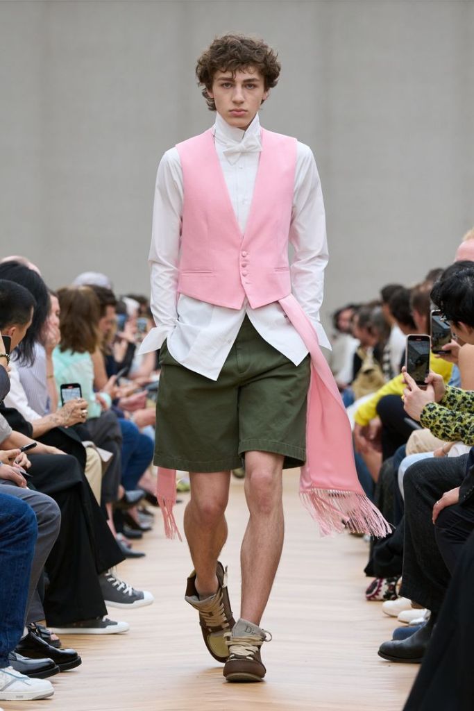 W kolekcji na sezon wiosna/lato 2026 Jonathan Anderson żongluje epokami, sięgając po ubiory historyczne z XVIII wieku i zestawiając je z tymi współczesnymi. Kamizelki z ozdobnymi guzikami, wysokie stójki, wiązane pod szyją kokardy i krawaty z fantazyjnymi węzłami to echa ubioru arystokratycznych młodzieńców. Ich współczesnym odpowiednikiem są rozpięte pod szyją koszule, grzeczne sweterki w stylu preppy i kurtki pilotki z futrzanym kołnierzem.