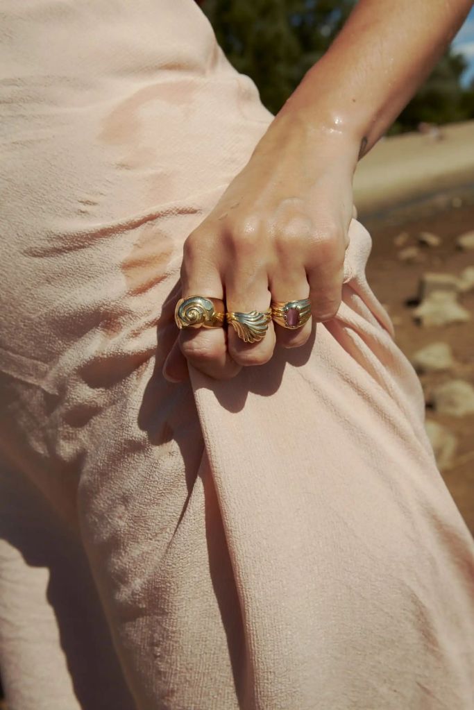 W kolekcji „Sirène” nie mogło oczywiście zabraknąć pierścionków. Te przybierają formy wyrazistych sygnetów wysadzanych kolorowymi kamieniami oraz pierścionków z fantazyjnymi żłobieniami nawiązującymi do kształtu muszli.