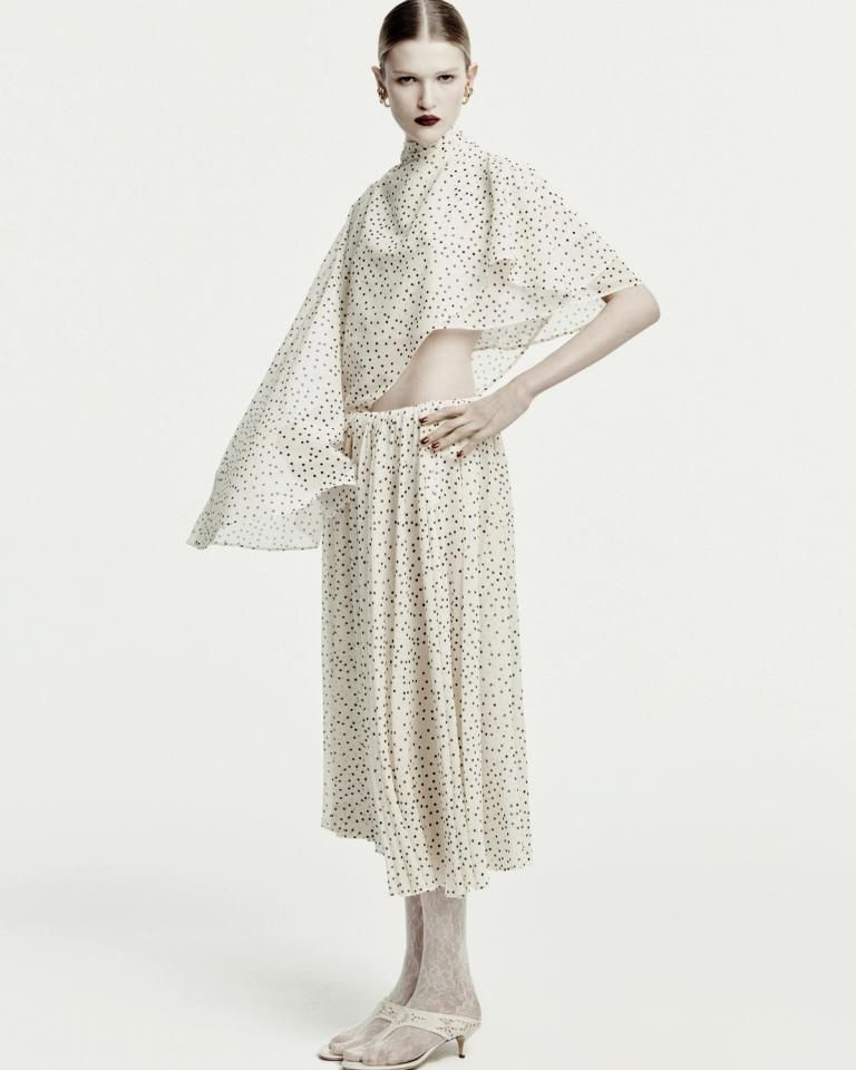 Najmodniejszy wzór sezonu – groszki – pojawia się w wersji mikro, co dodaje zwiewnym tkaninom jeszcze większej lekkości. Podobnie jak motyw kwiatów, który pokrywa szyfonowe bluzki i sukienki w kolorze matcha green. Półtransparentne, noszone warstwowo na spodnie, to flirt z wczesnymi latami 2000. Z nie tak dawnych lat powraca z kolei baskinka – u Butrym minimalistyczna, nawiązująca formą do bombki.