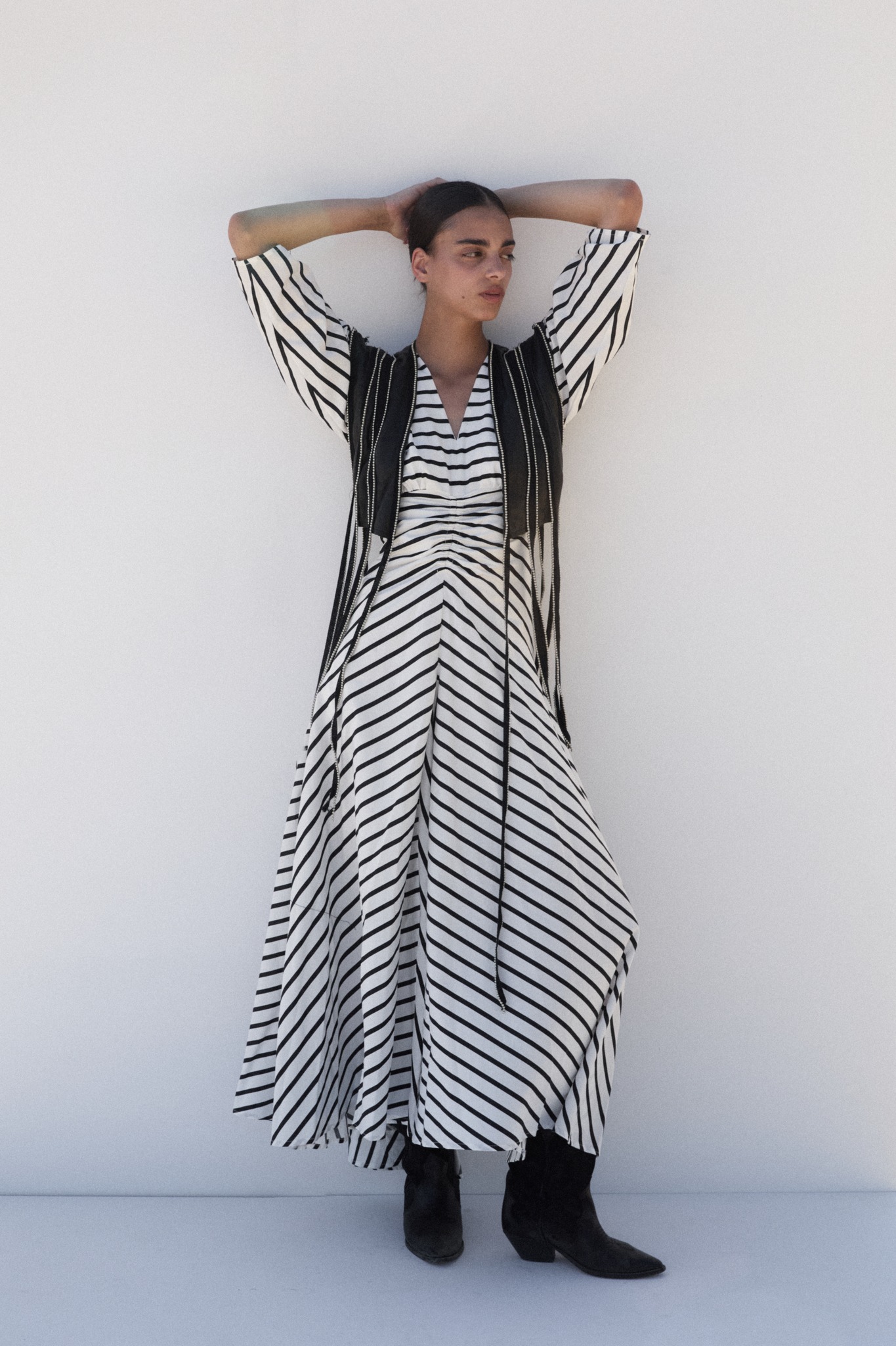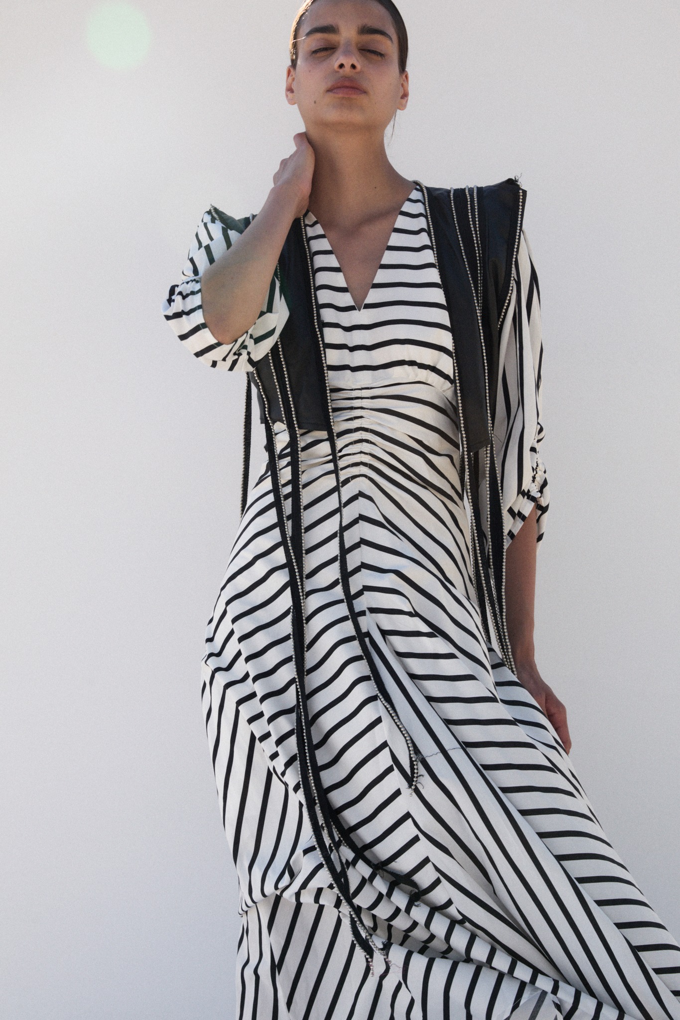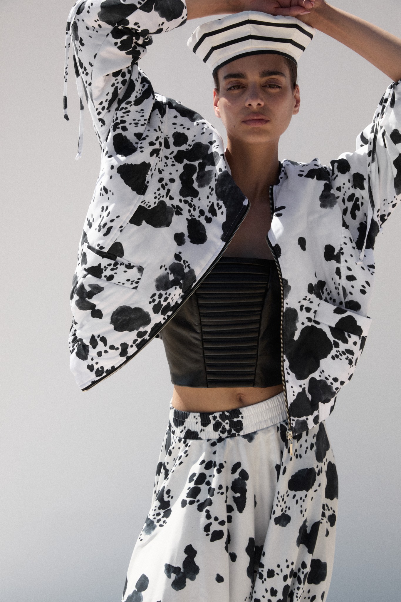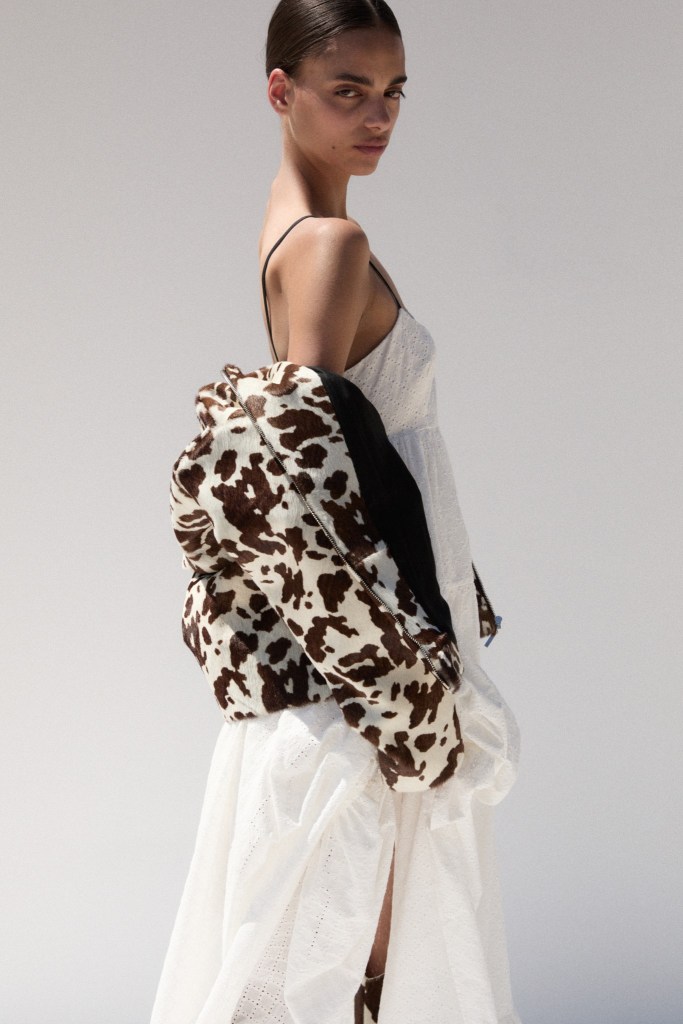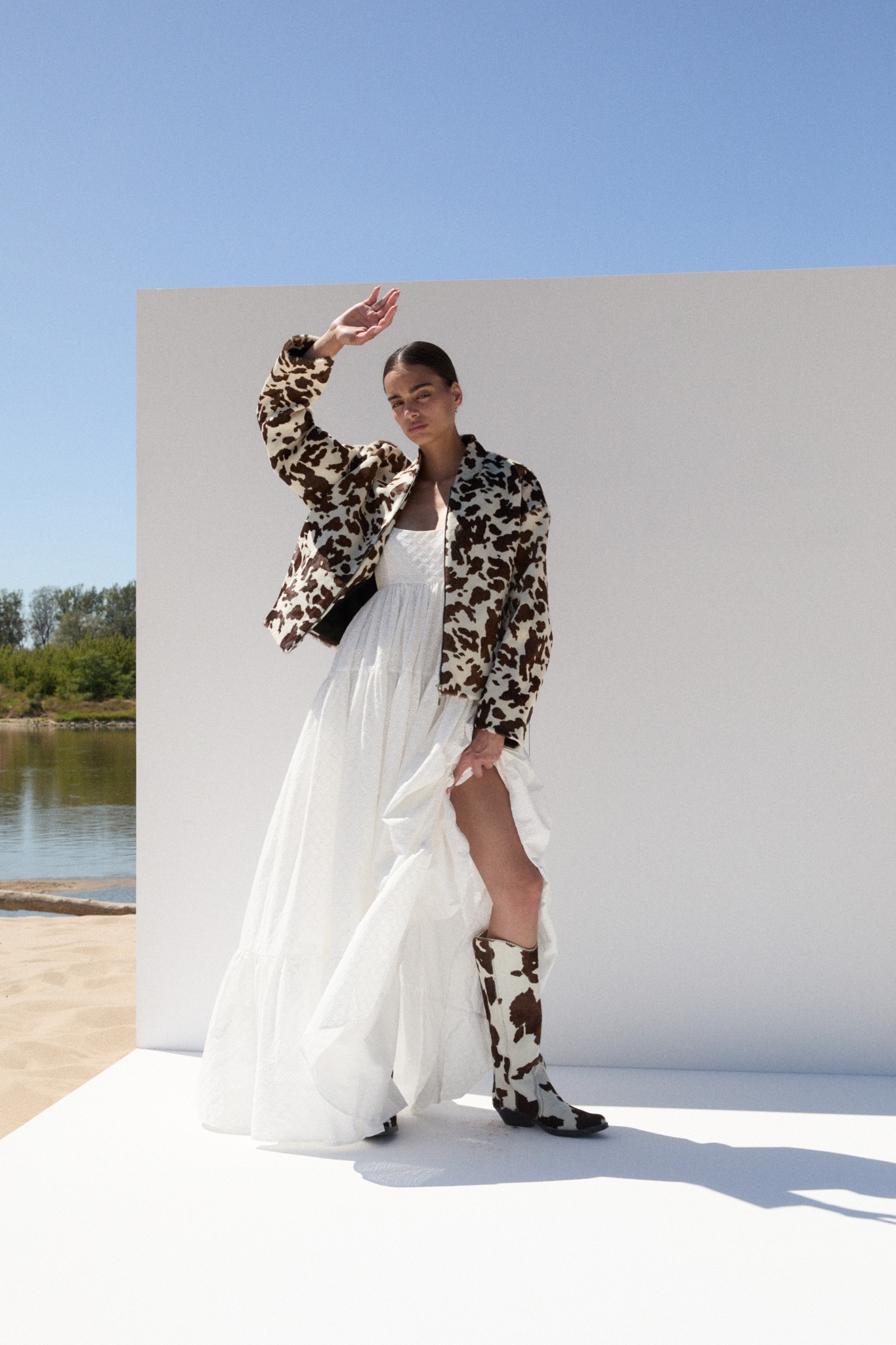 Kolekcja „She Worn” jest mocno osadzona w letnim kontekście, można jednak tu i ówdzie odnaleźć pierwsze oznaki jesieni. Inez Vicher wprowadza zwierzęcy wzór – krówkę, powielając go zarówno na topach i spódnicach, jak również na kurtkach o kroju bomberki i kowbojkach. Wykorzystanie naturalnej skóry ze strukturą włosia do uszycia jednej z bomberek dodaje jej luksusowego charakteru.