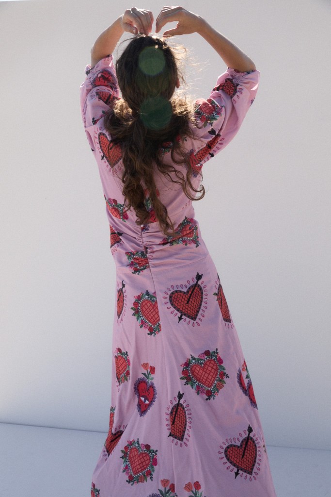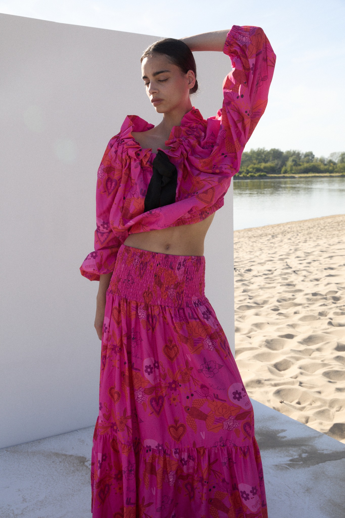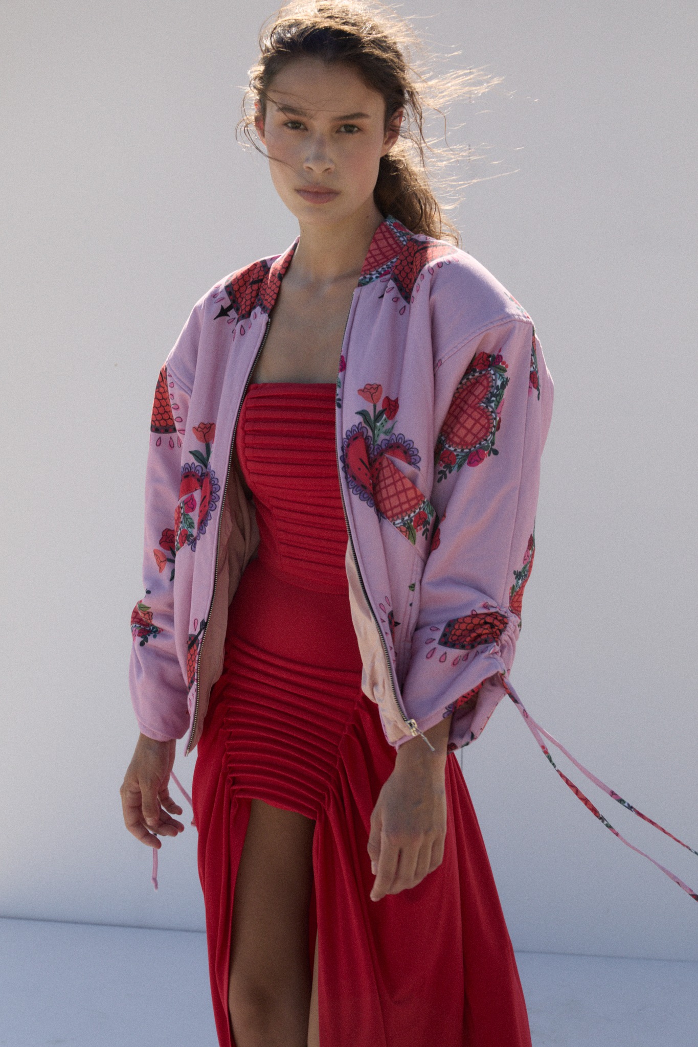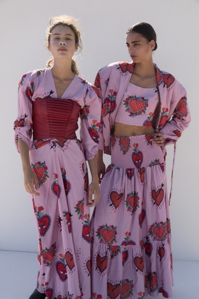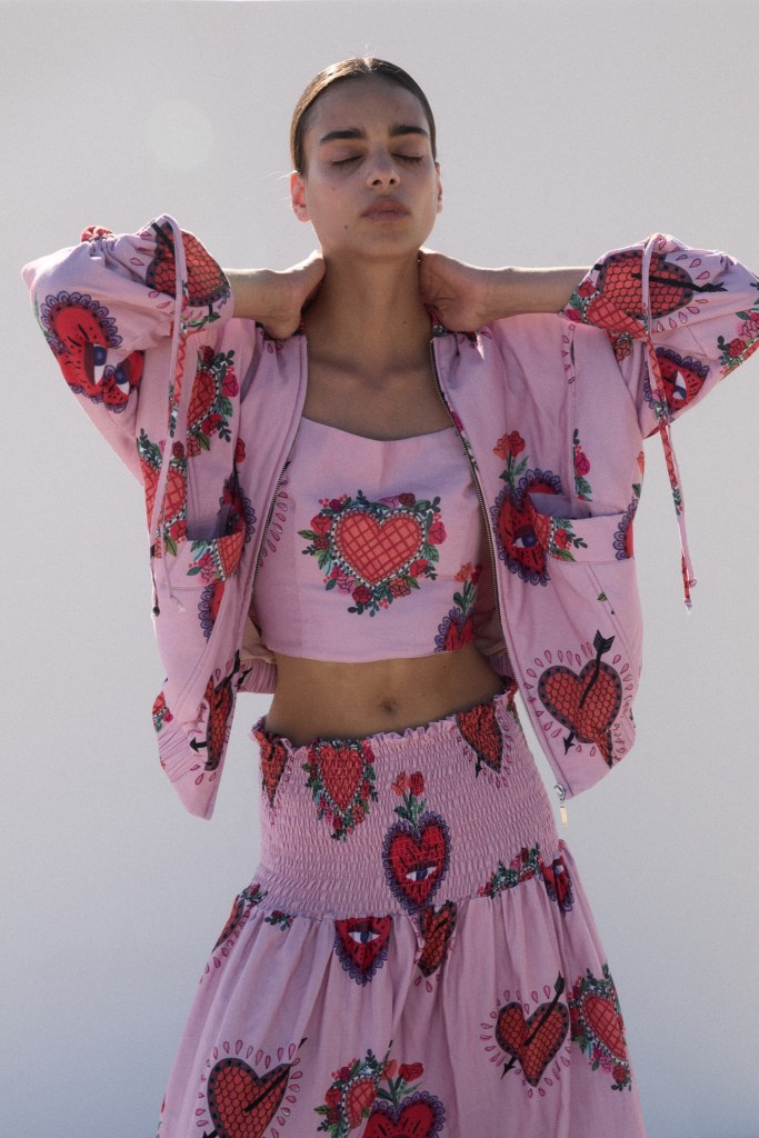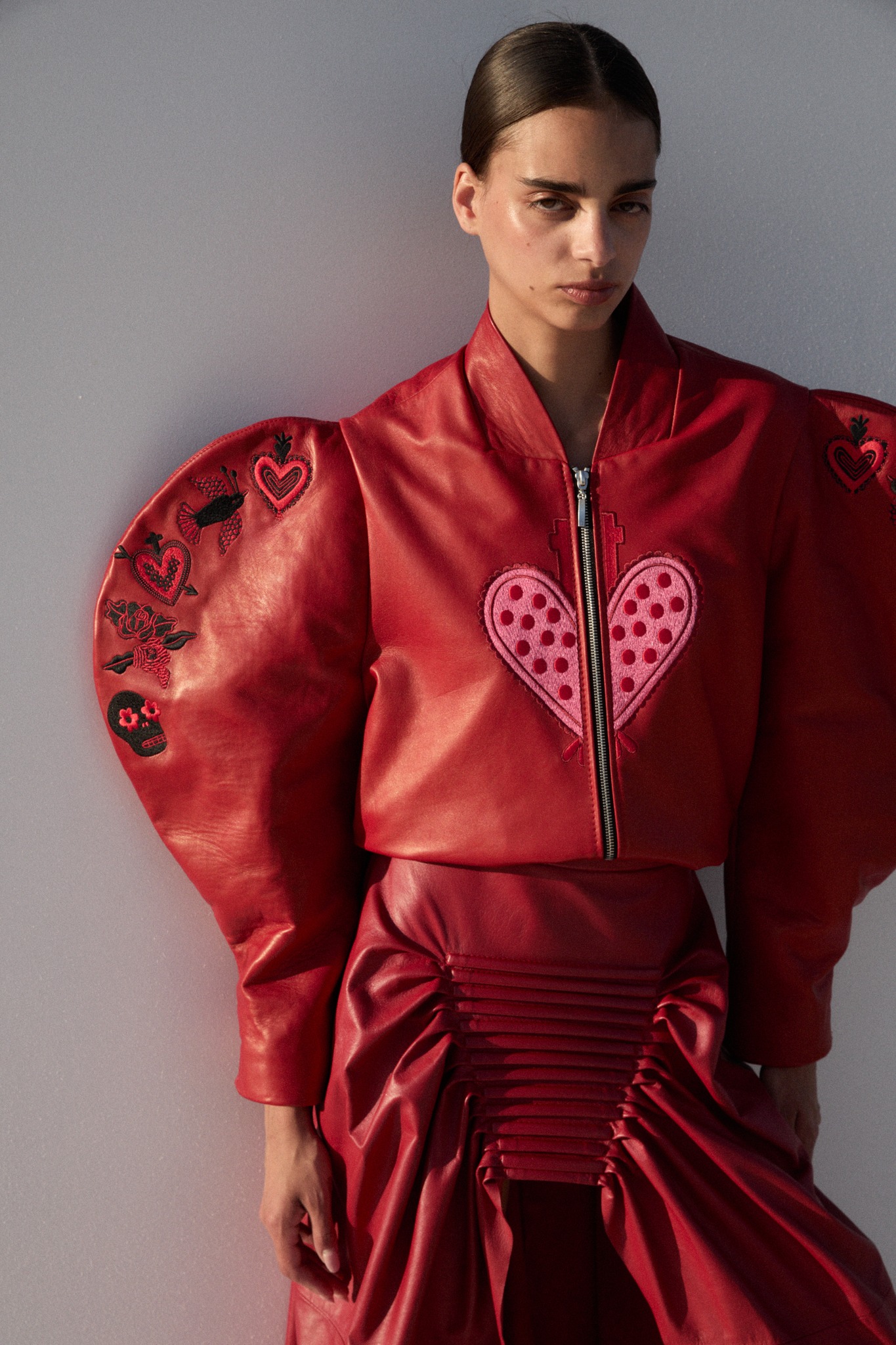 Wspomniane grafiki powstałe na bazie ręcznie wykonanych rysunków przywodzą na myśl tatuaże, czasem z lekko rozlanymi brzegami. Przedstawiają one serca, czaszki i kwiaty, symbole blisko związane z twórczością Fridy Kahlo. Motyw serca został powtórzony podwójnie na skórzanej kurtce w kolorze ciepłej czerwieni – raz w formie haftu na plecach, drugi – w imponującej, geometrycznej konstrukcji rękawa. To z pewnością najbardziej efektowny i unikalny element całej kolekcji.