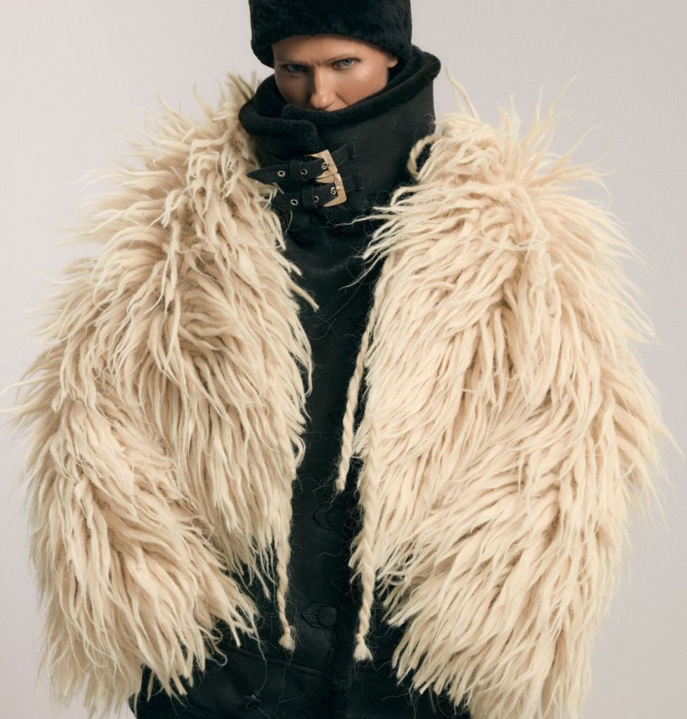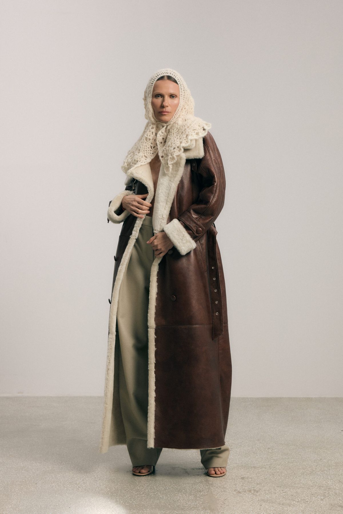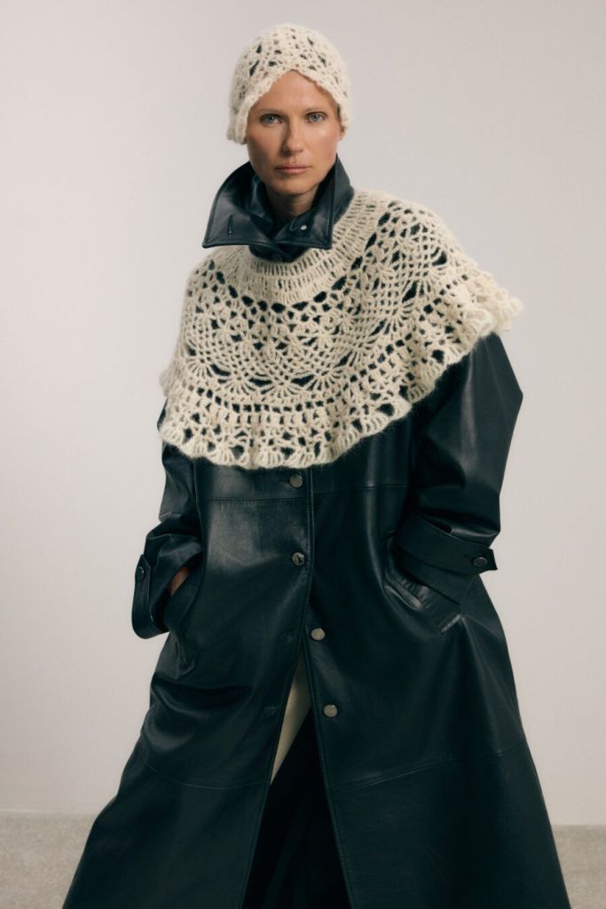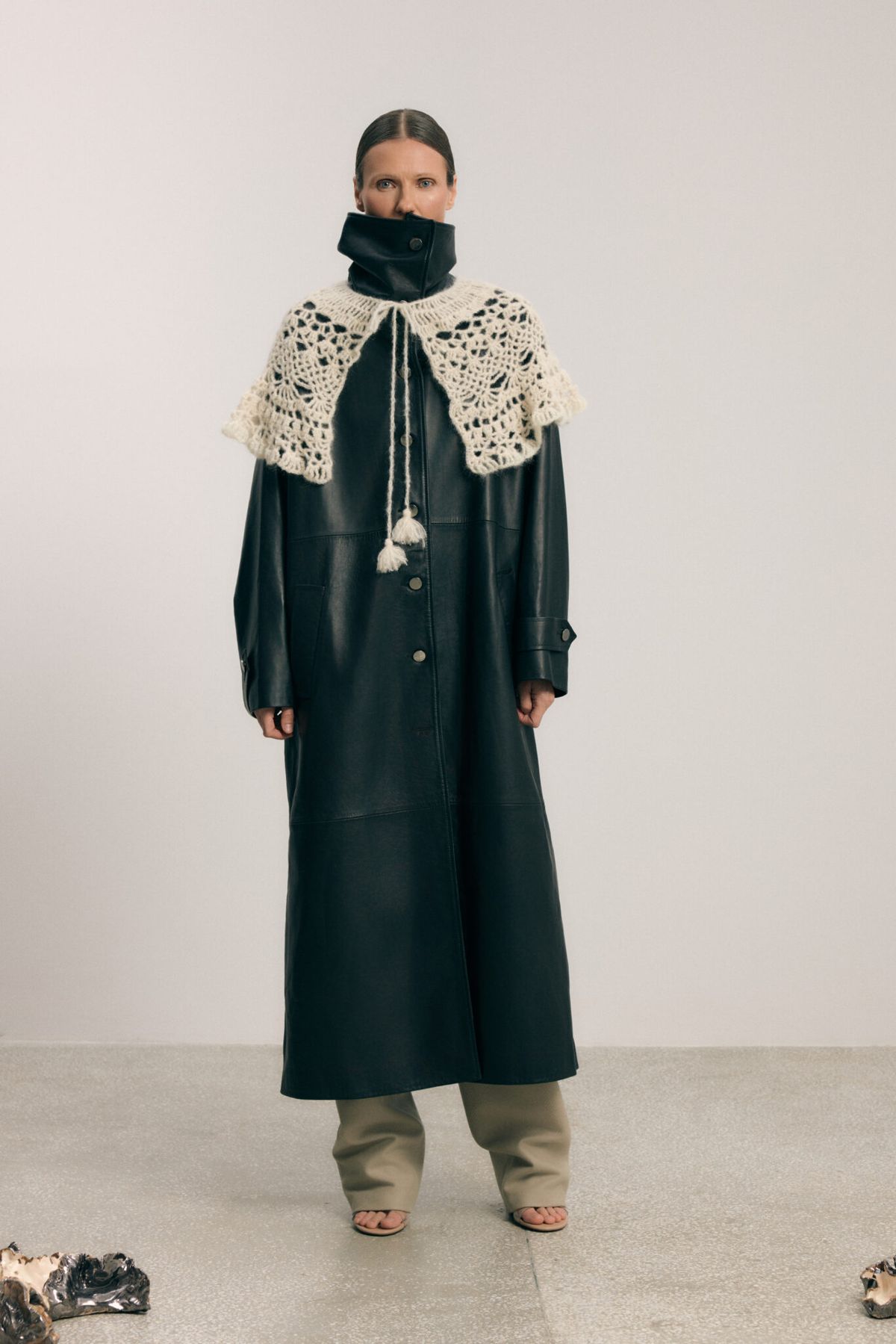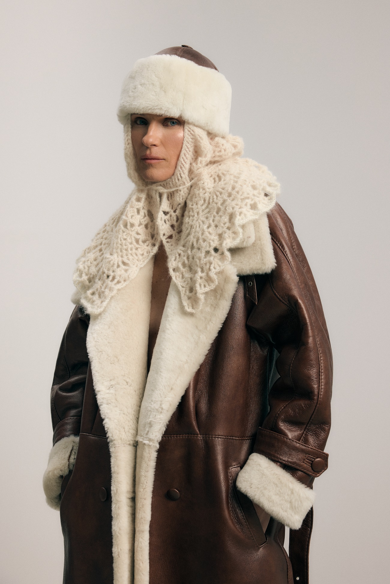 Kolekcję uzupełniają doskonale skrojone wełniane garnitury, minimalistyczne płaszcze, pelerynki, a także kożuchy w wielu różnych wariantach – od krótkich, sięgających talii, aż po długie, do kostek. W tym sezonie Karen Arcanjo rozwinęła również ofertę akcesoriów, w której znalazły się tradycyjne czapki i rękawiczki z kożucha, a także szydełkowe nakrycia głowy. Surowość skór i kożuchów doskonale przełamują miękkie, sensualne, otulające ciało niczym mgiełka dzianiny, a kolorystyka oparta na naturalnych odcieniach beżów, szarości i brązów spięta klamrą czerni tworzy harmonijną, inspirującą całość.
