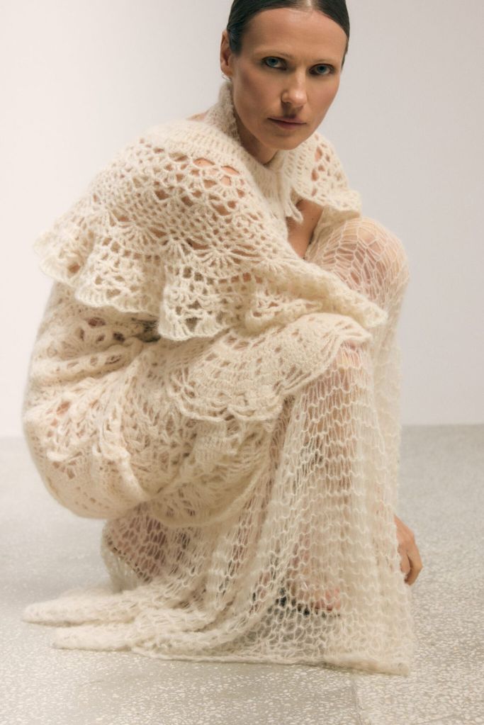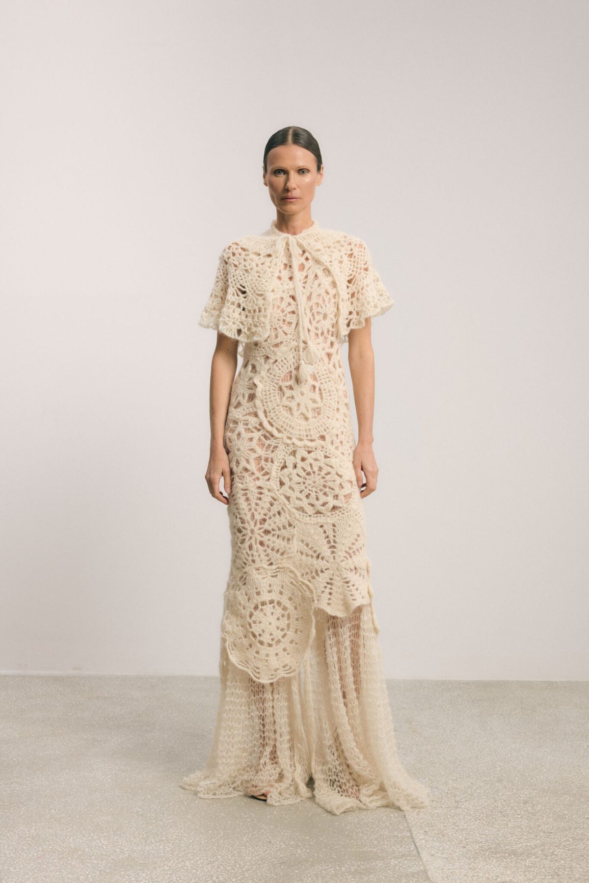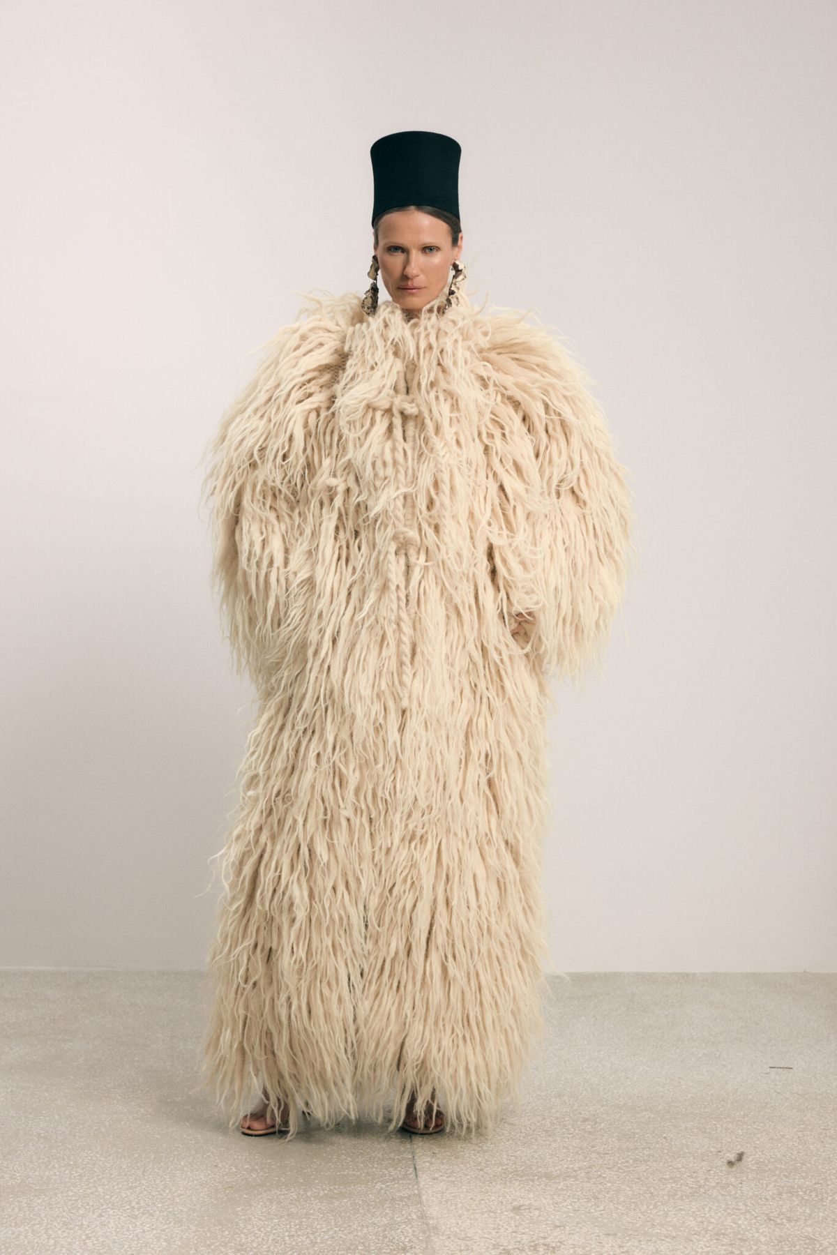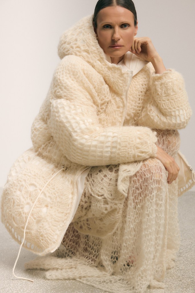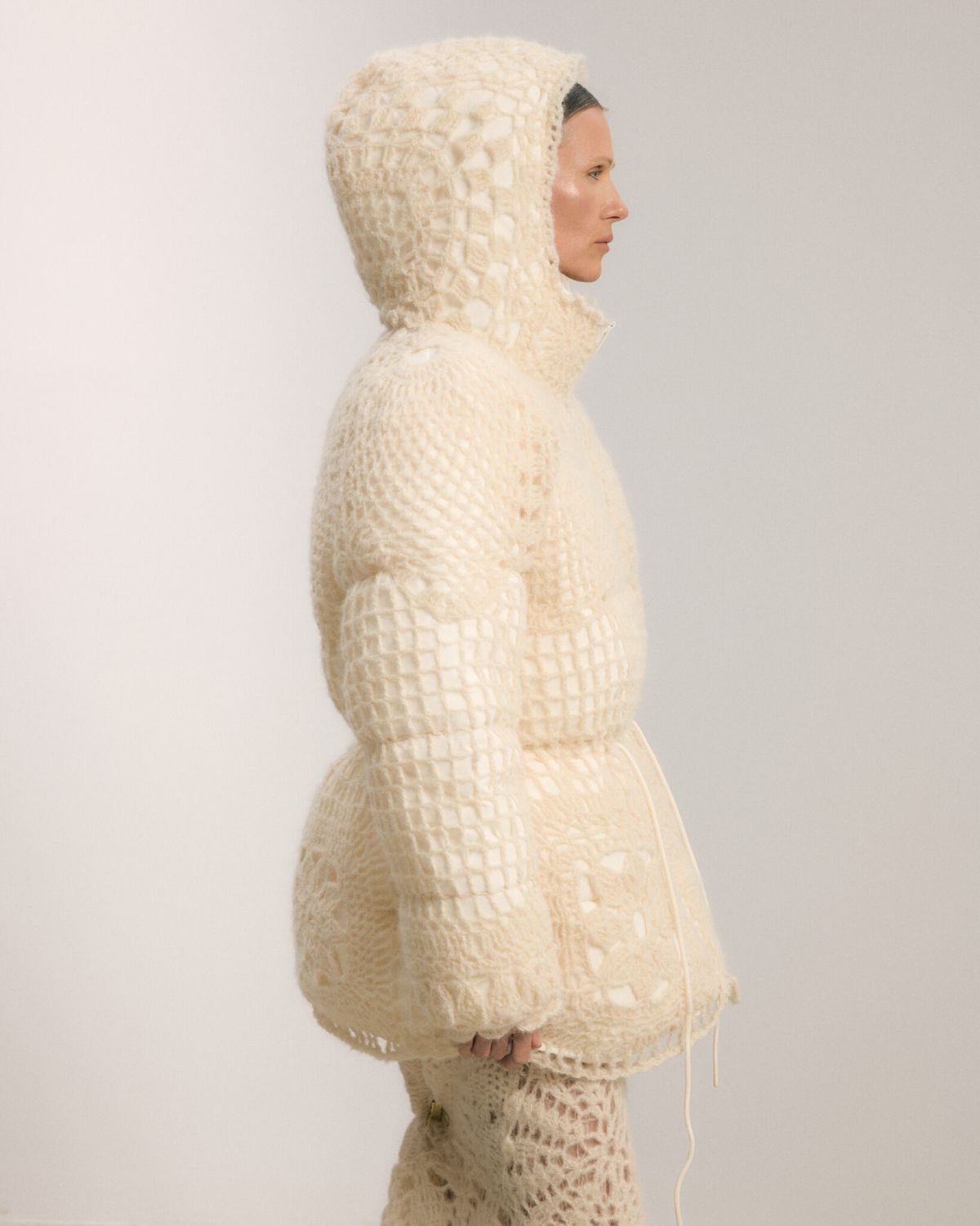 Ręcznie dziergana na drutach sukienka z przędzy z jedwabiu i alpaki przypominająca połączone ze sobą koronkowe serwety powstaje przez ponad miesiąc. Podobnie puchowa kurtka z przeskalowanymi ramionami, której wierzchnią warstwę stanowi ta sama przędza, tym razem wykonana na szydełku. Kolejny unikalny projekt znajdujący się w tej kolekcji to imponujące kremowe futro, które w rzeczywistości nie jest futrem – ono również powstało z owczej wełny, która odpowiednio przetworzona, świetnie imituje długie włosie.