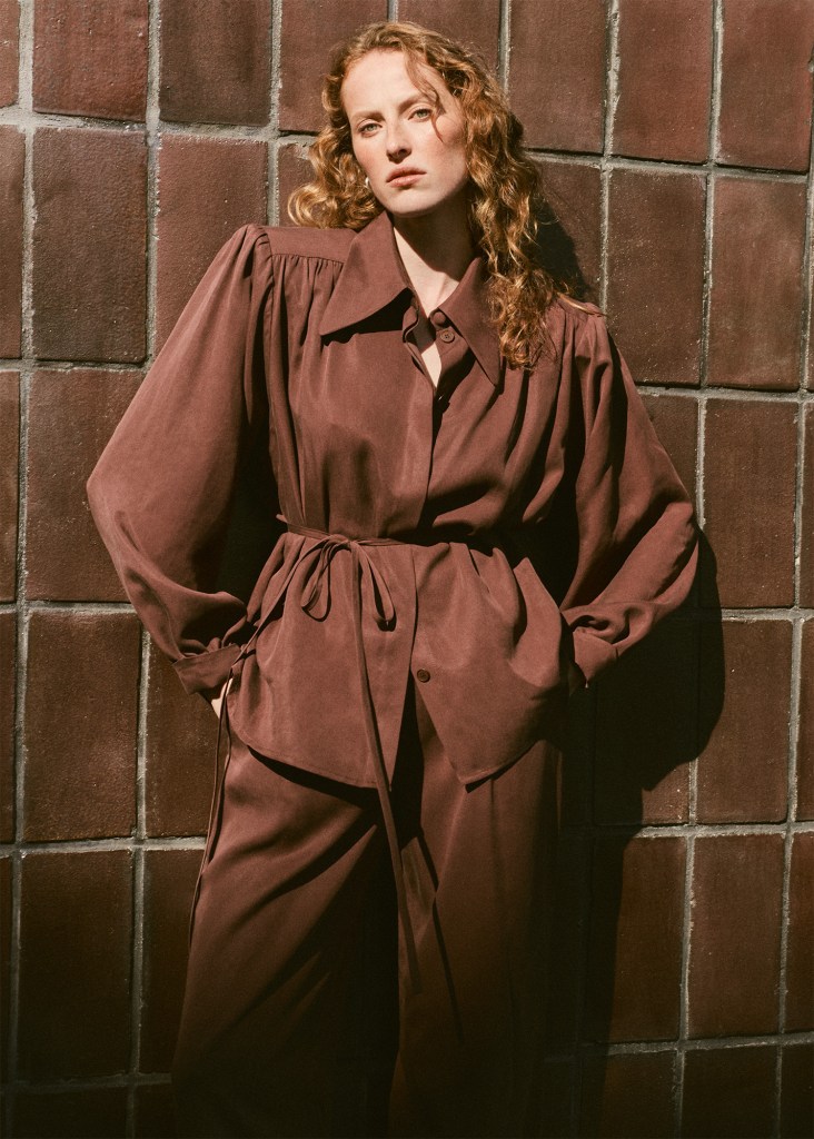 W centrum jesienno-zimowej kolekcji NAJI znajduje się koszula inspirowana marynarką, która zestawiona z prążkowanymi spodniami tworzy elegancki, garniturowy komplet. Odpinane poduszki i wiązanie w talii pozwalają na nadanie koszuli mocniejszego charakteru w stylu power dressing lub noszenie jej w luźniejszym wydaniu. W tym sezonie powraca także koszula Matcha w nowych odsłonach kolorystycznych: brązie, czerni i bieli. Poduszki wzmacniające ramiona i odpinany choker, który można zawiązać na szyi, pod kołnierzykiem lub w talii sprawiają, że jest to jeden z najbardziej wielofunkcyjnych projektów marki.