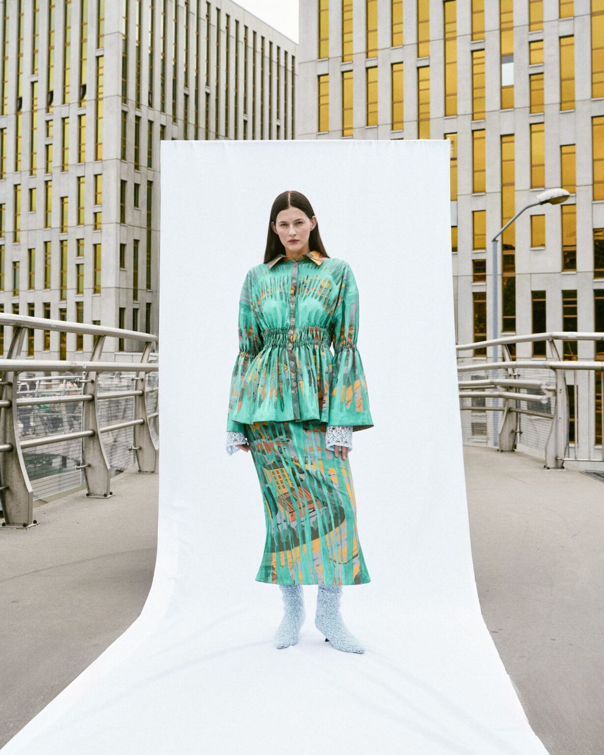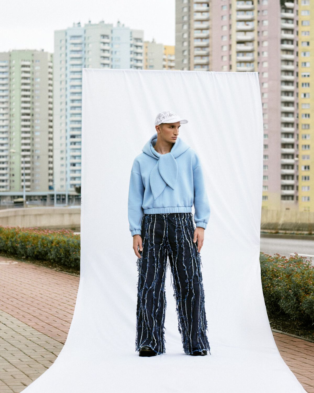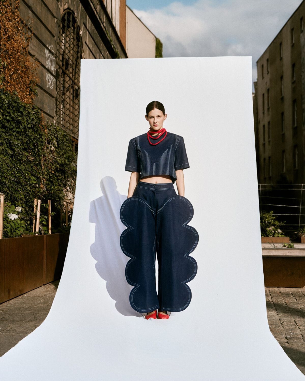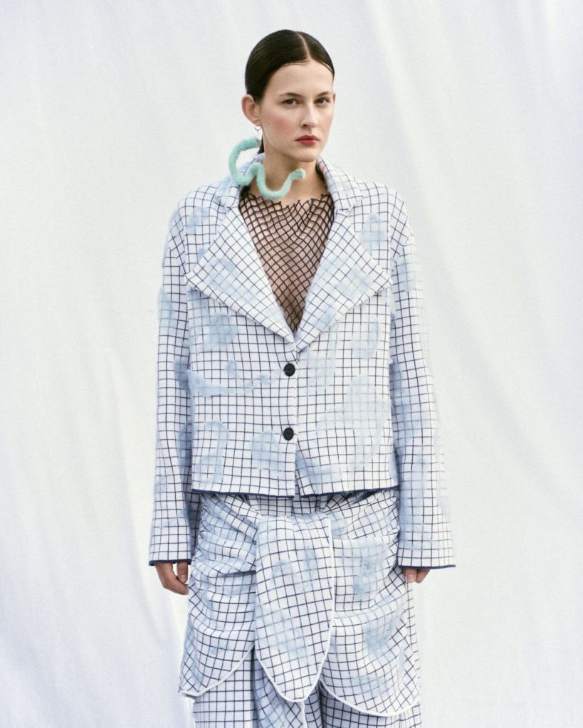 W kolekcji „Echoes” Maja Pilarek podejmuje próbę odczarowania rodzinnego Śląska i ciążących na nim stereotypów. Autorskie dzianiny, denim i elementy robione na szydełku przybierają formy i kolory nawiązujące do lokalnej architektury oraz surowego, industrialnego krajobrazu.