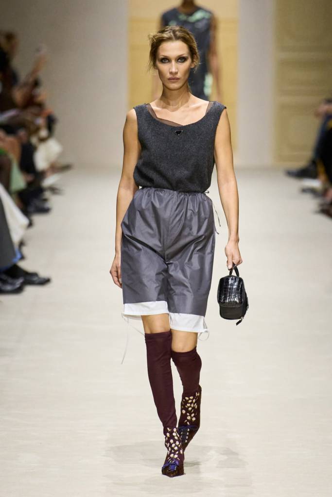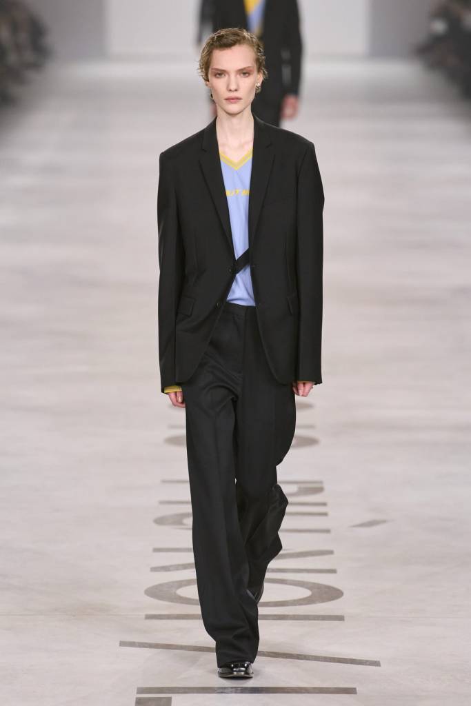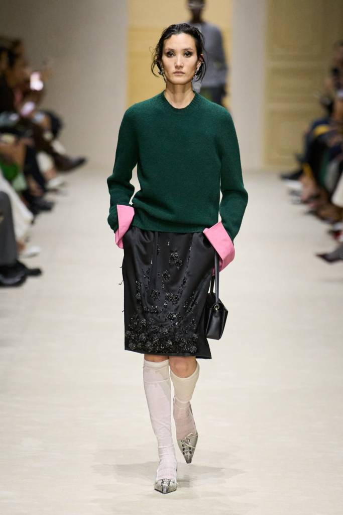 Miuccia Prada i Raf Simons postawili w tym sezonie na nieszablonową choreografię, która stała się kluczem do zrozumienia kolekcji. Zamiast tradycyjnego korowodu sylwetek, na wybiegu zobaczyliśmy zaledwie piętnaście modelek. Z każdym kolejnym wyjściem zdejmowały one z siebie jedną warstwę, prezentując aż cztery warianty tej samej stylizacji. Ten performatywny zabieg był wirtuozerskim pokazem sztuki budowania warstw i tworzenia funkcjonalnych, choć pozornie trudnych do noszenia ubrań. Duet ponownie zaskoczył nieoczekiwanymi połączeniami technicznych, sportowych tkanin z delikatnymi jedwabiami i kotnrastowymi fakturami.