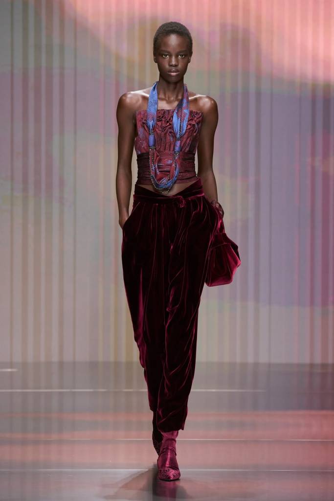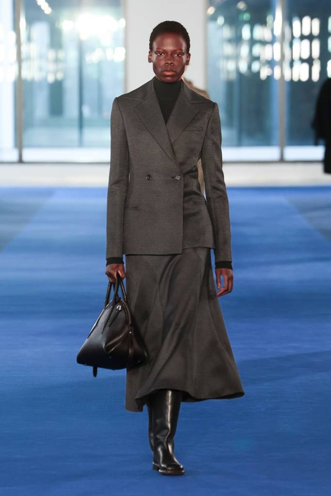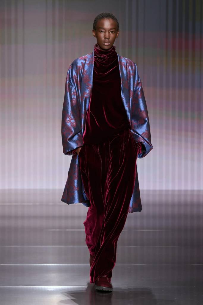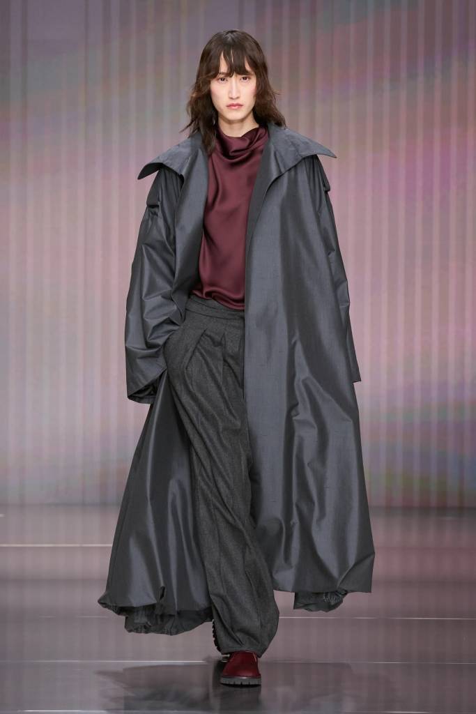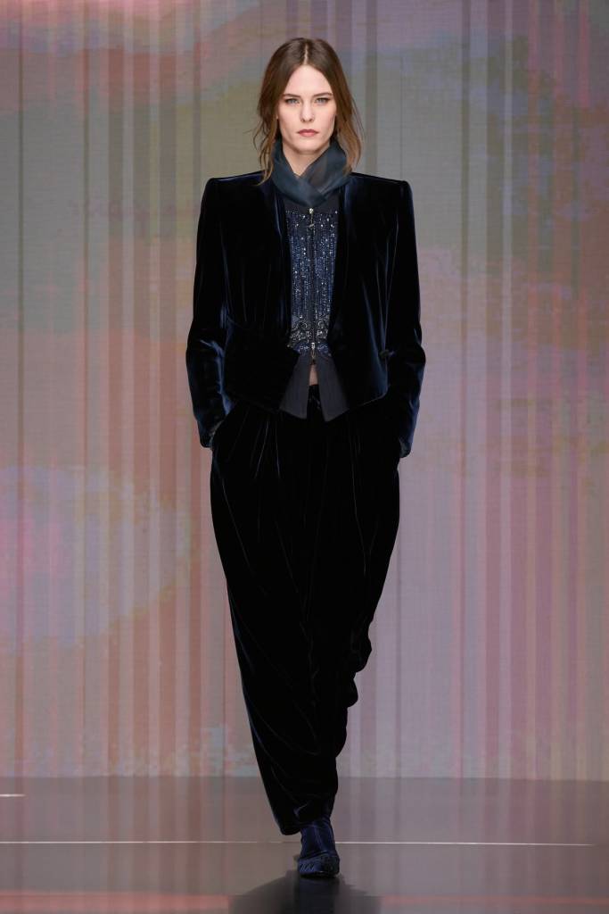 Debiutancka kolekcja Silvany Armani to ukłon w stronę ponadczasowej elegancji i dyskretnego luksusu – fundamentów, na których Giorgio Armani zbudował swoje imperium. W sylwetkach odnajdujemy DNA marki: miękkie, pozbawione usztywnień marynarki, lejące spodnie o swobodnym kroju oraz otulające okrycia wykonane z najszlachetniejszych kaszmirów, aksamitów i jedwabi. Nowa dyrektor kreatywna nasyca tę estetykę kobiecą perspektywą, czyniąc to jednak z niezwykłym wyczuciem. Tak subtelna, niemal nieuchwytna ewolucja nie zaskakuje – Silvana, przez lata będąc prawą ręką wuja, współtworzyła historię domu mody niemal od jego początków, co dziś gwarantuje marce stabilną przyszłość bez utraty jej tożsamości.