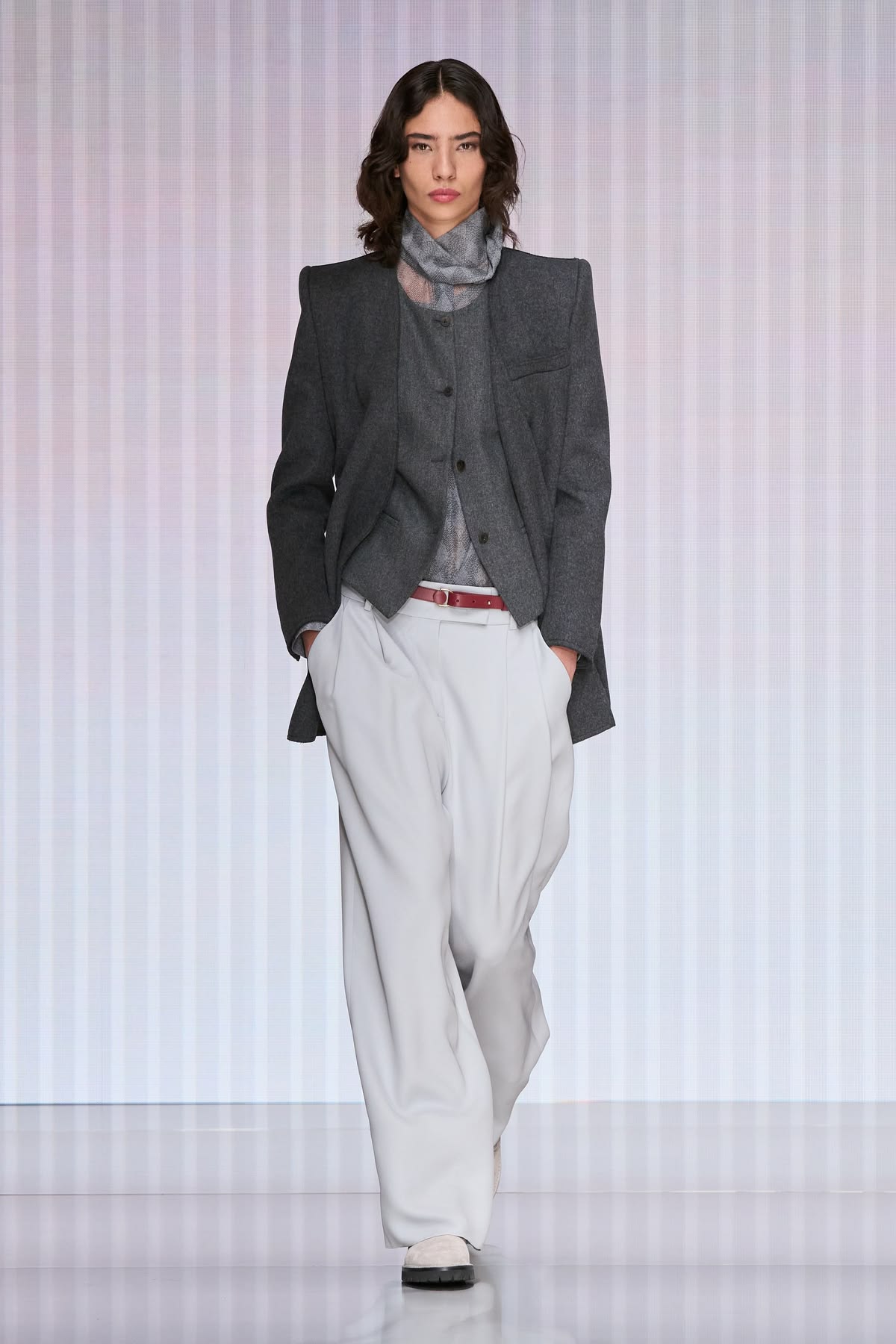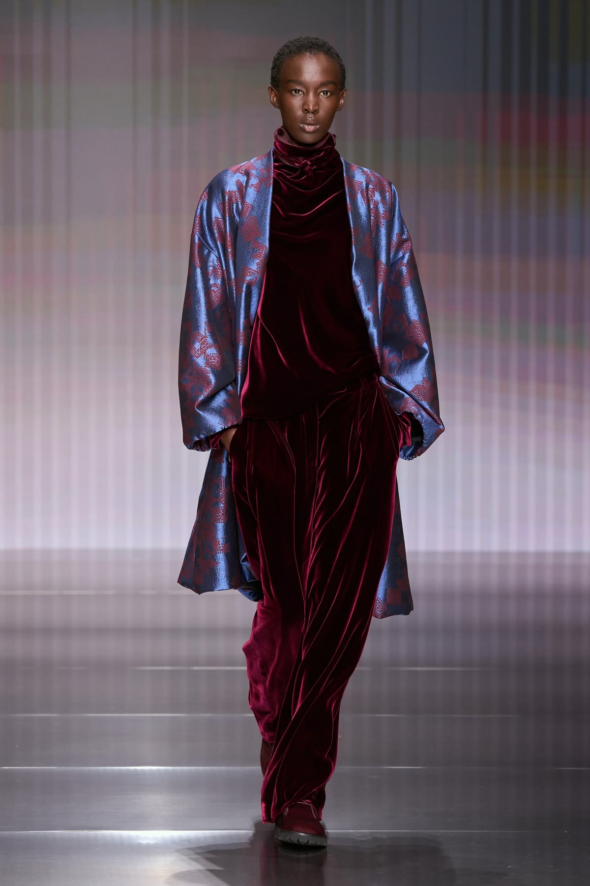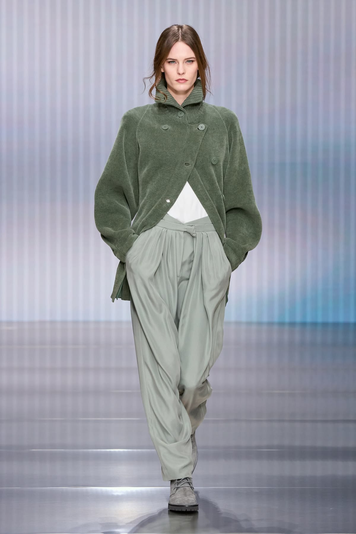 Debiutancka kolekcja Silvany Armani to ukłon w stronę ponadczasowej elegancji i dyskretnego luksusu – fundamentów, na których Giorgio Armani zbudował swoje imperium. W sylwetkach odnajdujemy DNA marki: miękkie, pozbawione usztywnień marynarki, lejące spodnie o swobodnym kroju oraz otulające okrycia wykonane z najszlachetniejszych kaszmirów, aksamitów i jedwabi. Nowa dyrektor kreatywna nasyca tę estetykę kobiecą perspektywą, czyniąc to jednak z niezwykłym wyczuciem. Tak subtelna, niemal nieuchwytna ewolucja nie zaskakuje – Silvana, przez lata będąc prawą ręką wuja, współtworzyła historię domu mody niemal od jego początków, co dziś gwarantuje marce stabilną przyszłość bez utraty jej tożsamości.