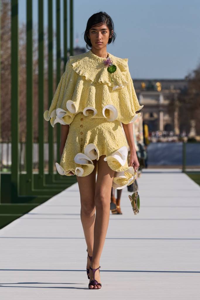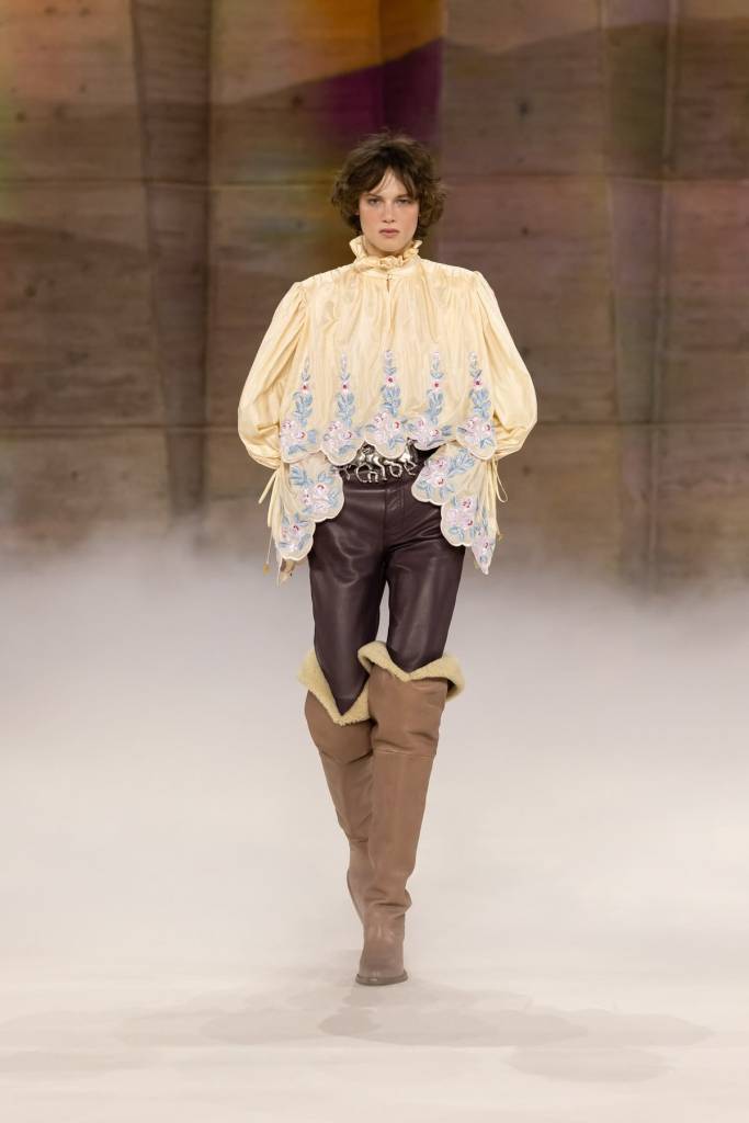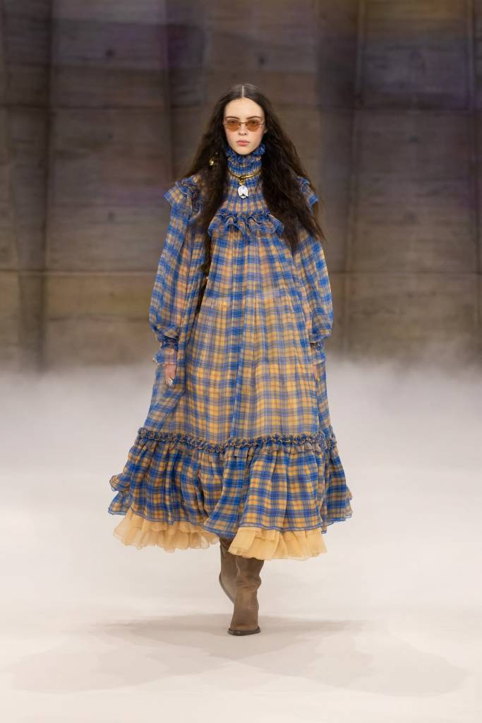 „Dziewczyna z prerii spotyka hippiskę” – to pierwsze skojarzenia, które budzą sylwetki z najnowszej kolekcji Chloé. Chemena Kamali szuka inspiracji głębiej niż tylko w nostalgii lat 70., sięgając aż do tradycyjnego holenderskiego stroju ludowego. Projektantka przekłada estetykę koronkowych czepków i kwiecistych lejbików na język współczesnej mody tworzonej przez kobietę dla kobiet. Falbaniaste spódnice, kraciaste suknie i niemal wiktoriańskie koszule o bufiastych rękawach w pastelowych odcieniach zyskują nowoczesny sznyt dzięki pelerynom, obszernym marynarkom i kozakom za kolano wykończonym kożuszkiem. To autentyczny powrót do hippisowskich ideałów wolności, radości i bliskości z naturą.