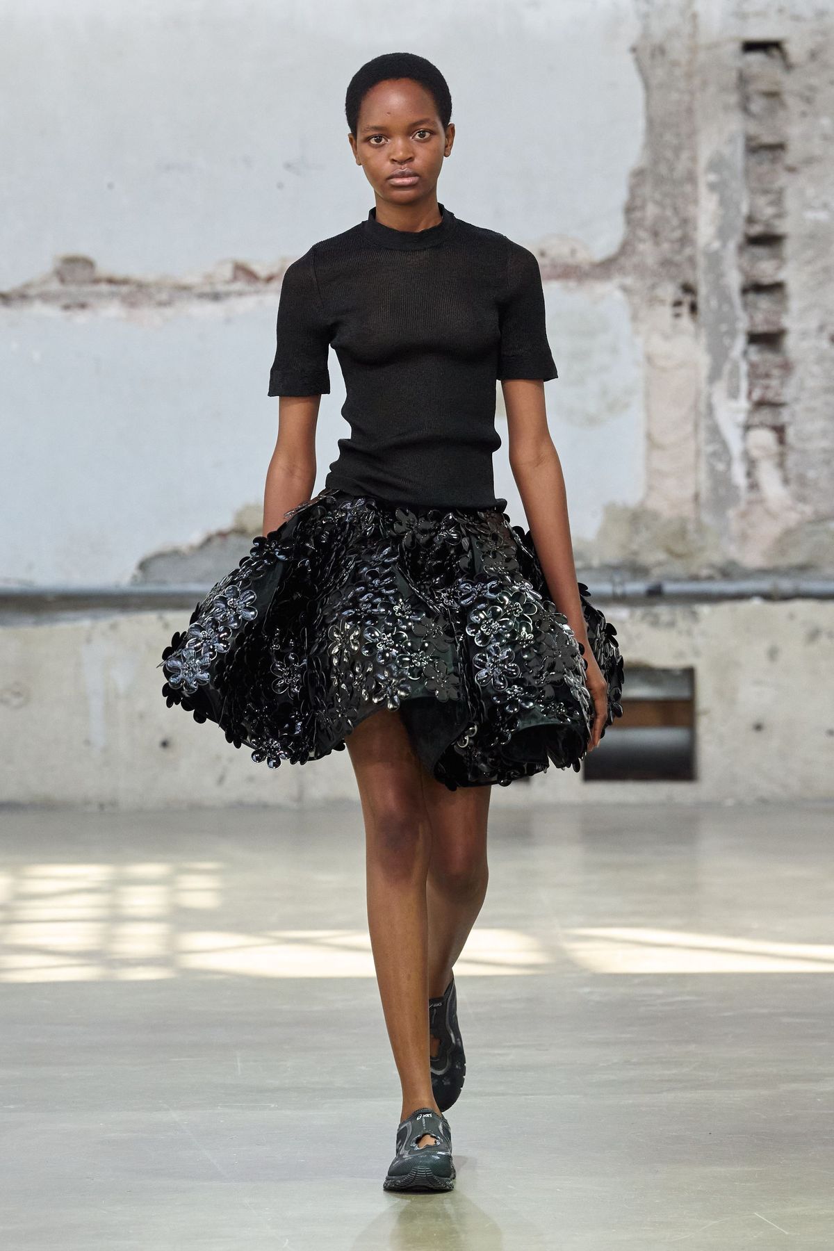 Na ogromne, spektakularne w formie spódnice postawiło wielu czołowych projektantów – widzieliśmy je między innymi u Chanel czy Balenciagi. Spódnica wyróżnia się kolorem, objętością lub wzorem, a najlepiej, gdy spełnia wszystkie te warunki. Dodatkowym atutem będą trójwymiarowe aplikacje – frędzle, pióra, kwiaty czy architektoniczne falbany. Najlepiej zrównoważyć ją minimalistyczną górą – może to być nawet zwykły biały T-shirt.