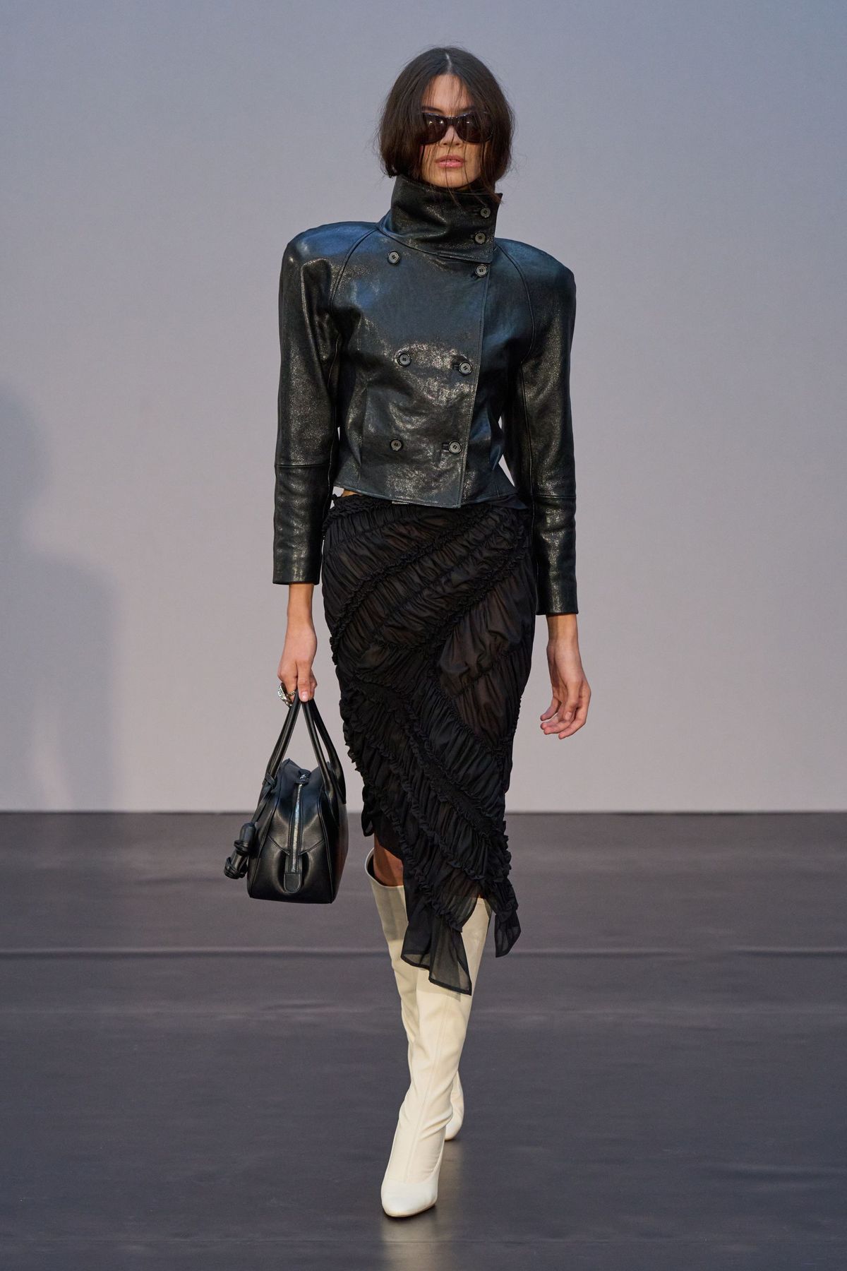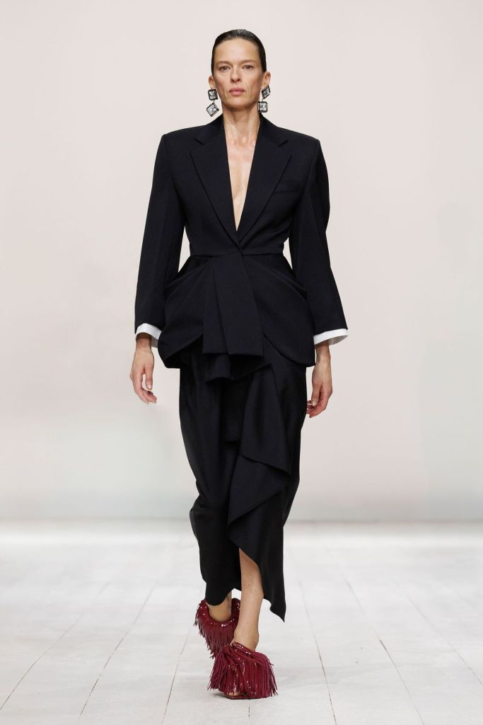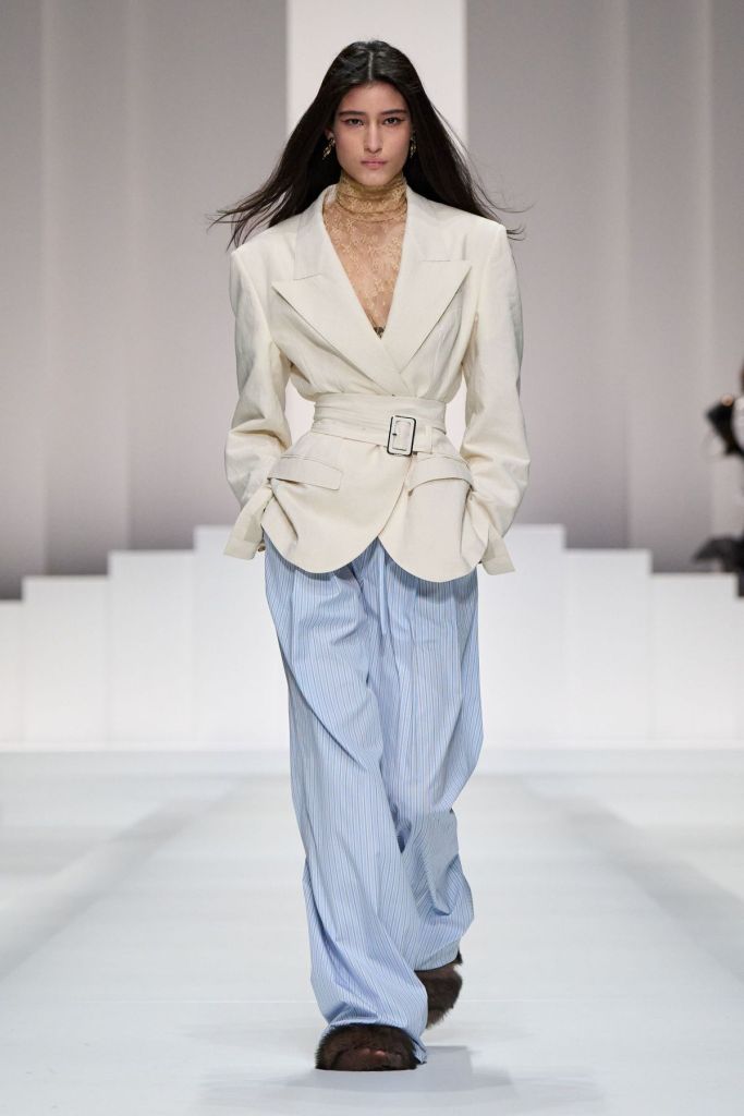 Choć nadal nie rezygnujemy z marynarek oversize, to jednak talia coraz częściej upomina się o swoje należne miejsce. Nie da się jednak nie zauważyć, że powoli zmierzamy w kierunku powrotu do lat 2000., czyli żakietów znacznie krótszych i dopasowanych niż uwielbiane przez nas od lat obszerne, niemal męskie modele. Taliowane marynarki w stylu Muglera to propozycje z rodzaju tych odważnych; samodzielnie możemy stworzyć efekt klepsydry, zakładając pasek w talii na wierzch naszej ulubionej marynarki.