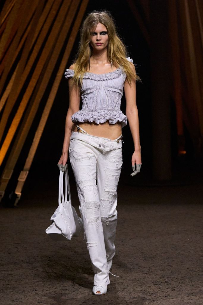 Dżinsy biodrówki z naprawdę niskim stanem to już nie tylko wspomnienie przeszłości – w uwspółcześnionej wersji noszą je największe gwiazdy, pokochało je pokolenie Z. Było więc tylko kwestią czasu, kiedy moda na obniżoną talię rozprzestrzeni się też na inne elementy garderoby. Na wybiegach wiosennych kolekcji pojawiły się garniturowe spodnie czy eleganckie, biurowe spódnice (jak u Chanel) noszone luźno na biodrach. W takim wydaniu wygląda to o wiele dojrzalej i już nie tak kontrowersyjnie.